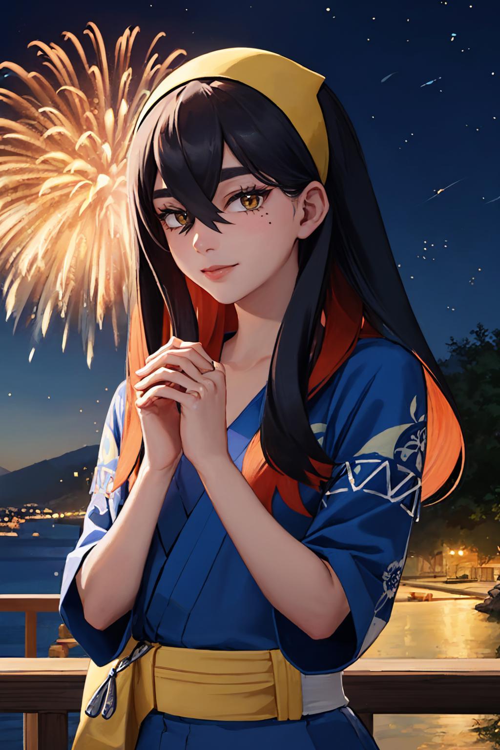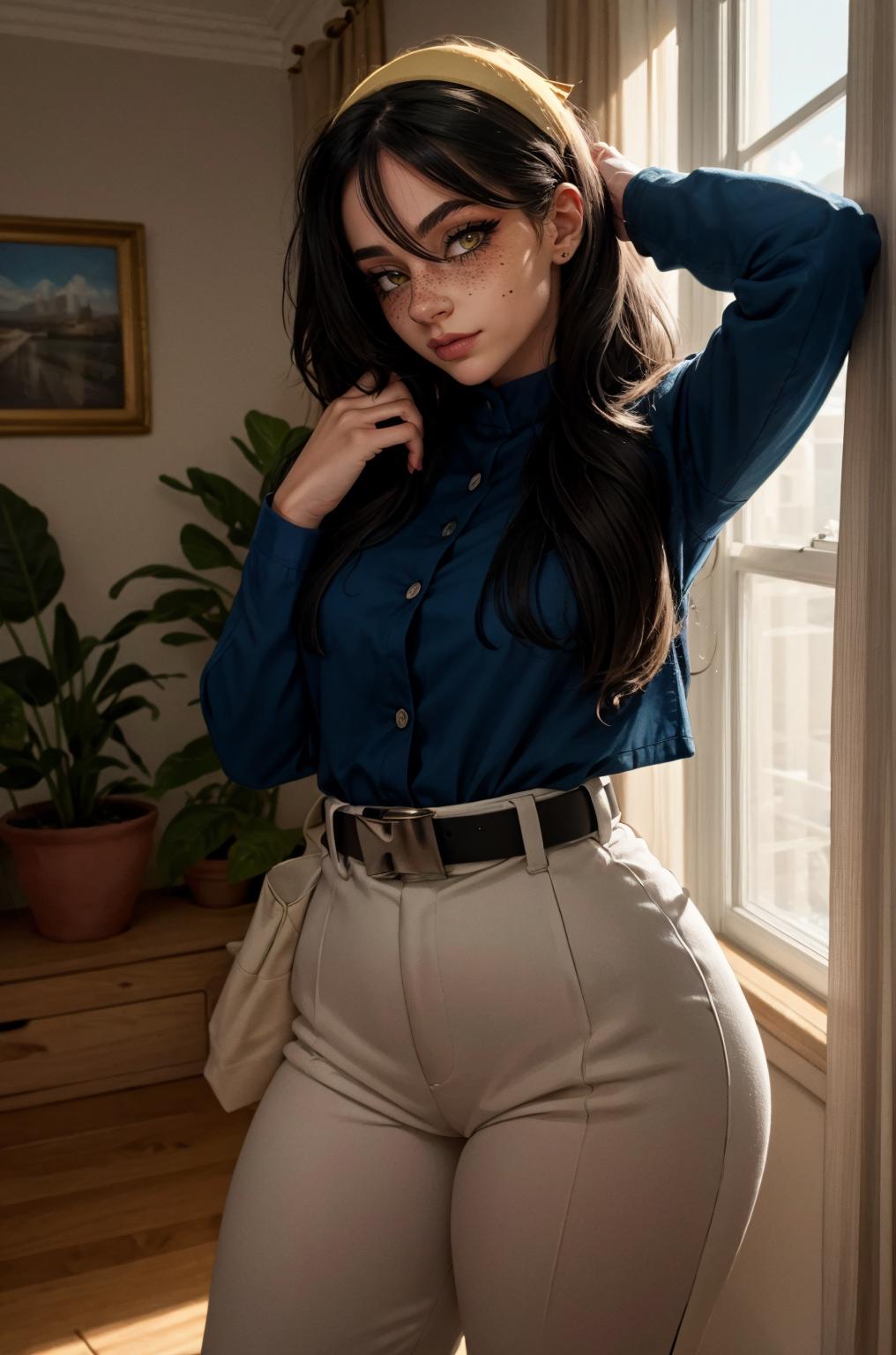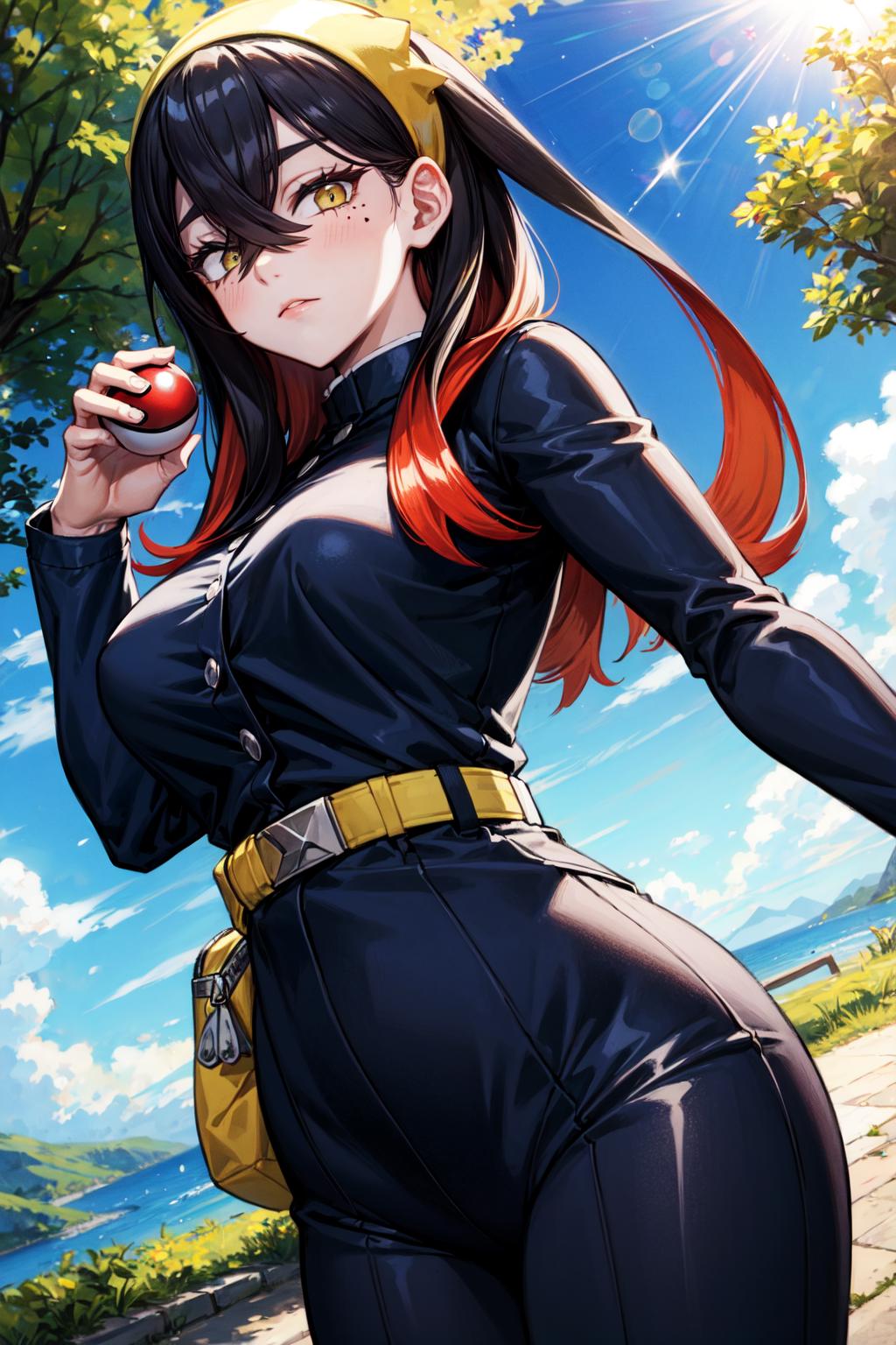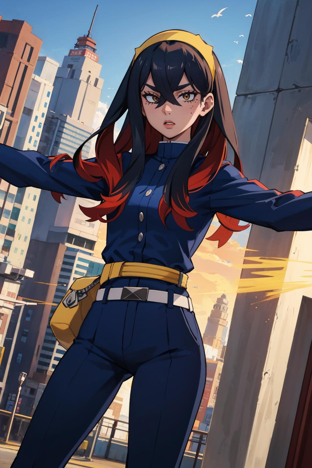 Default Outfit: hairband, blue jacket, long sleeves, red gloves, pants, belt