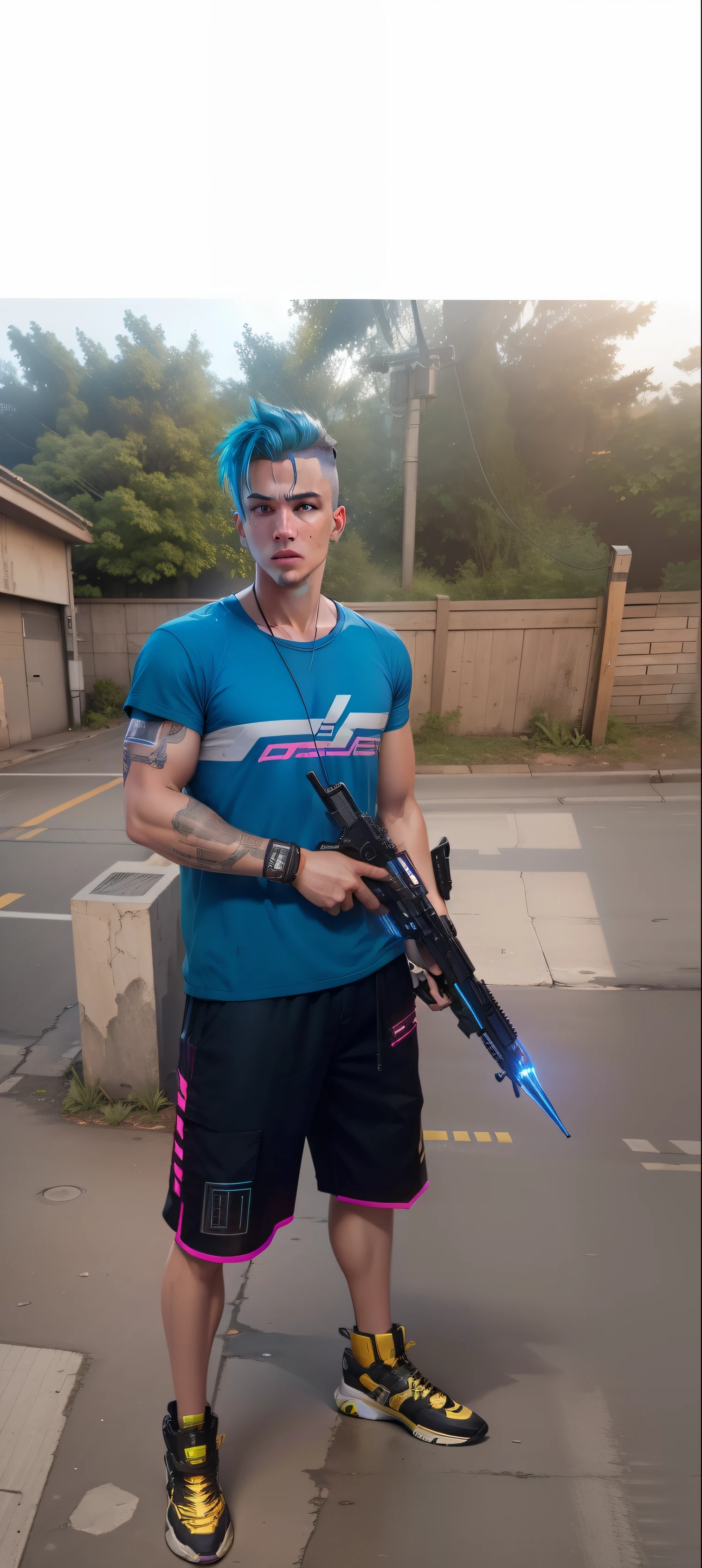Arafed man with blue hair holding a blue and black gun