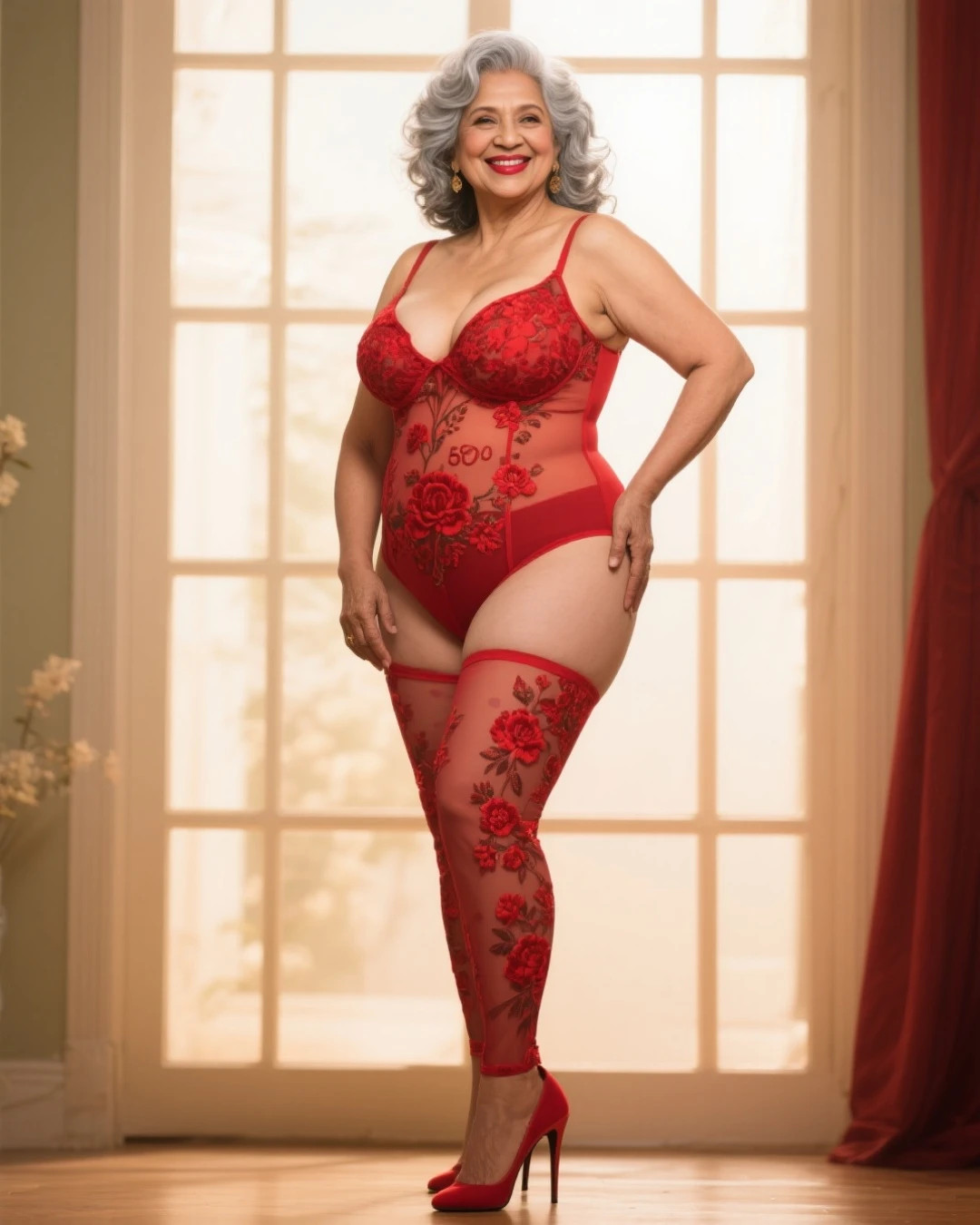 A close up of a woman in a red lingerie posing for a picture