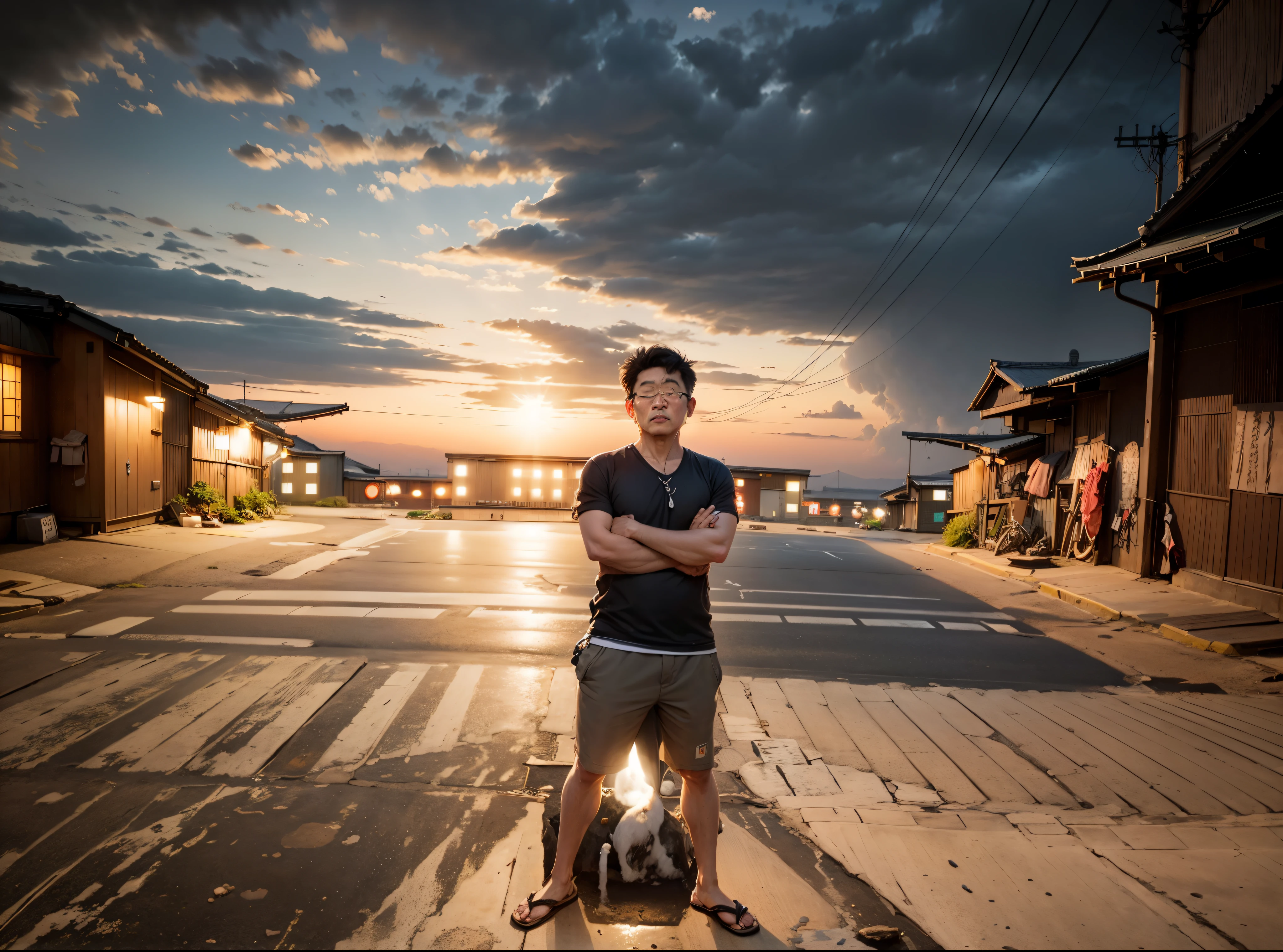 Arafed man standing on a skateboard in a street with a sunset in the background
