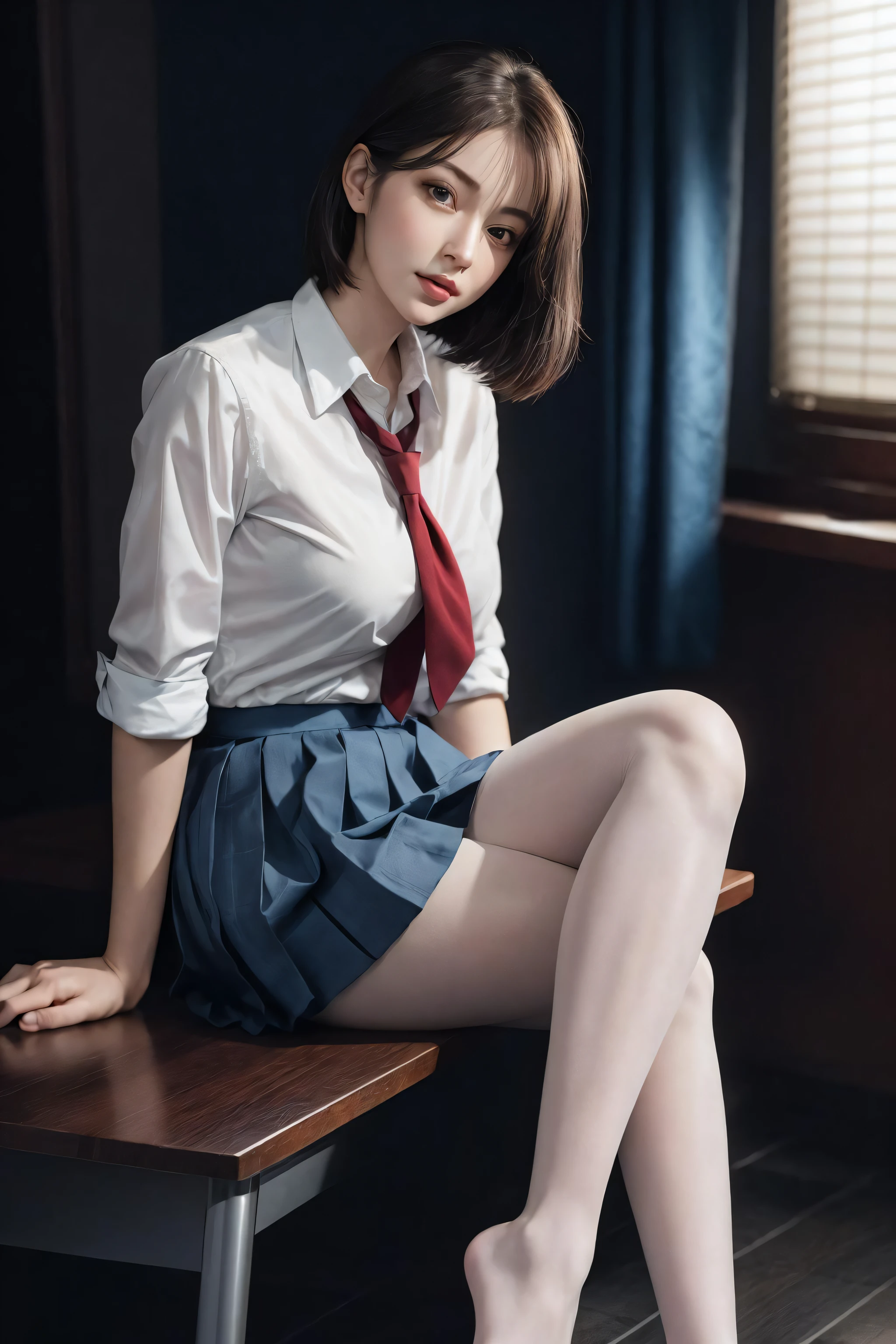 Arafed woman in a white shirt and blue skirt sitting on a table