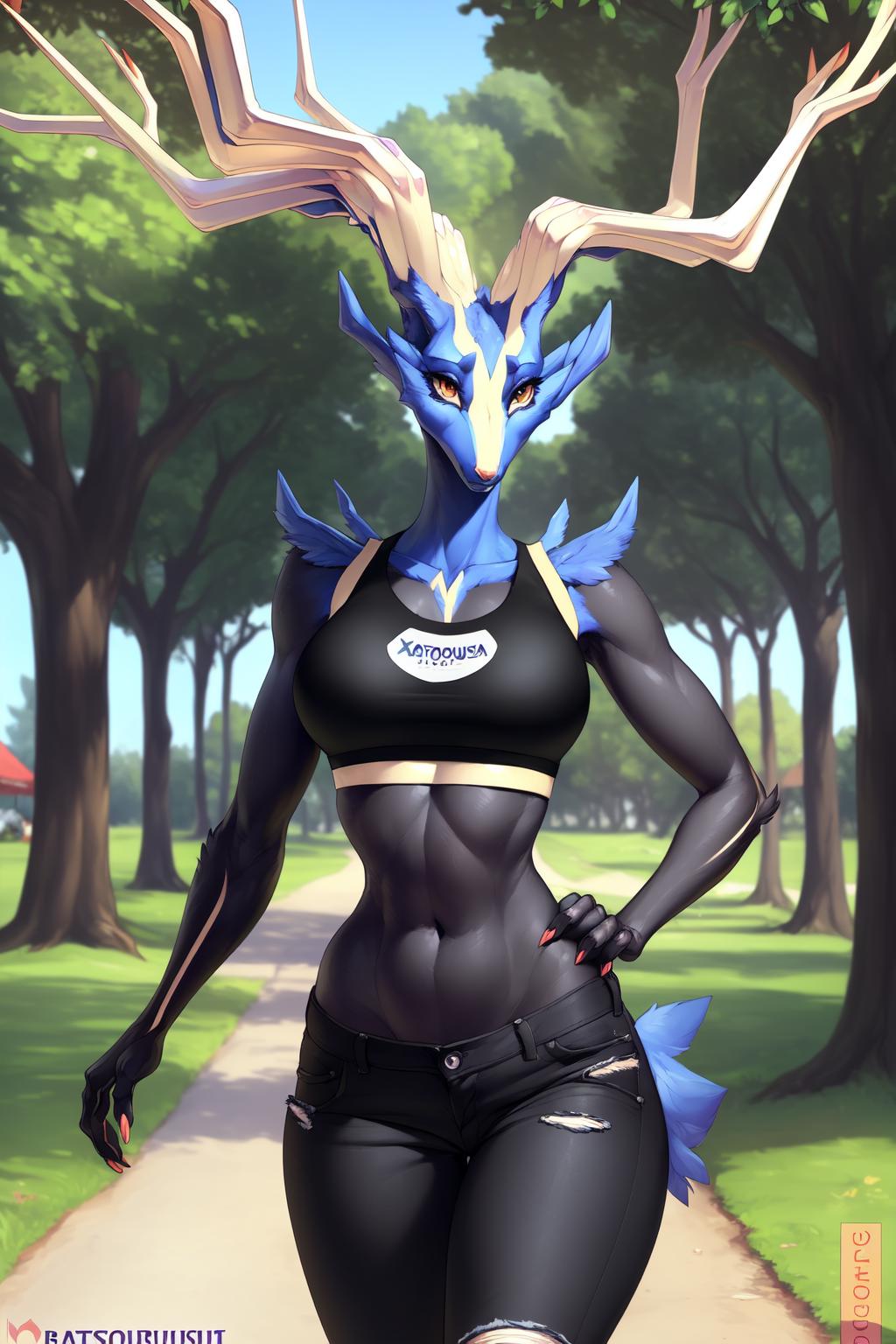 Xerneas LoRA trained on NovelAI with Kohya training scripts using the DAdaptAdam optimizer at 512x512 resolution. Horns can come out wonky a lot of the time because they have a lot of overlap with each other, which Stable Diffusion has a hard time handling. Body can come out blue, but should be black. Adding (black body) to your prompt will fix it. Depending on your base model, may require adding (hooves) to your prompt to get correct feet. Should have wide compatibility with model mixes based on NovelAI, which is most of them. Trained on an all female dataset.