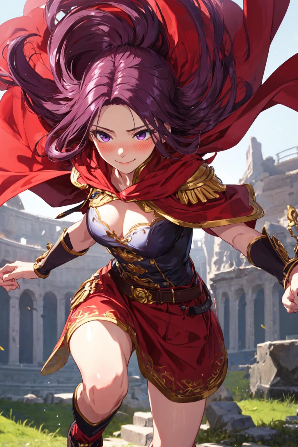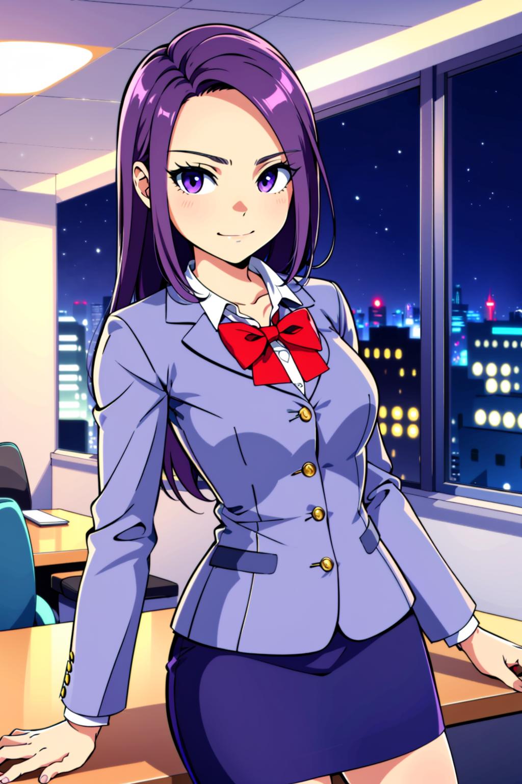 ・medium long hair, purple hair, purple eyes, argyle thighhighs,