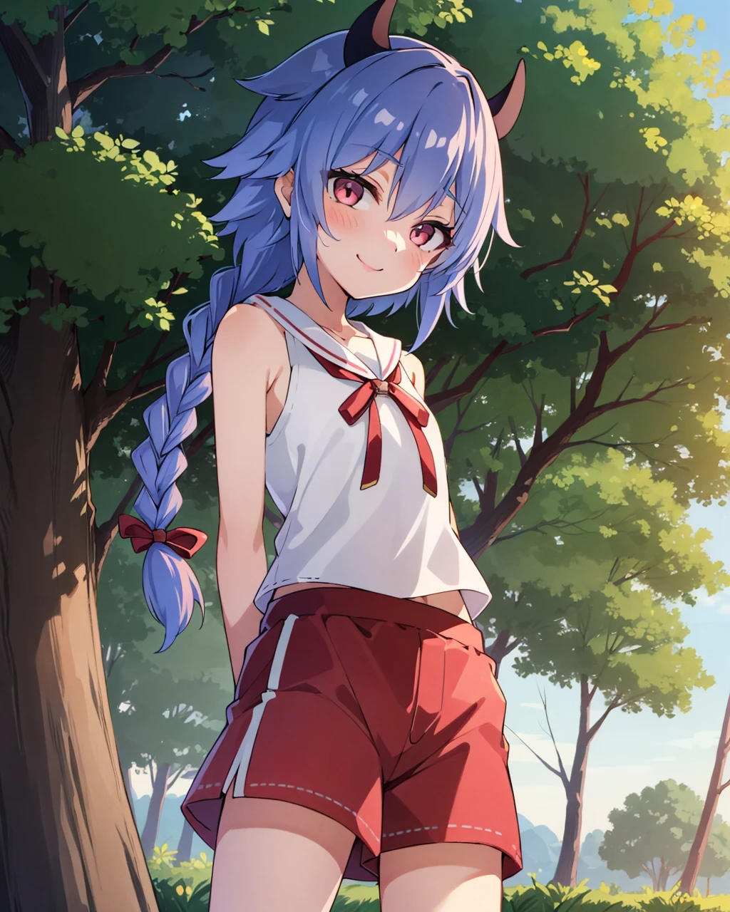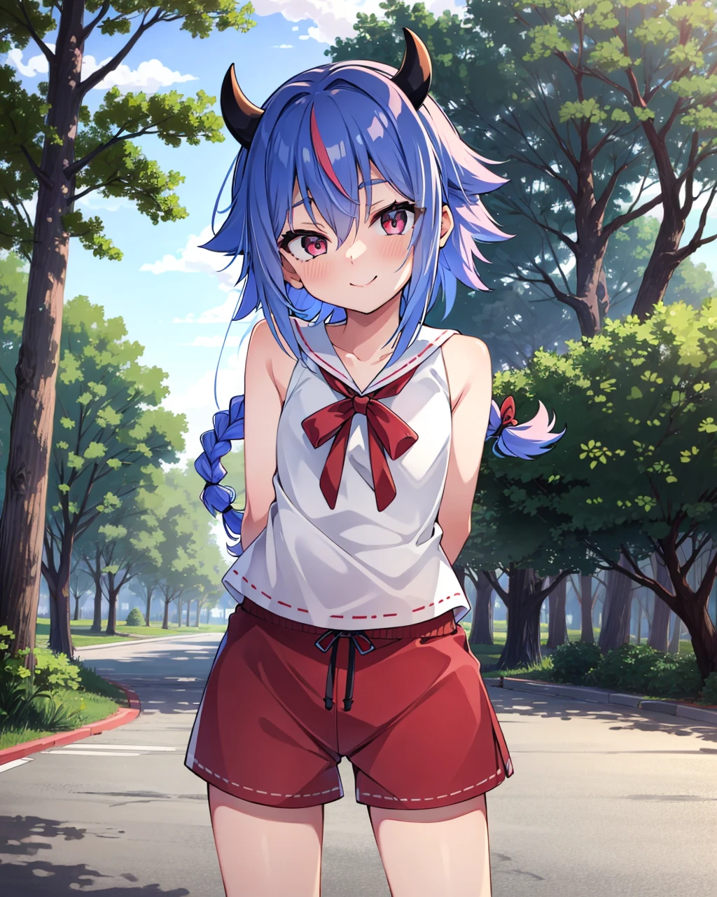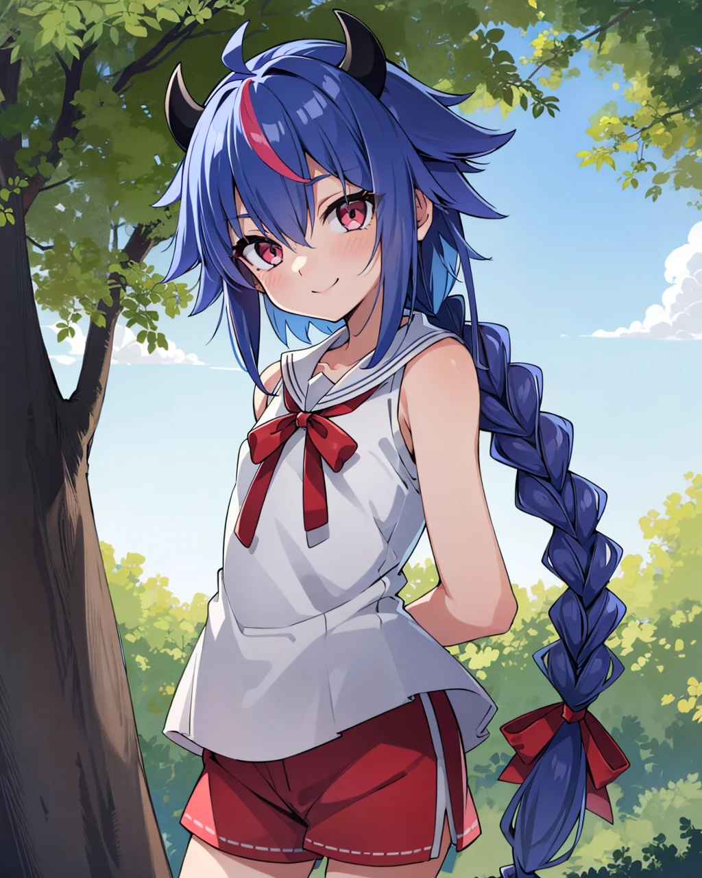 Tags: meika_mikoto, blue hair, multicolored hair, horns, pink eyes, braid