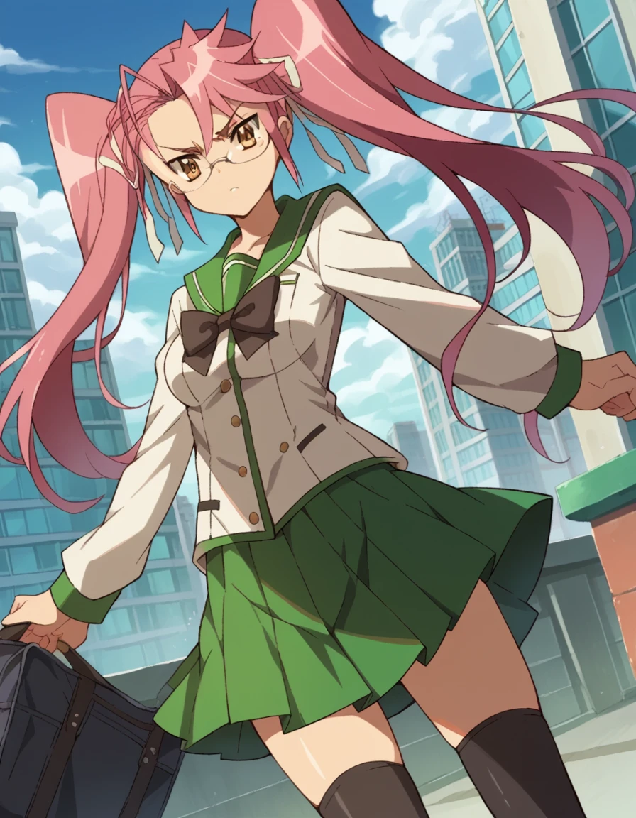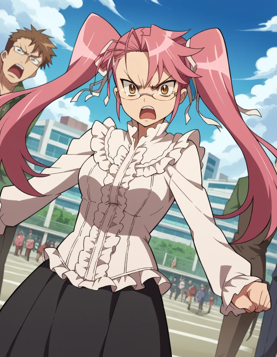 saya takagi, long hair, ribbon, twintails, brown eyes, hair ribbon, pink hair, glasses,