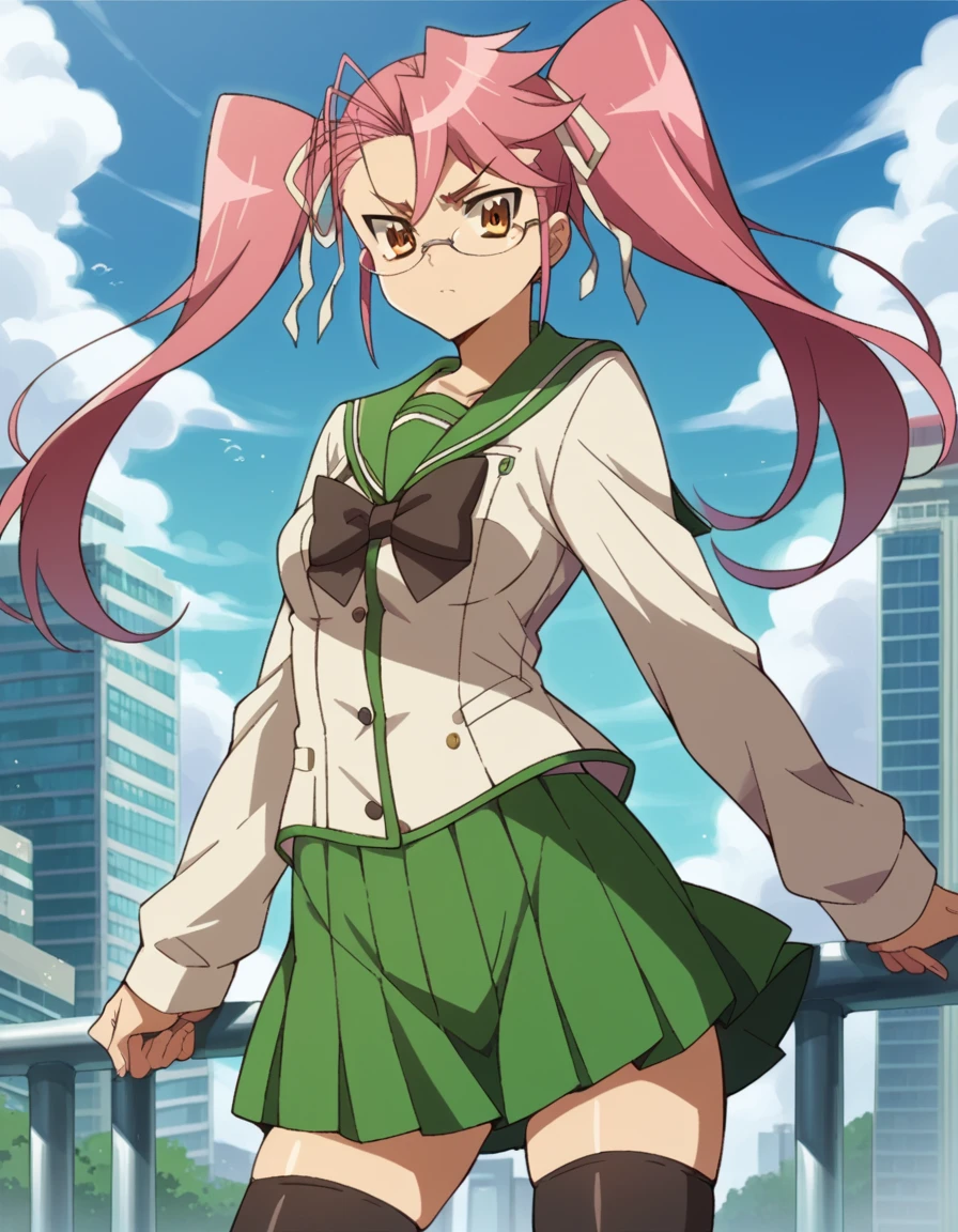 skirt, thighhighs, school uniform, serafuku, zettai ryouiki, green skirt, bowtie, long sleeves, black thighhighs, black bowtie,