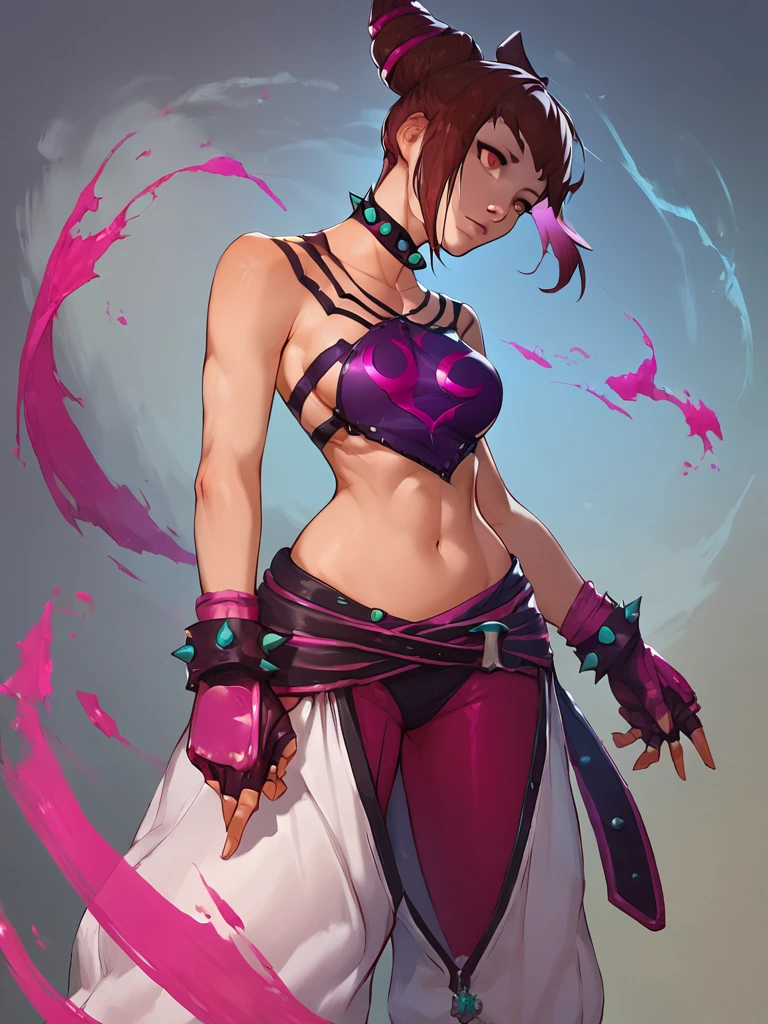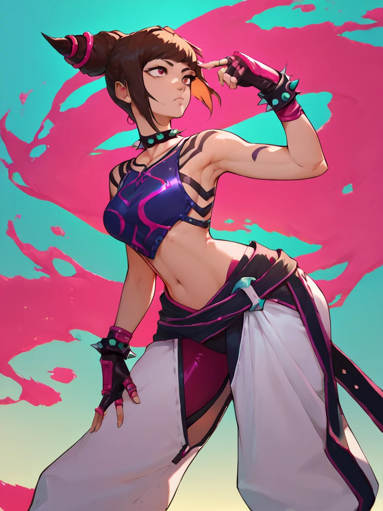 JuriMS , sfvi , multicolored hair, hair horns, baggy pants, bangs, fingerless gloves, collar, navel, toeless legwear, pants, two-tone hair, hair over one eye