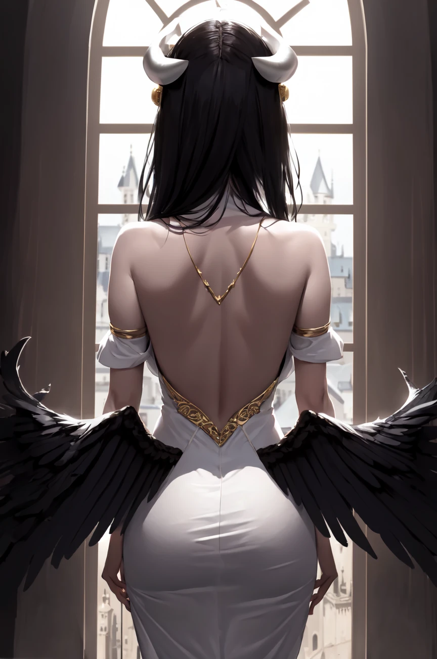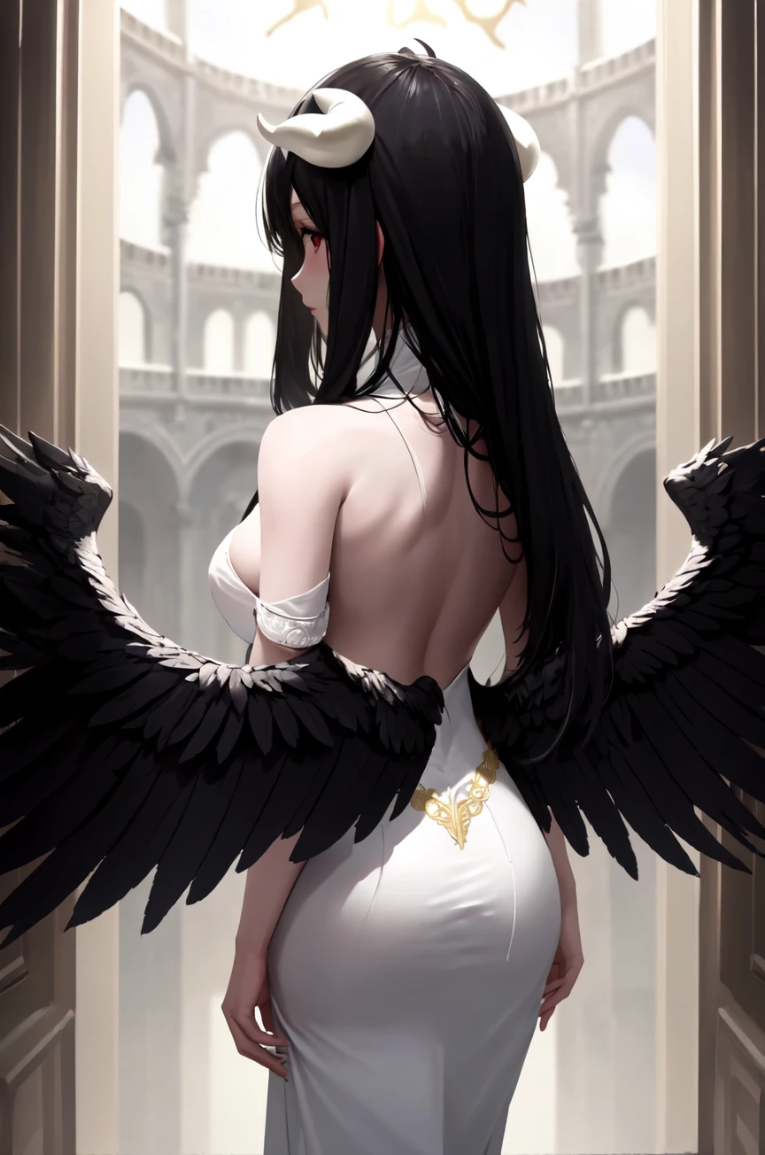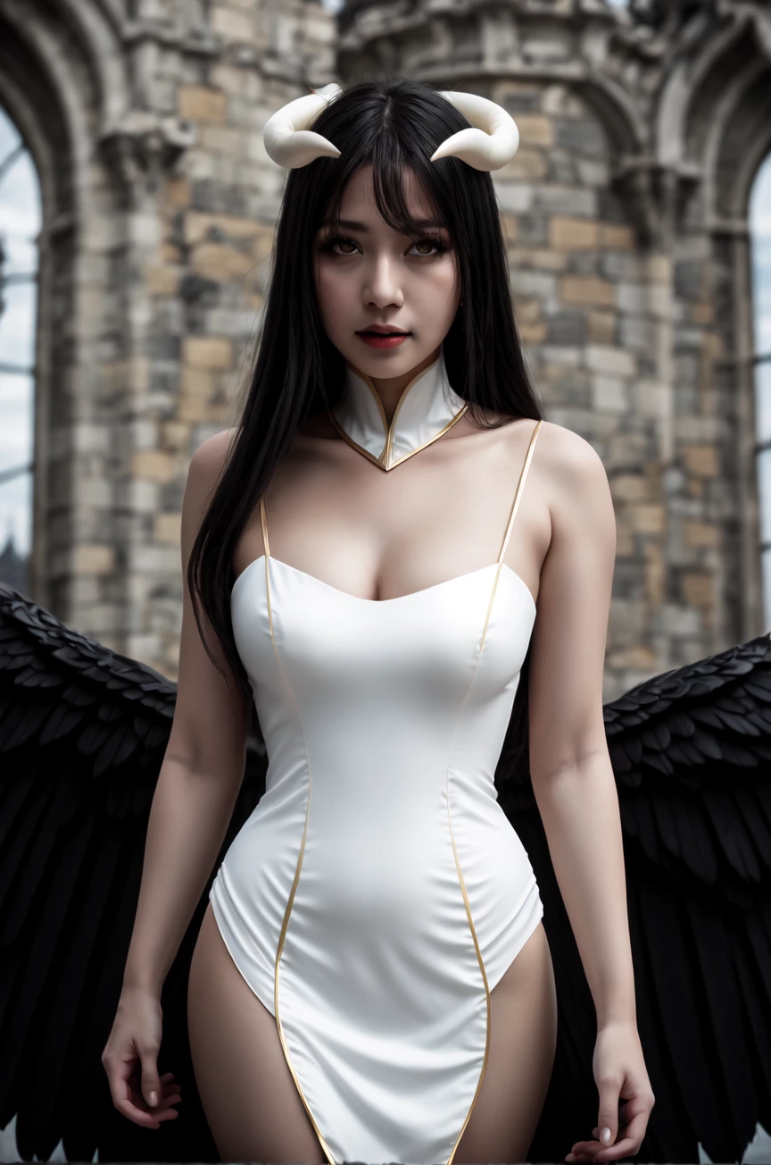 with v1.2: "black wings, white dress with gold, white horns, black hair, (low wings,:1.1)"