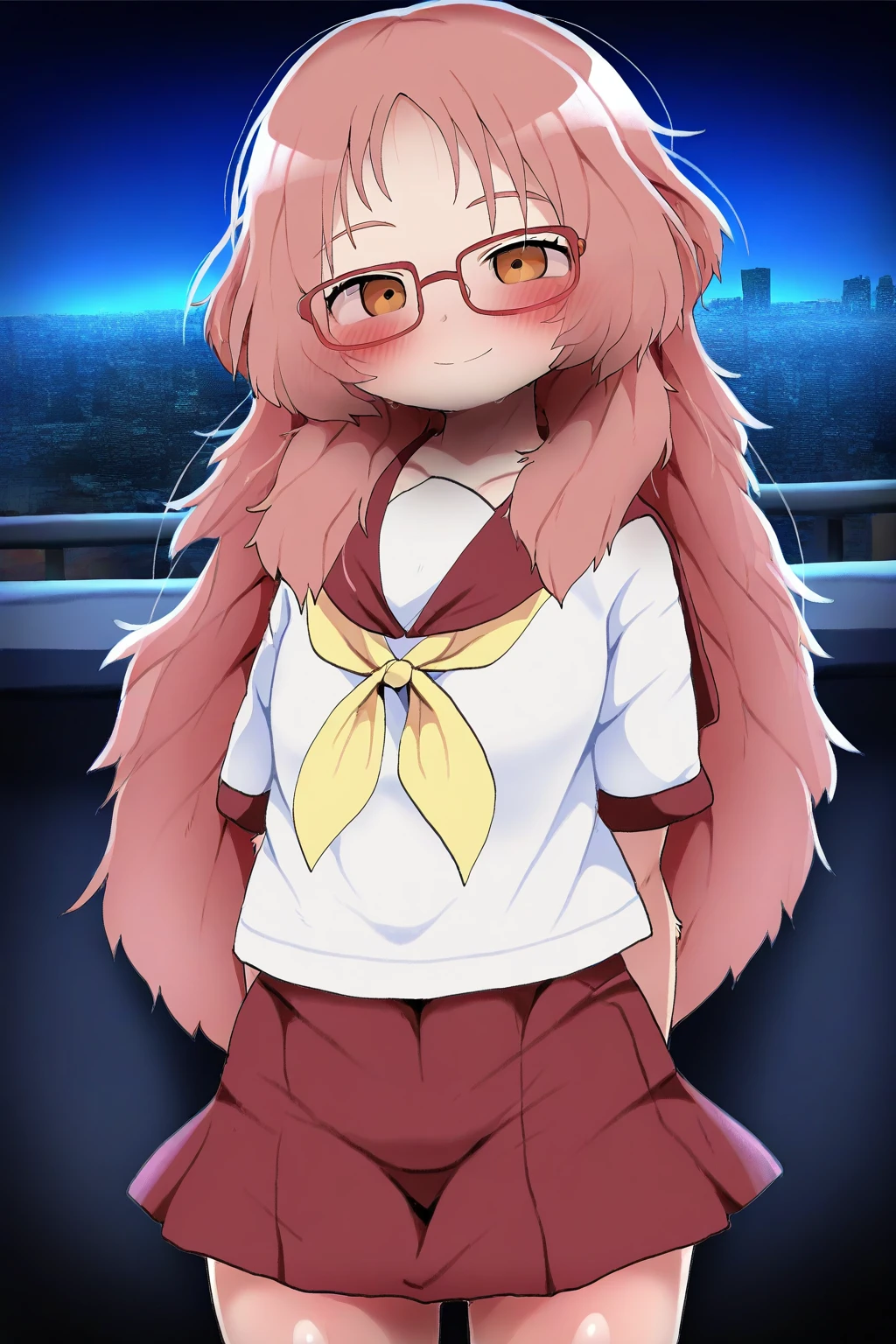 uses ai_mie, pink hair, medium hair to summon her, uses glasses to summon her glasses. put glasses to negative prompt to remove her glasses, Add sailor color, serafuku, school uniform, to summon her outfit, use squinting to squint her eyes, like in the manga.