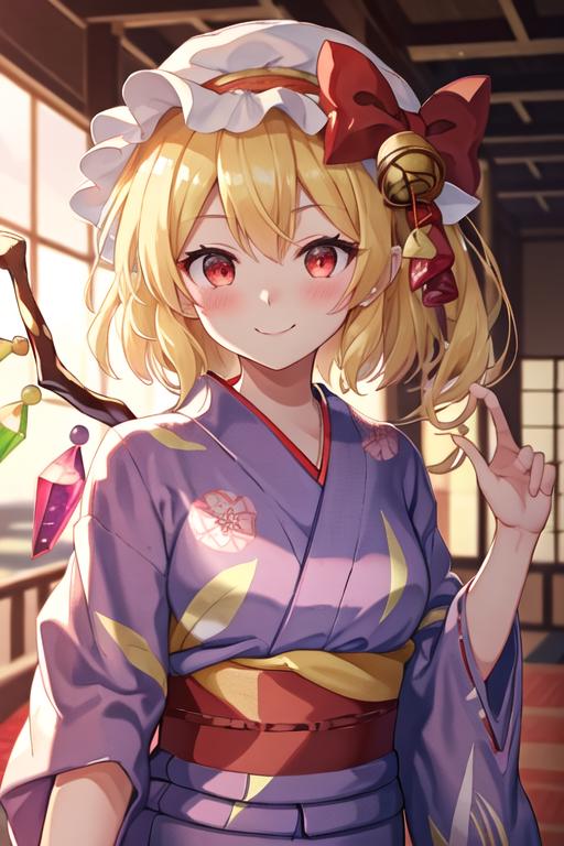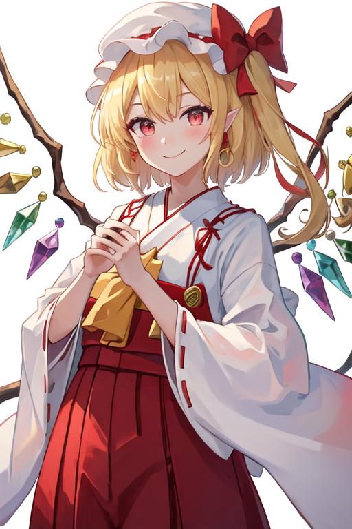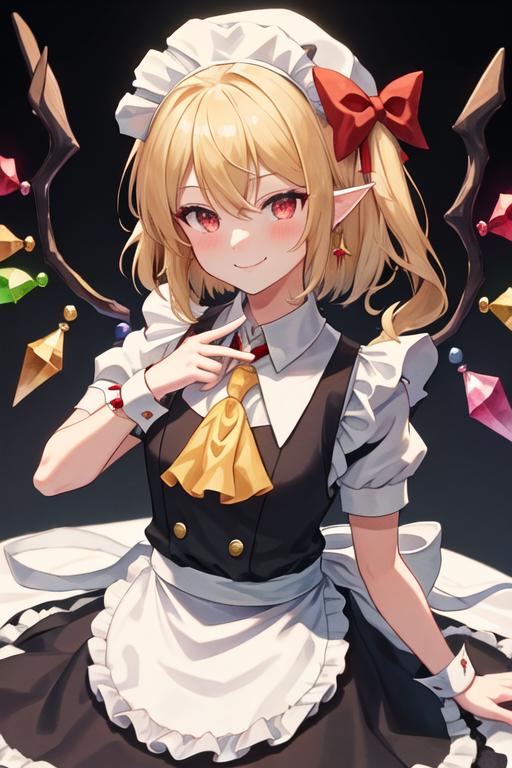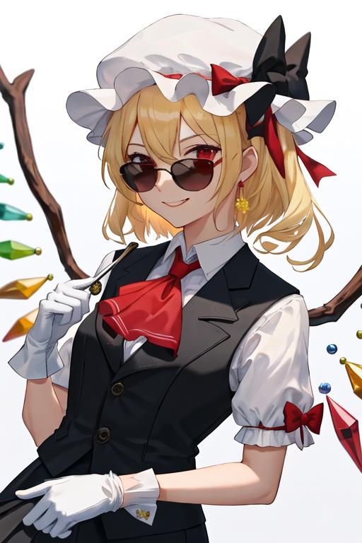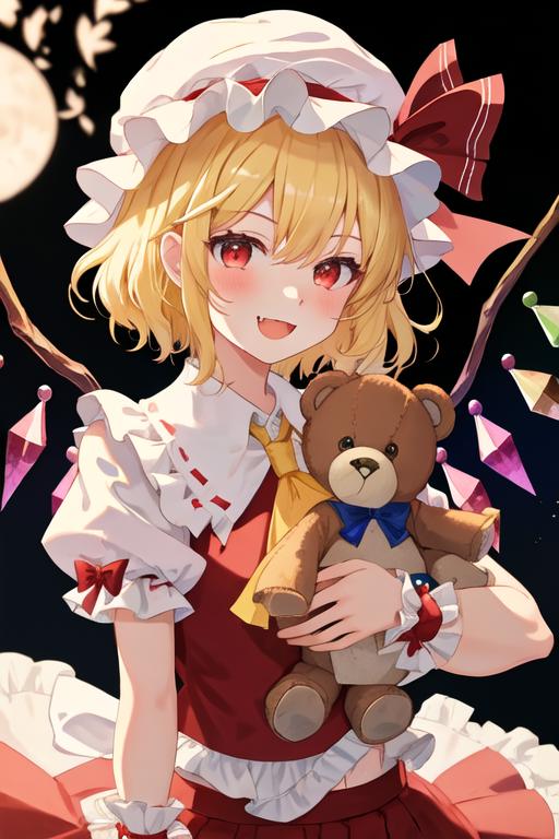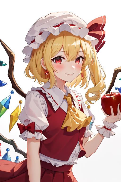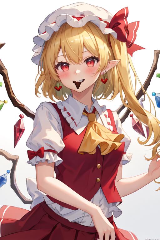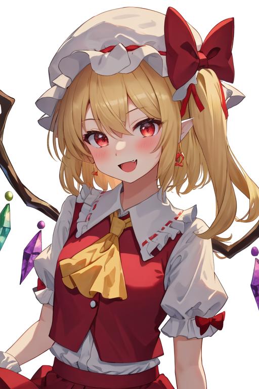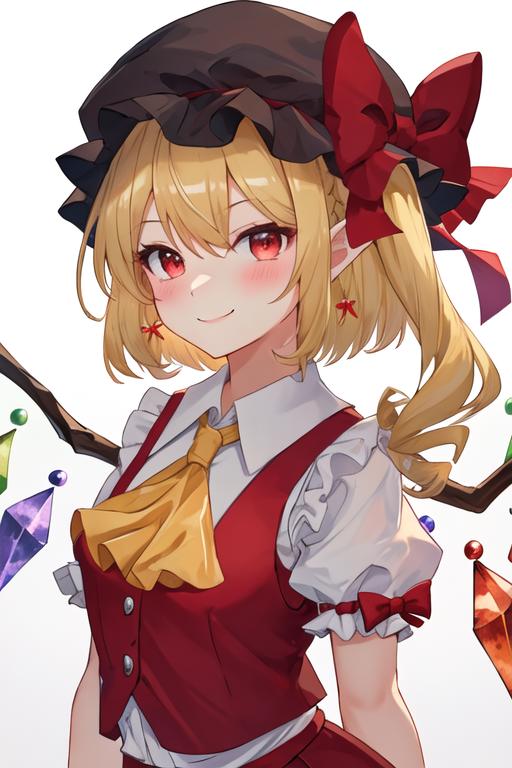 The trigger word is flandre_scarlet_touhou, and the recommended tags are masterpiece, best quality, highres, solo, {flandre_scarlet_touhou:1.10}, blonde_hair, wings, red_eyes, crystal, hat, ribbon, mob_cap, one_side_up, bangs, bow, smile, vest, white_headwear, ascot, blush, red_vest, red_ribbon, red_bow, hat_ribbon, hair_between_eyes, yellow_ascot, short_hair.