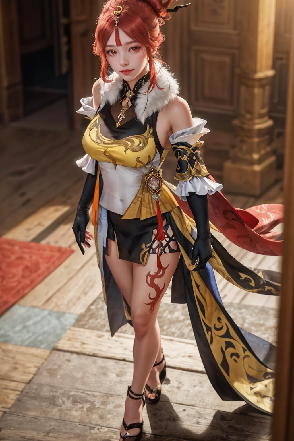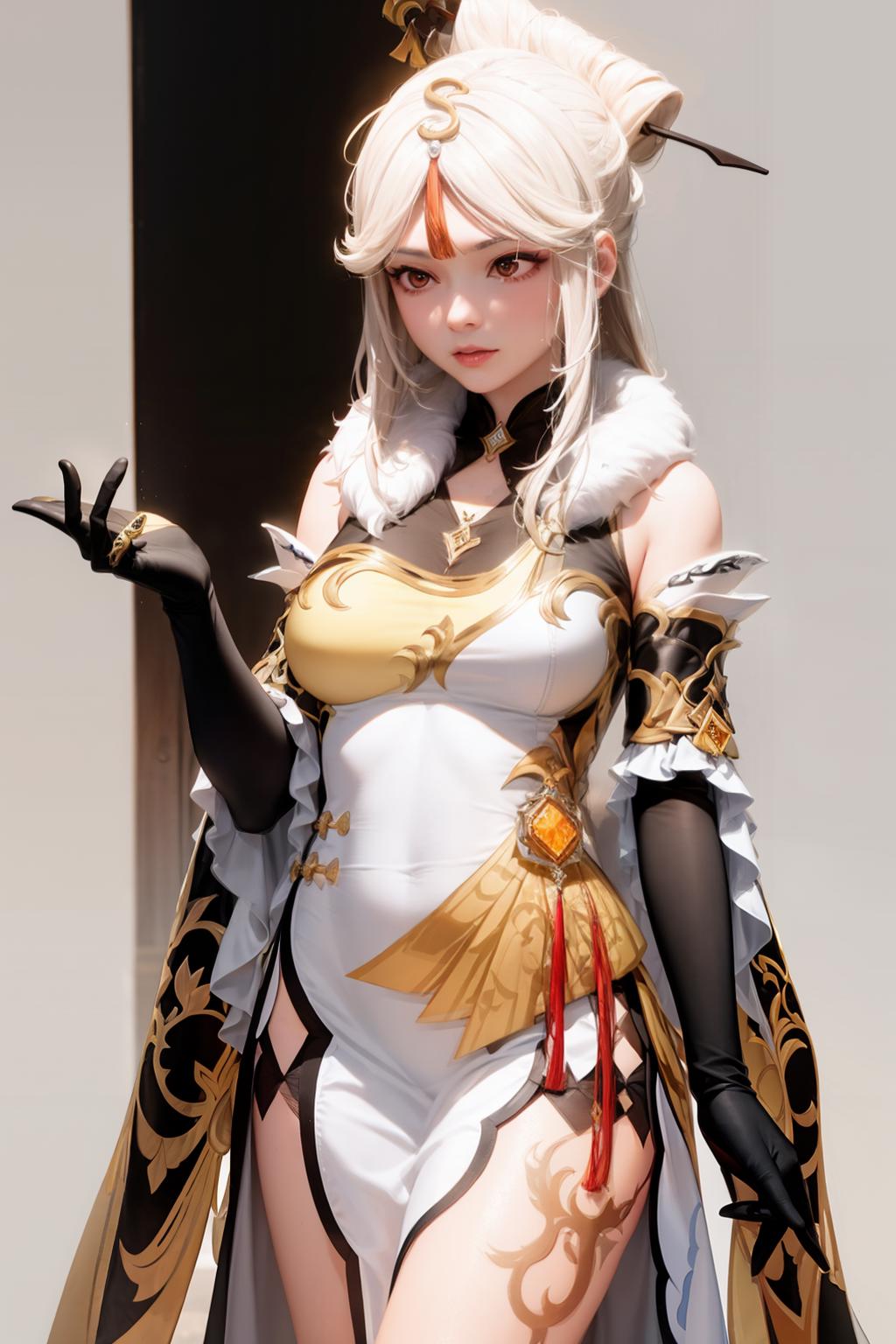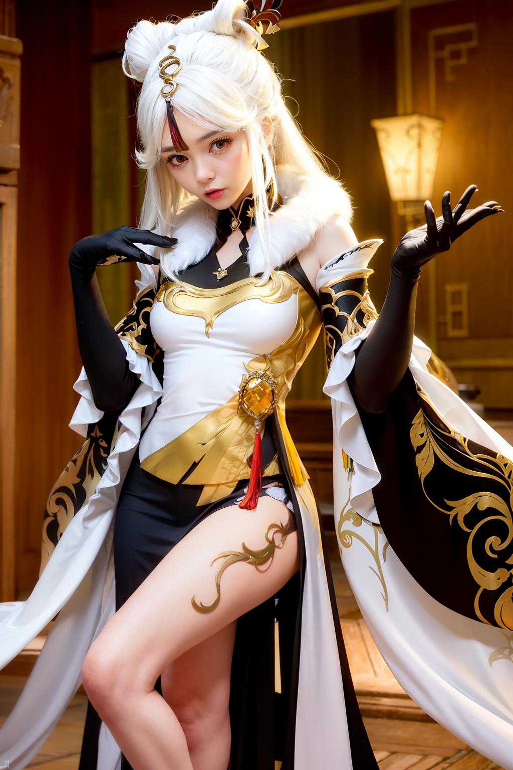 1girl,long hair,white hair,hair stick,hair ornament,red eyes,jewelry, vision \(genshin impact\), chinese dress, gloves, claw ring,tassel,bare shoulders, fur collar,fur trim,detached sleeves, leg tattoo,tattoo, pelvic curtain,