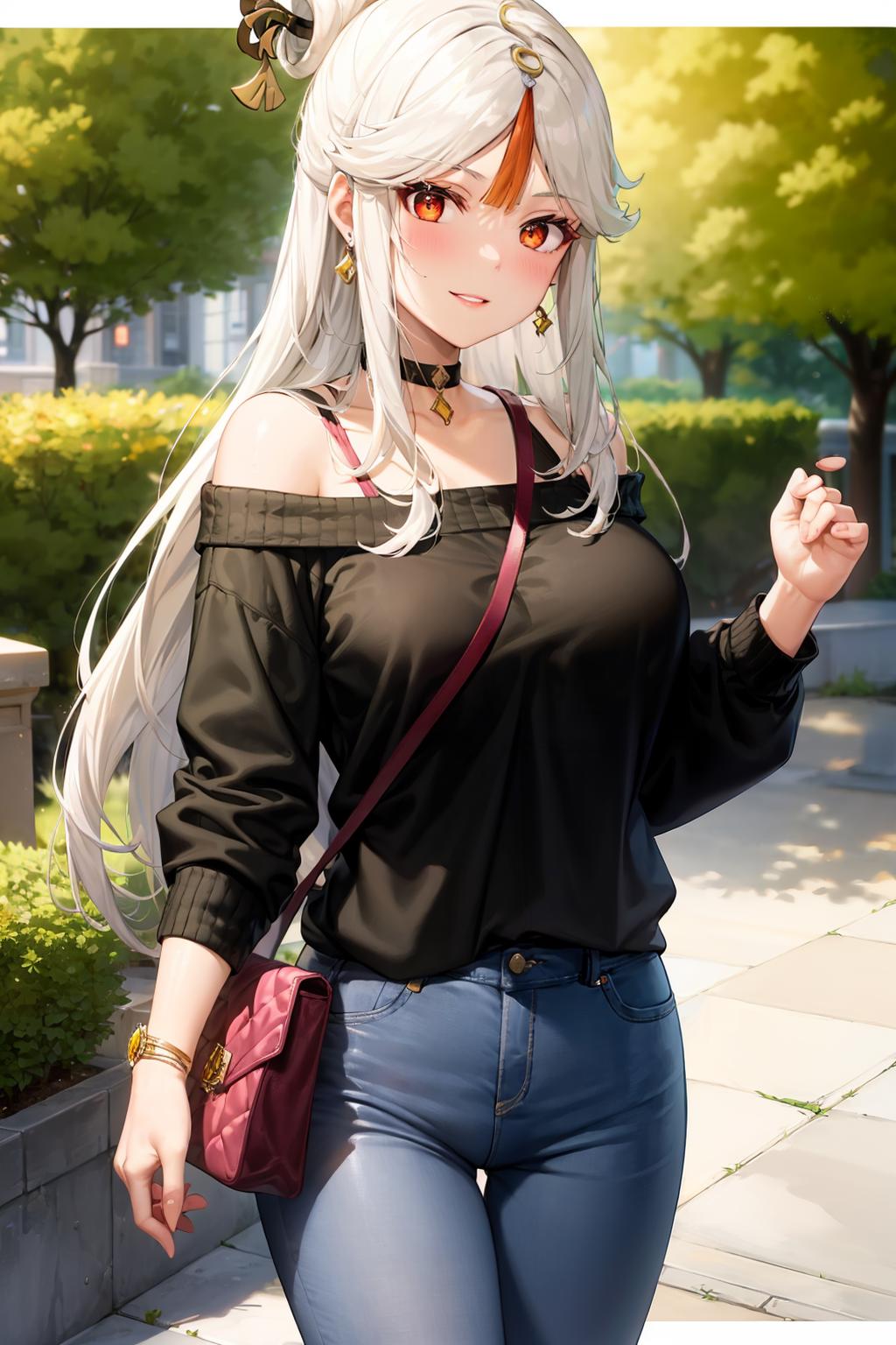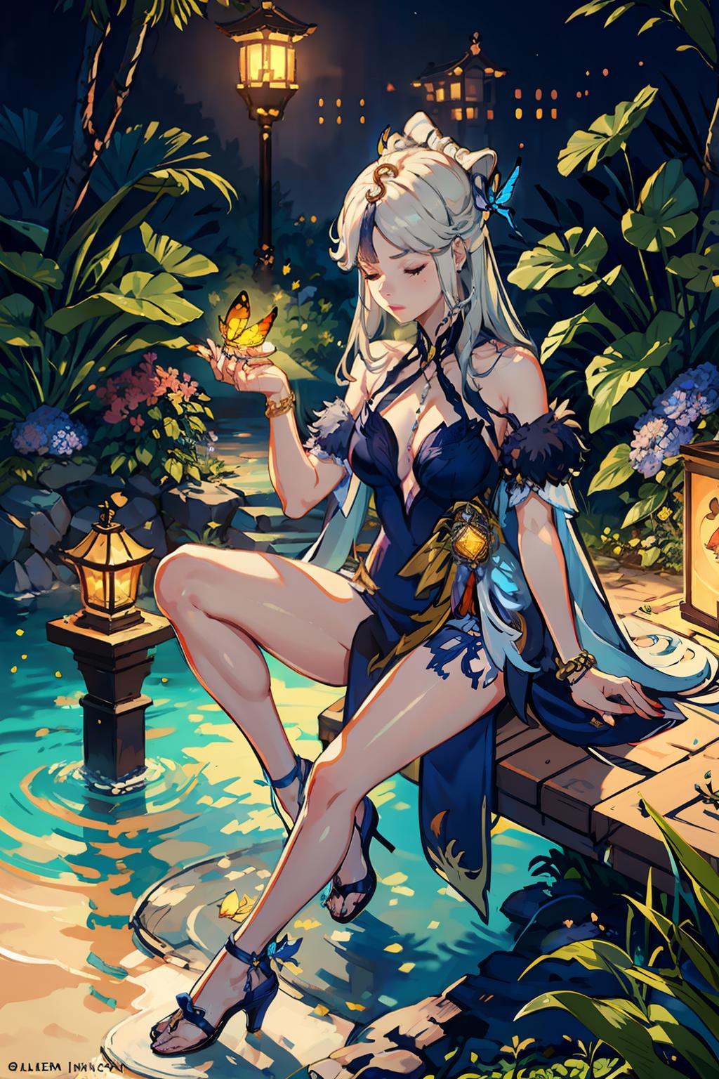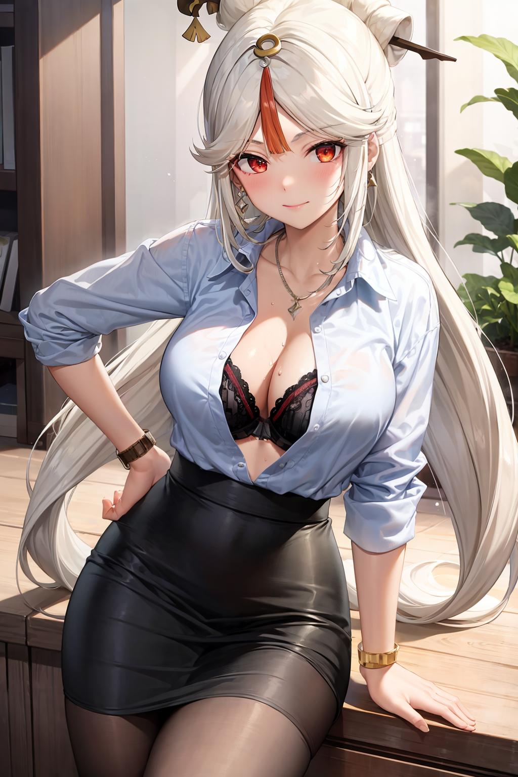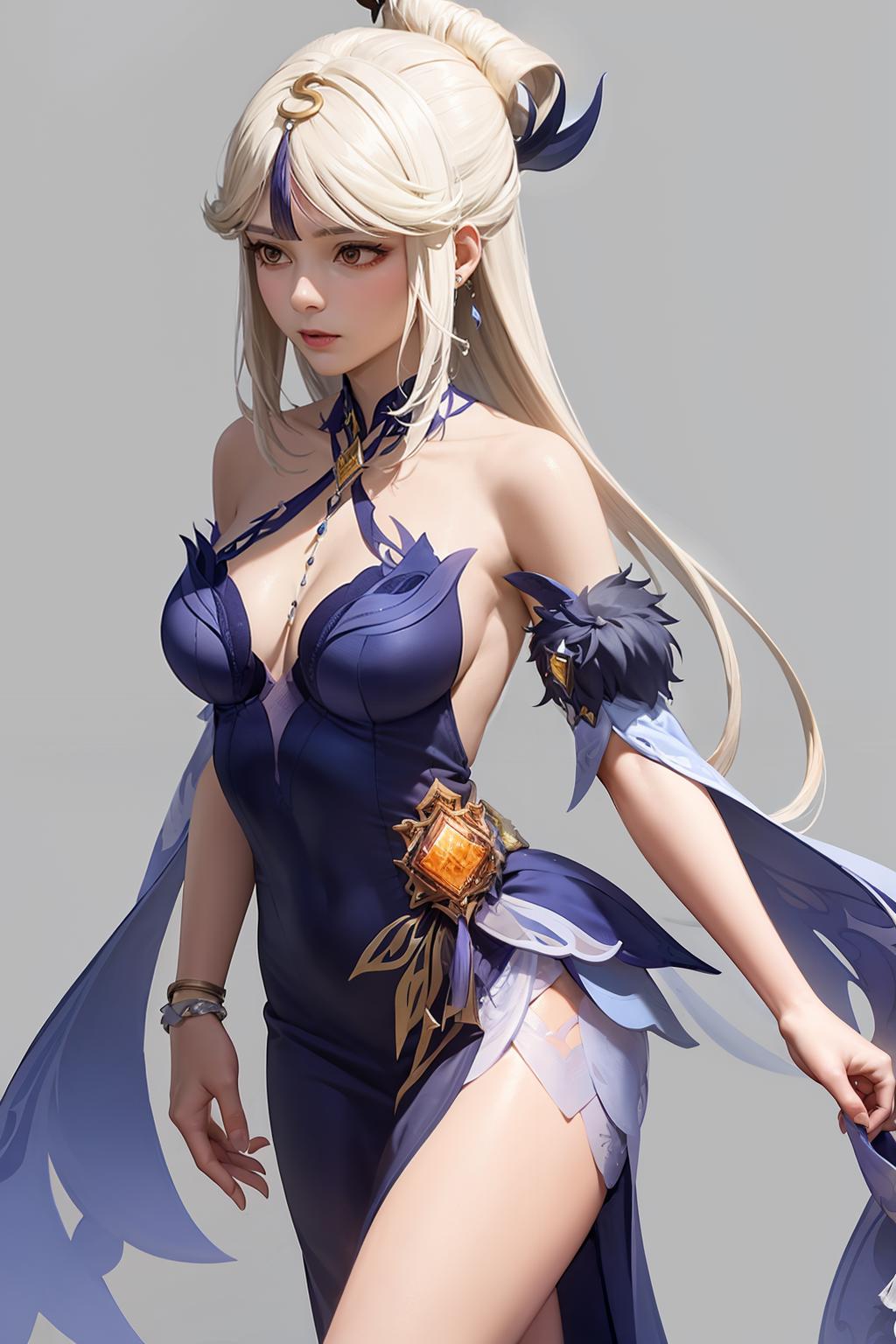 1girl, official alternate costume, long hair, white hair,hair ornament, red eyes,blue dress , cleavage, tassel, blue collar,bare shoulders, vision (genshin impact), jewelry, bracelet, pelvic curtain, side slit, sidelocks, detached sleeves