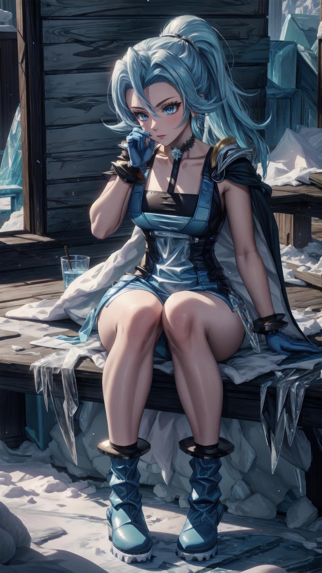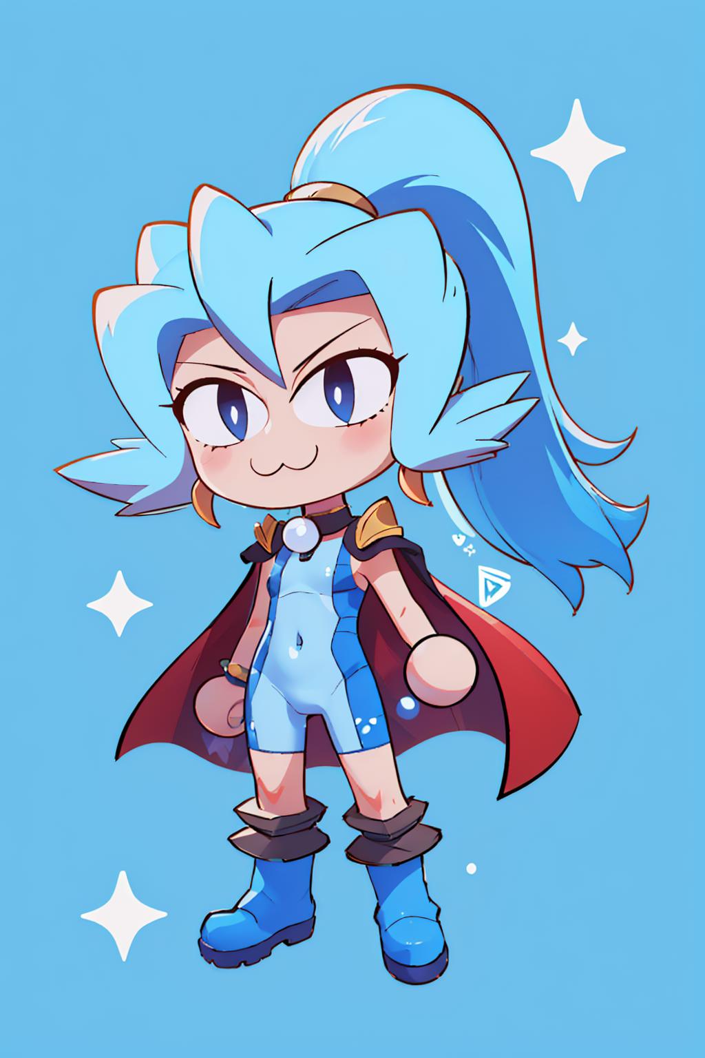 Add "earrings, choker, cape, blue ????????, blue gloves, bracelet" for her typical look.