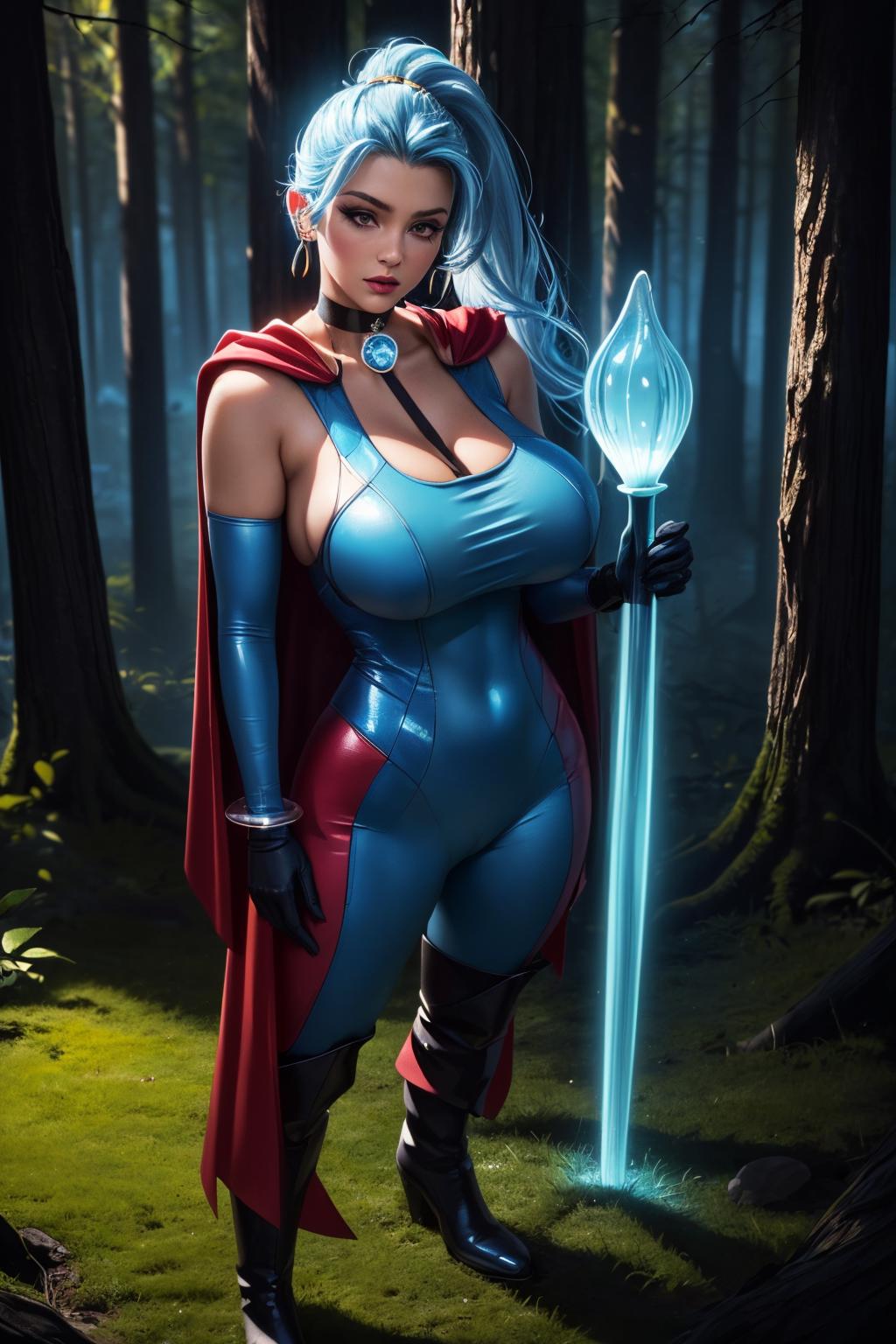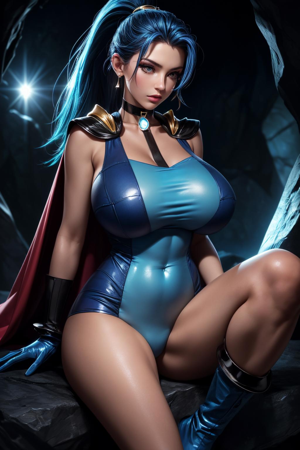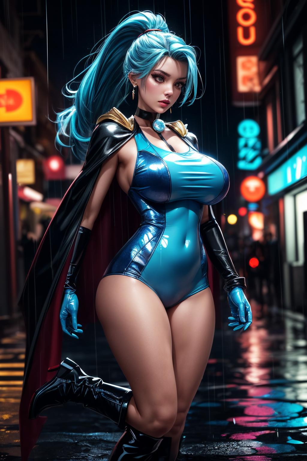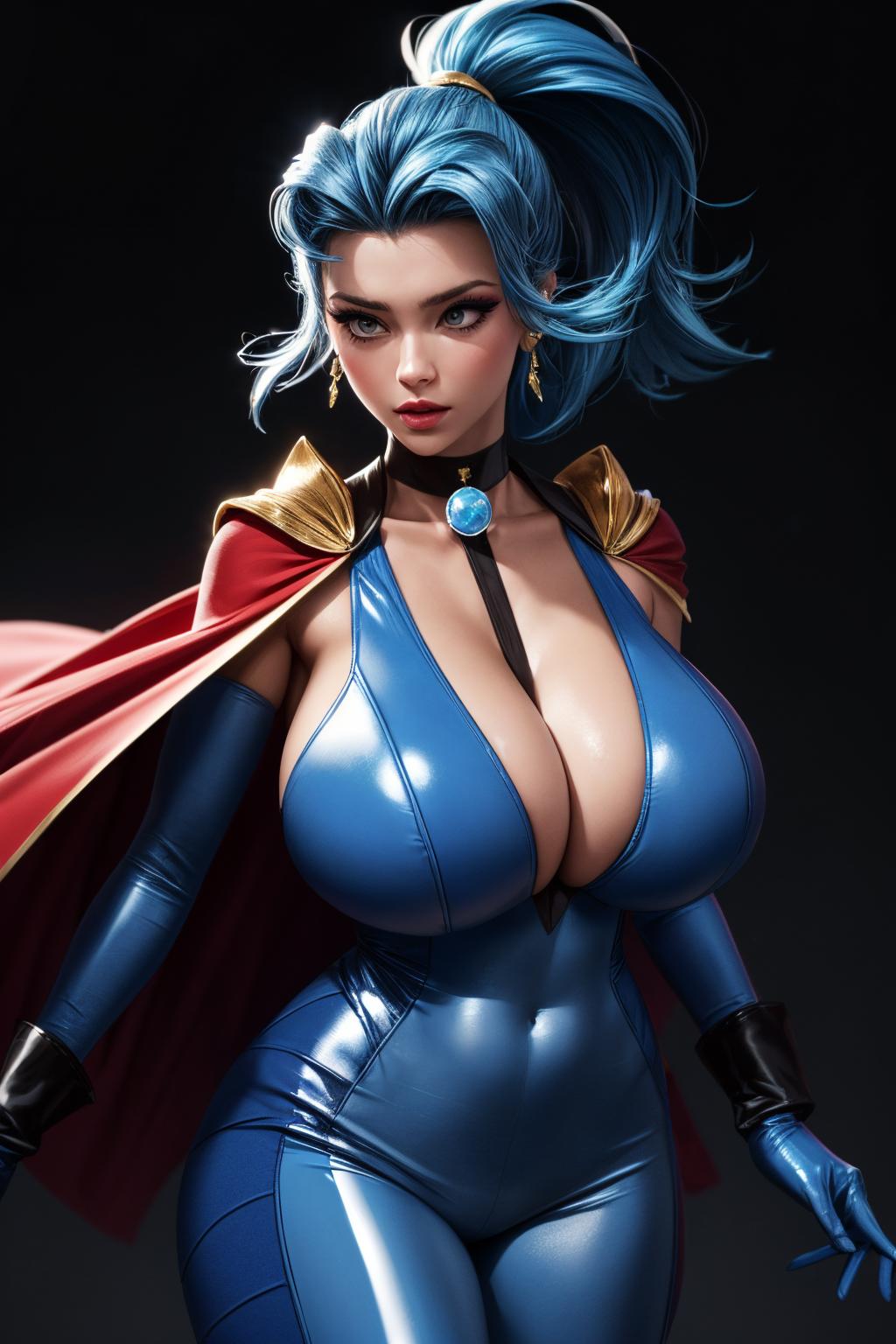 earrings, choker, cape, blue bodysuit, blue gloves, bracelet