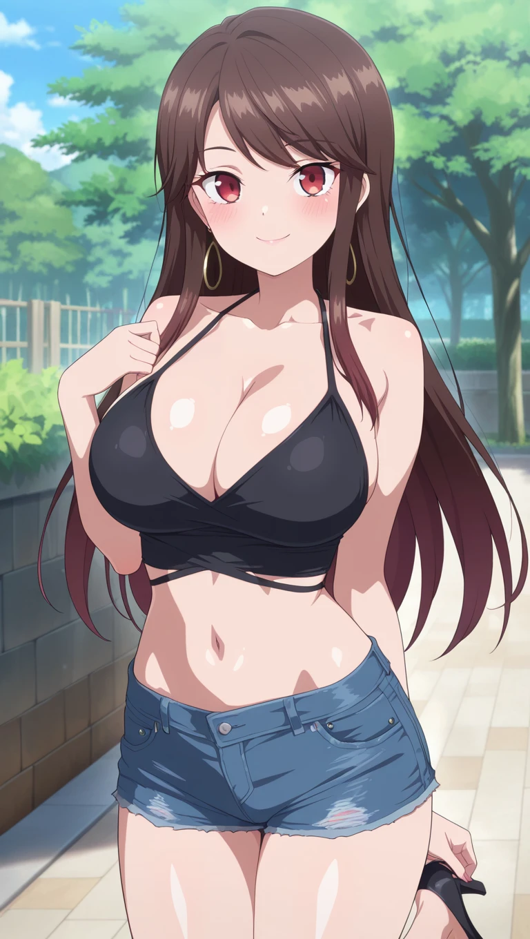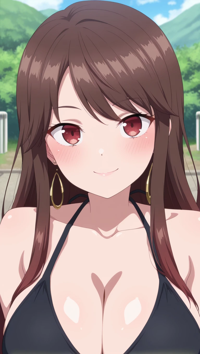 long hair,brown hair,jewelry,hoop earrings,sidelocks,swept bangs,red eyes