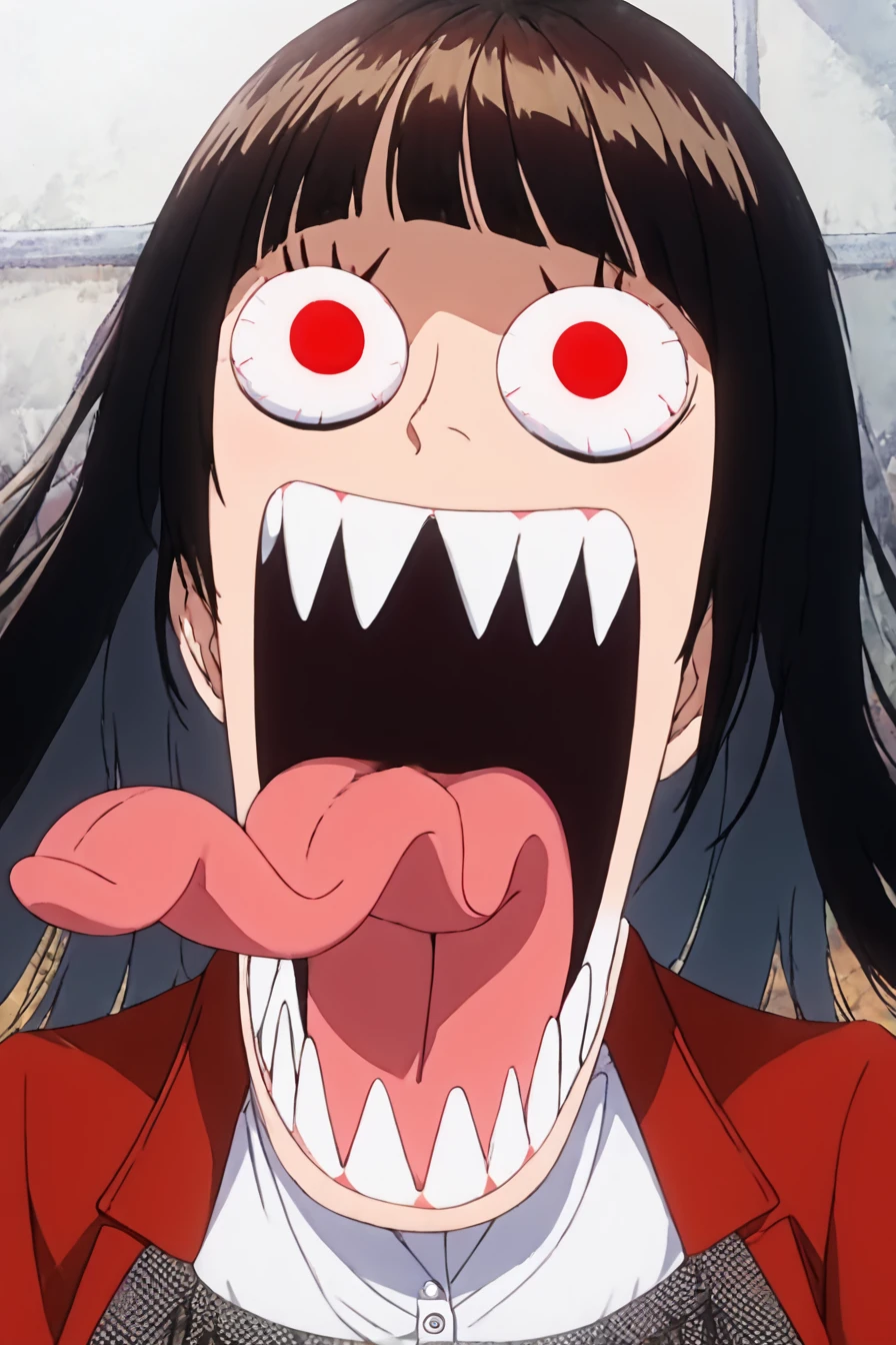 prompt 1 : one_piece_funny_face, eye pop, snot, sharp teeth, eyes vein lines, open mouth, tongue out, long tongue