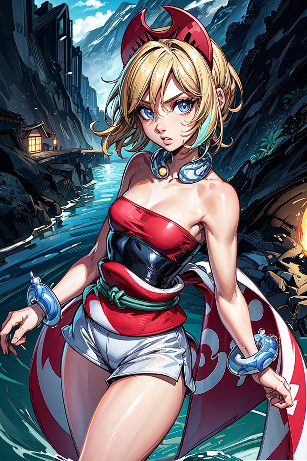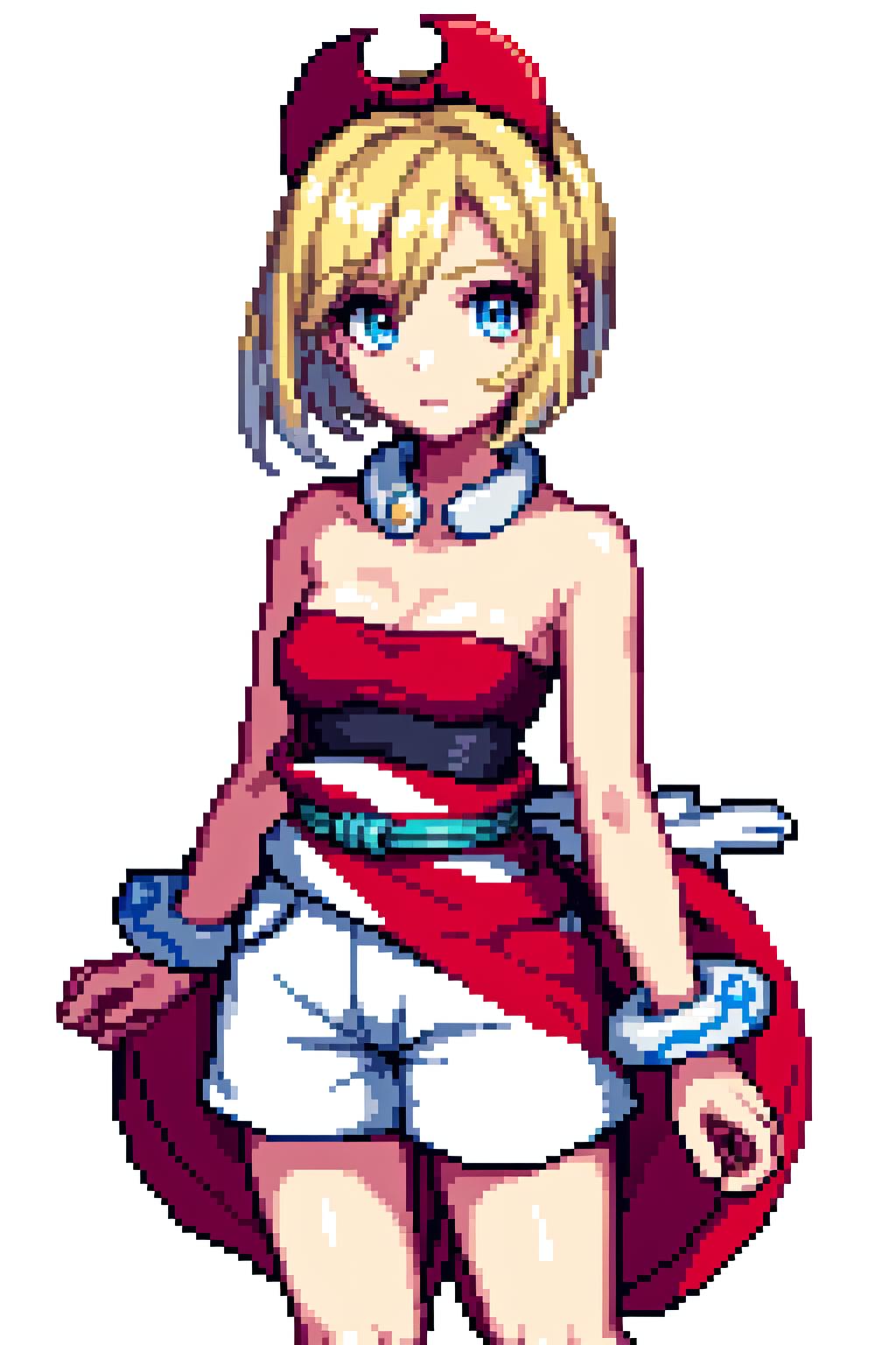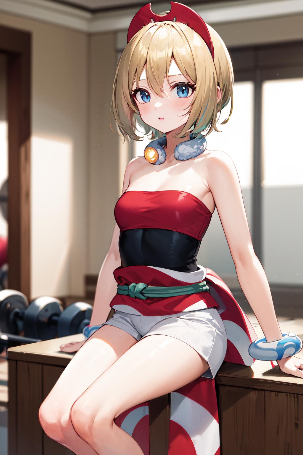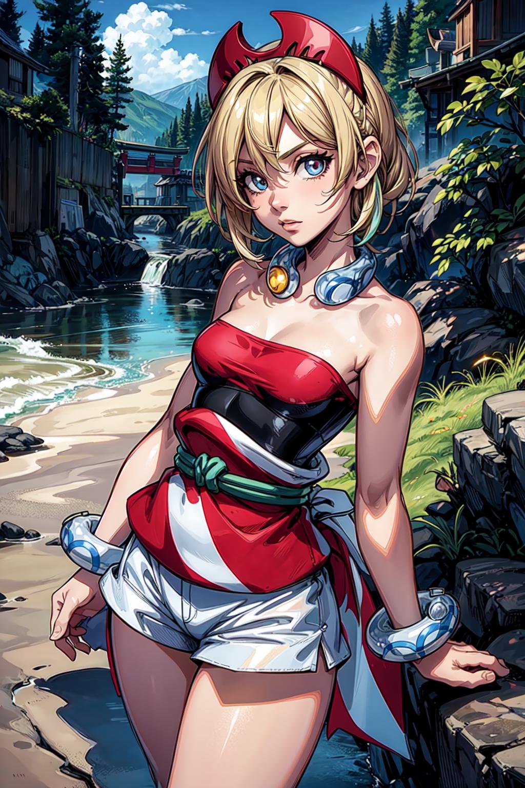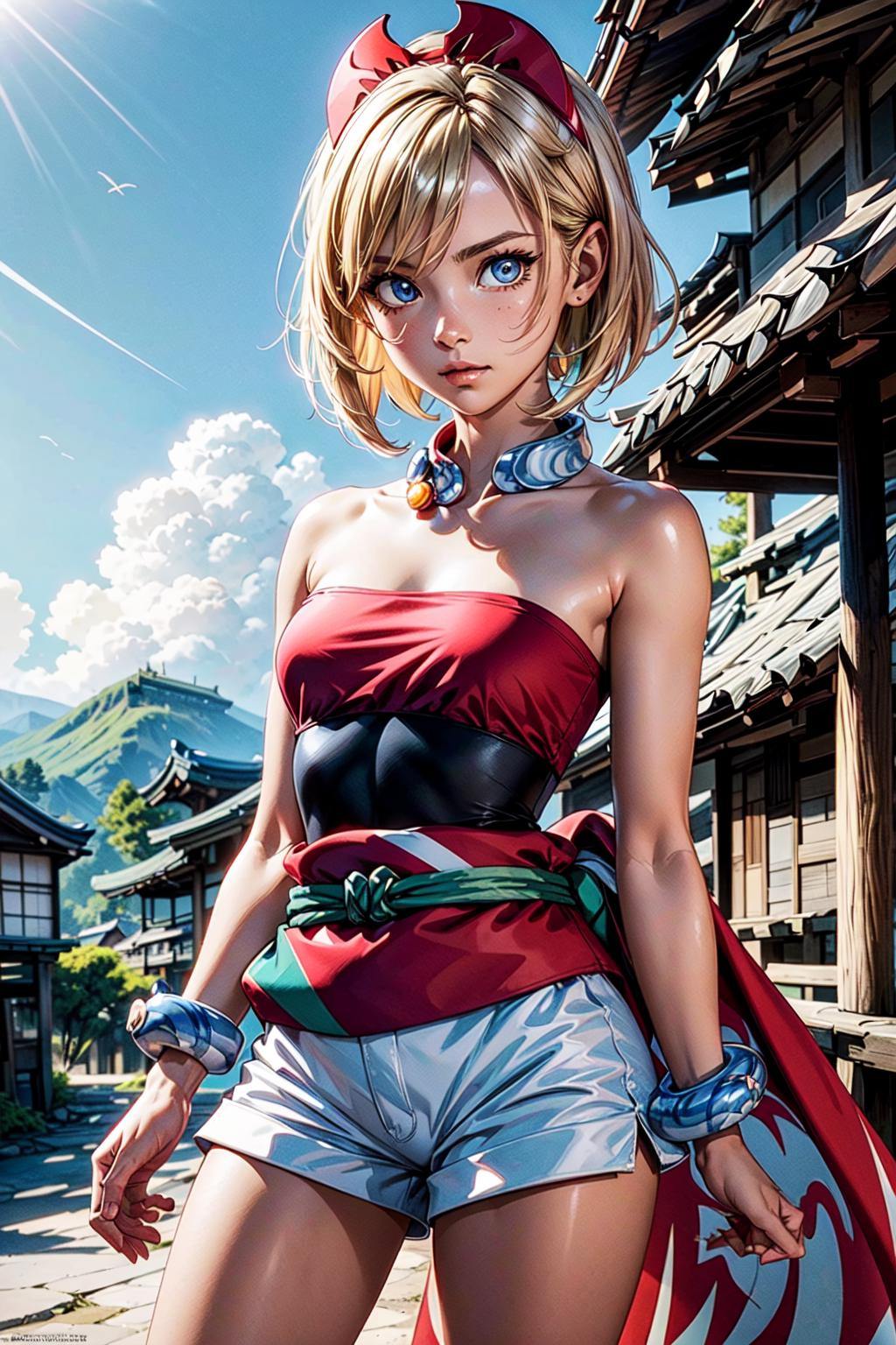 outfit1aairida, short hair, red hairband, neck ring, collar, strapless shirt, red shirt, bracelet, sash, waist cape, white shorts, ???? legs