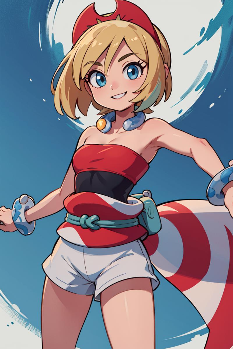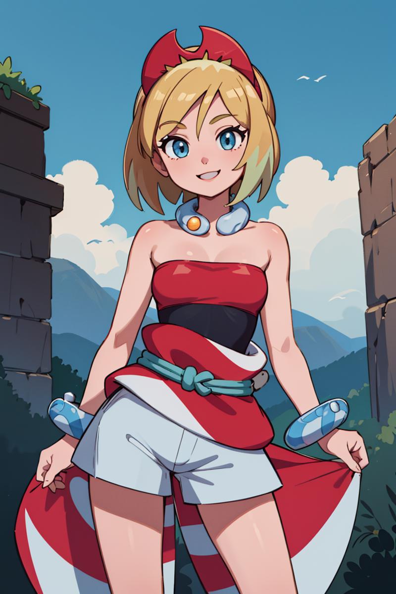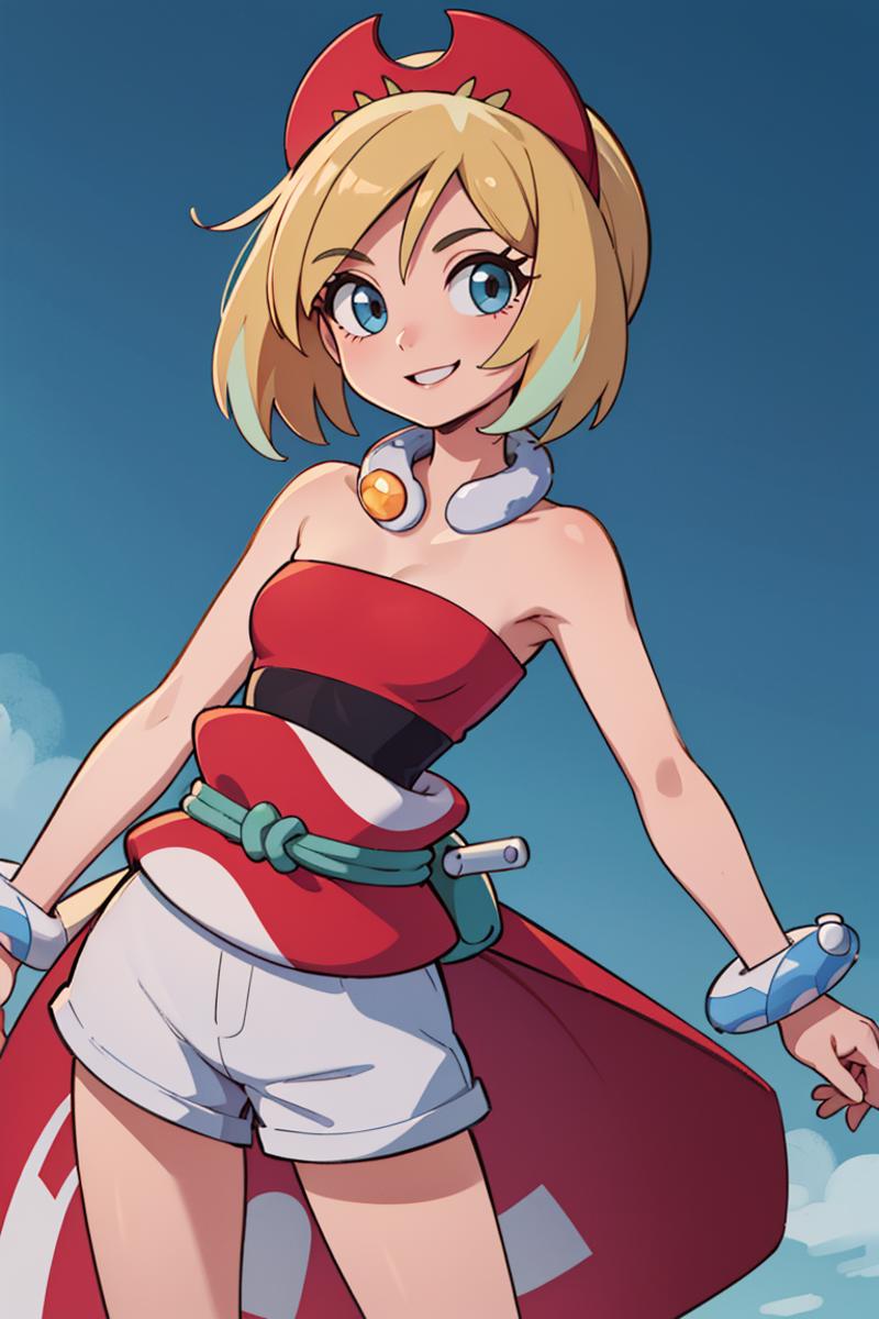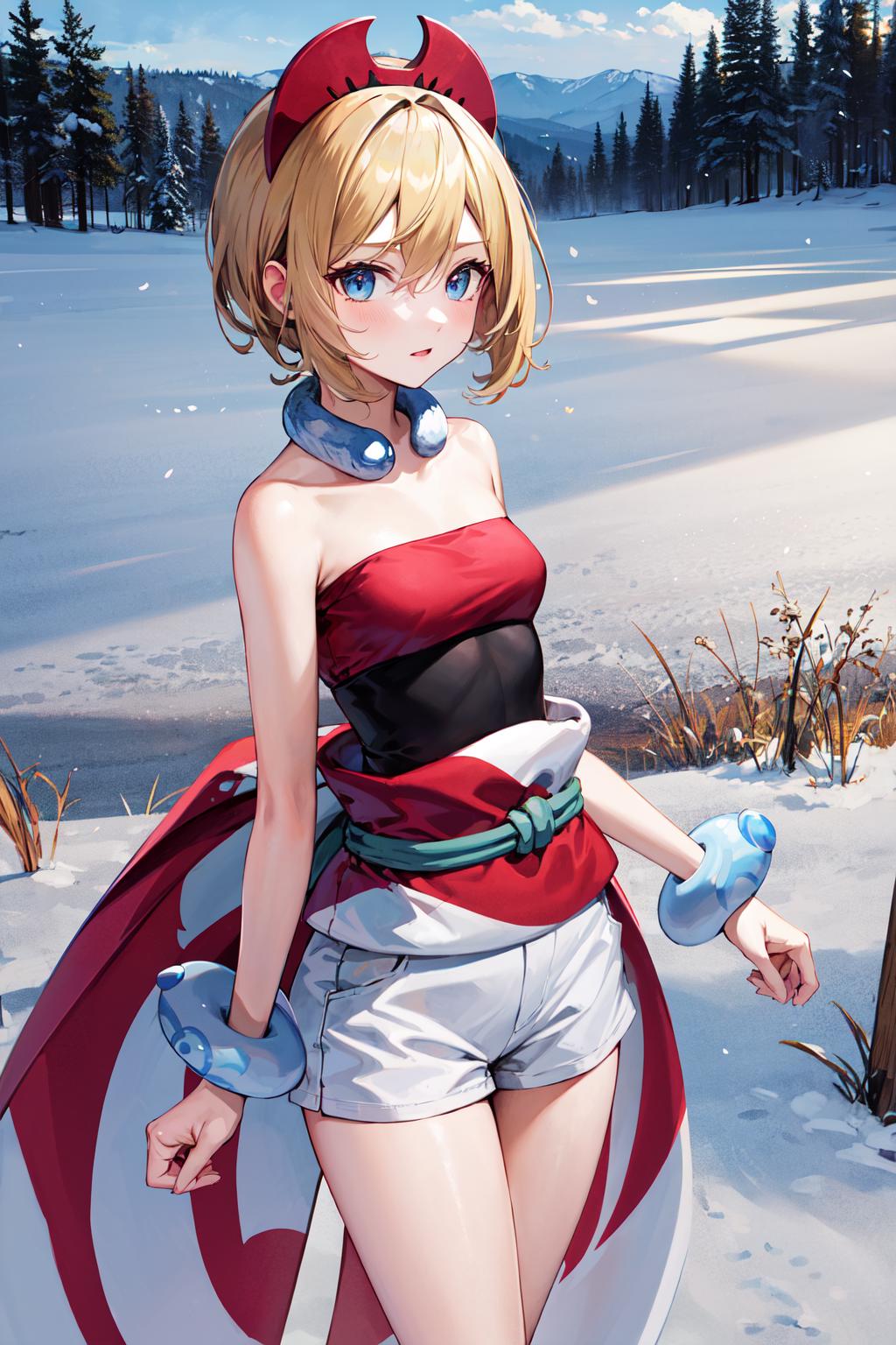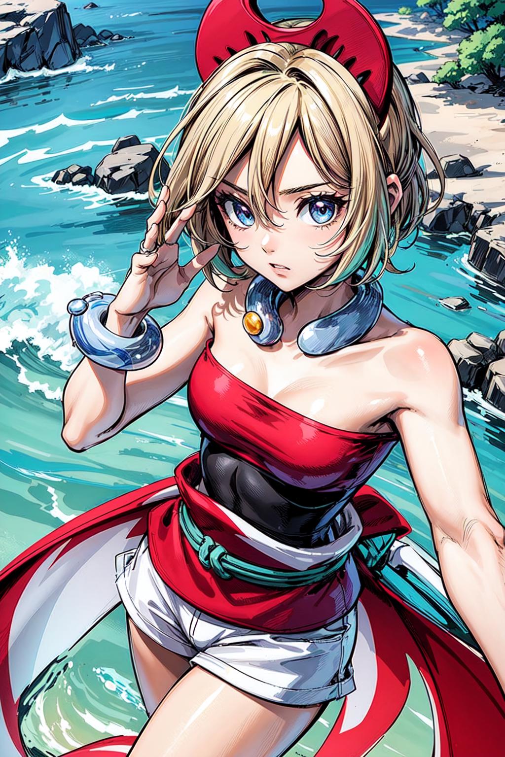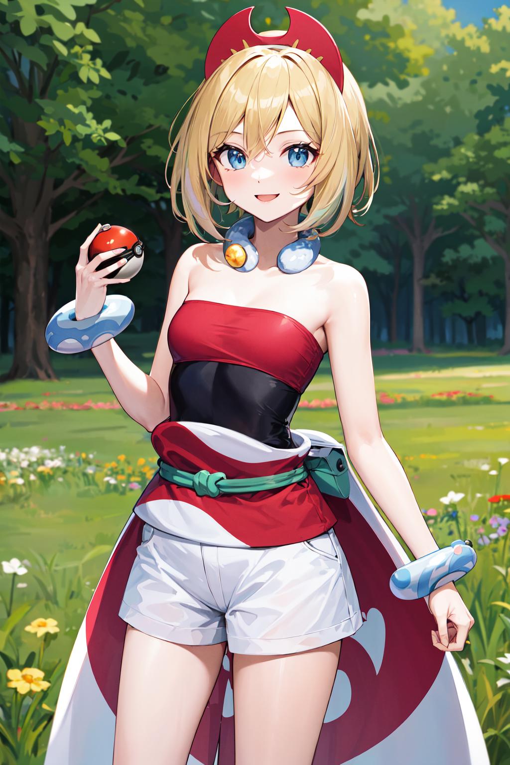 outfit1aairida, short hair, red hairband, neck ring, collar, strapless shirt, red shirt, bracelet, sash, waist cape, white shorts, ???? legs