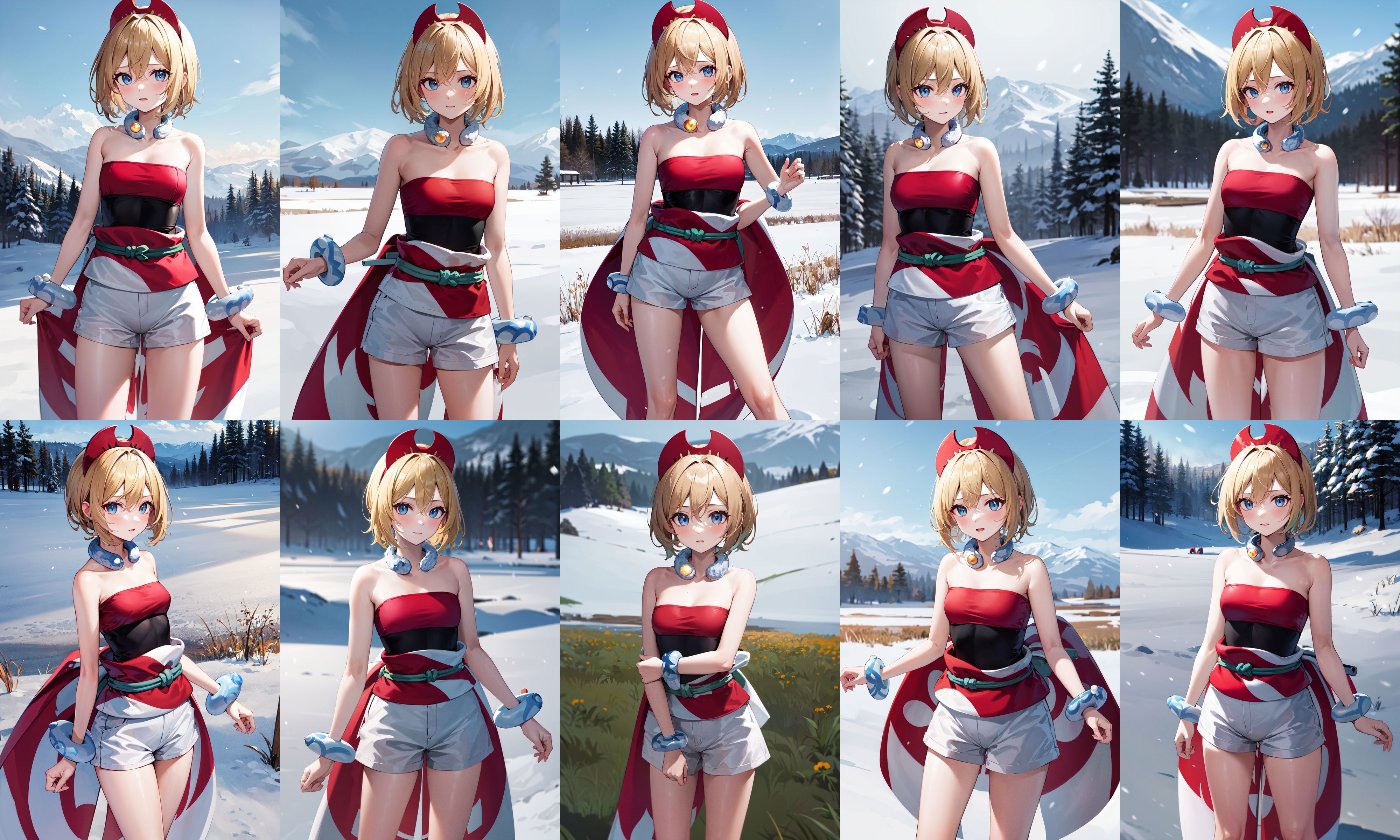 aairida, short hair, red hairband, neck ring, collar, strapless shirt, red shirt, bracelet, sash, waist cape, white shorts, ???? legs