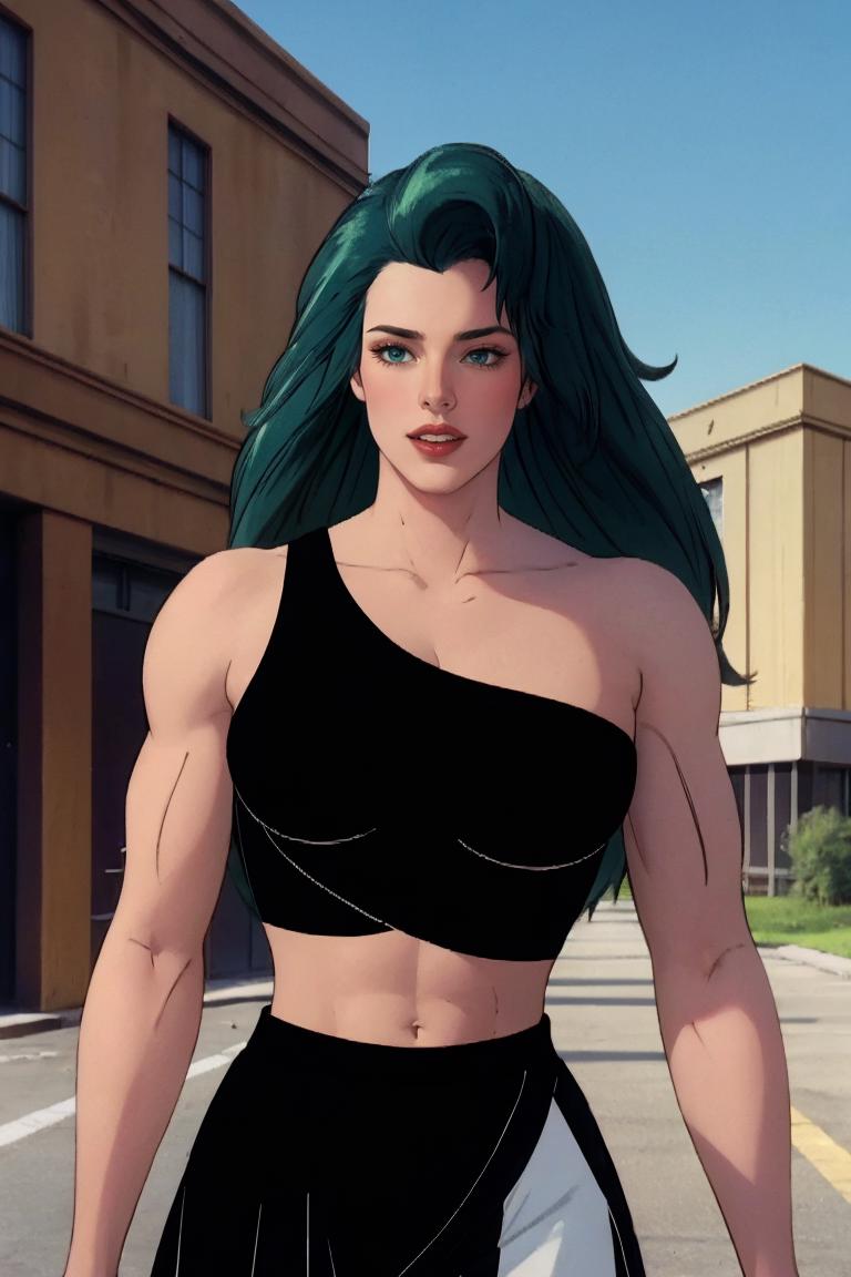 very long hair, long hair,(green skin:1.2),colored skin,breasts,green hair,muscular,medium breasts,makeup,lips,big hair,muscular female,abs,collarbone,lipstick,large breasts,eyeshadow,navel,green eyes,OUTFIT PROMPTS