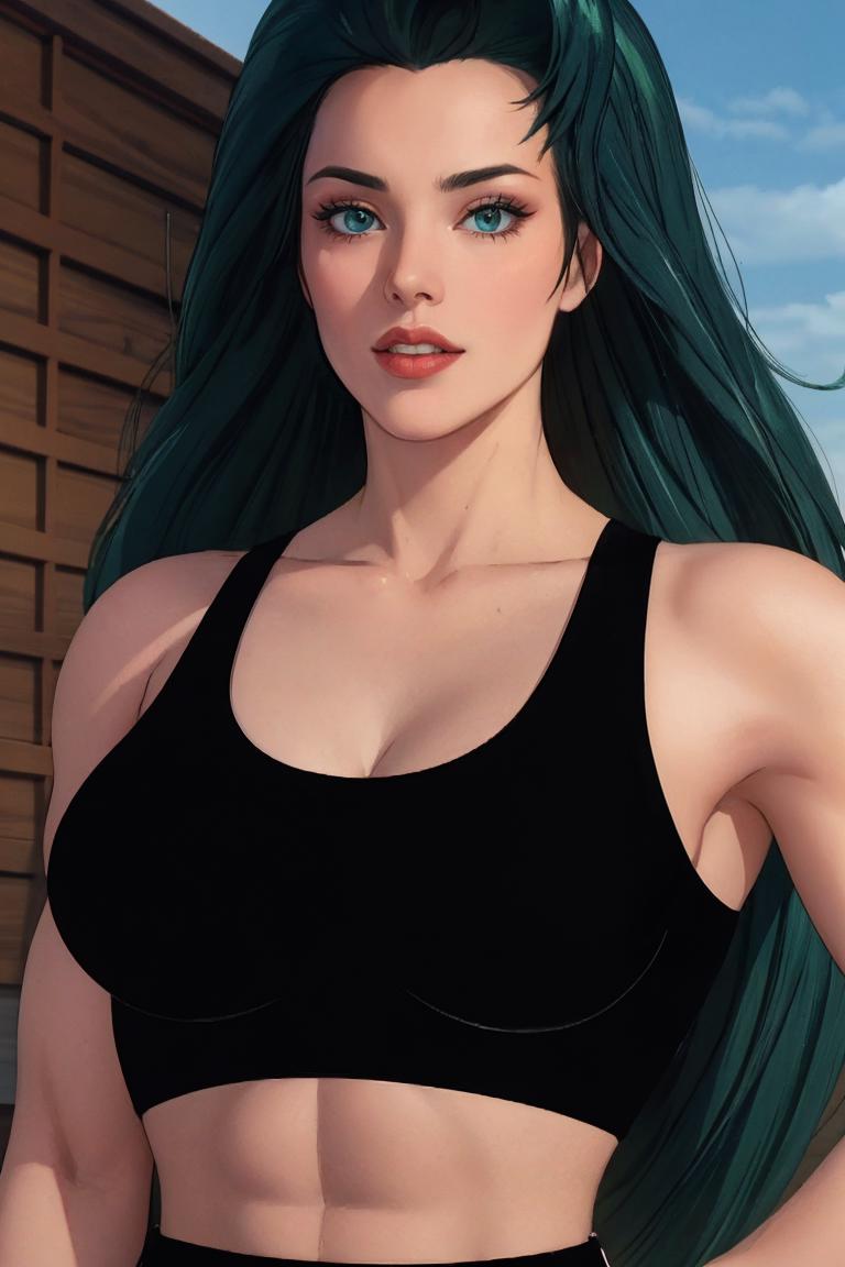 very long hair, long hair,(green skin:1.2),colored skin,breasts,green hair,muscular, ?????????????, makeup,lips,big hair,muscular female,abs,collarbone,lipstick,eyeshadow,navel,green eyes, abs, tall female, OUTFIT PROMPTS