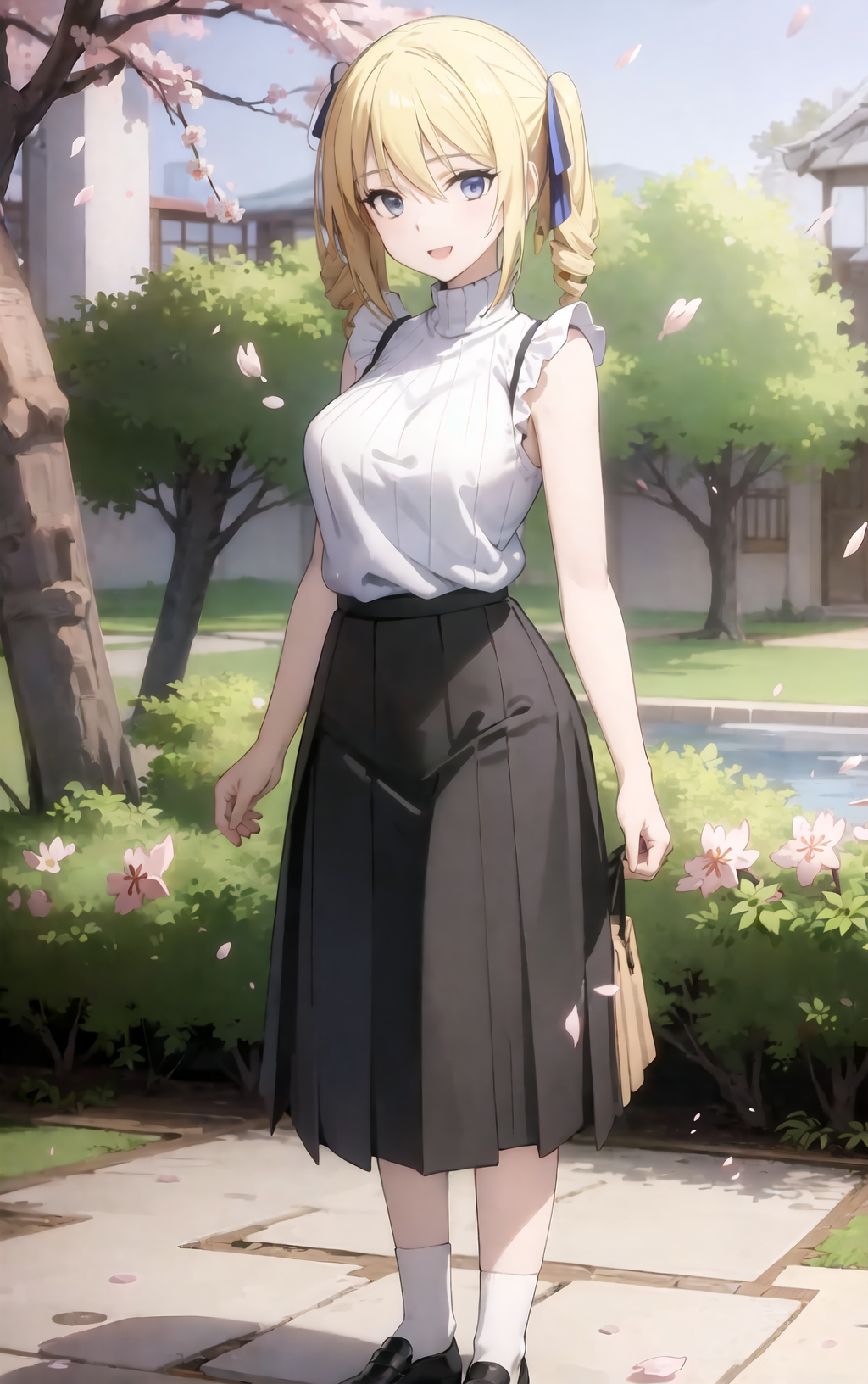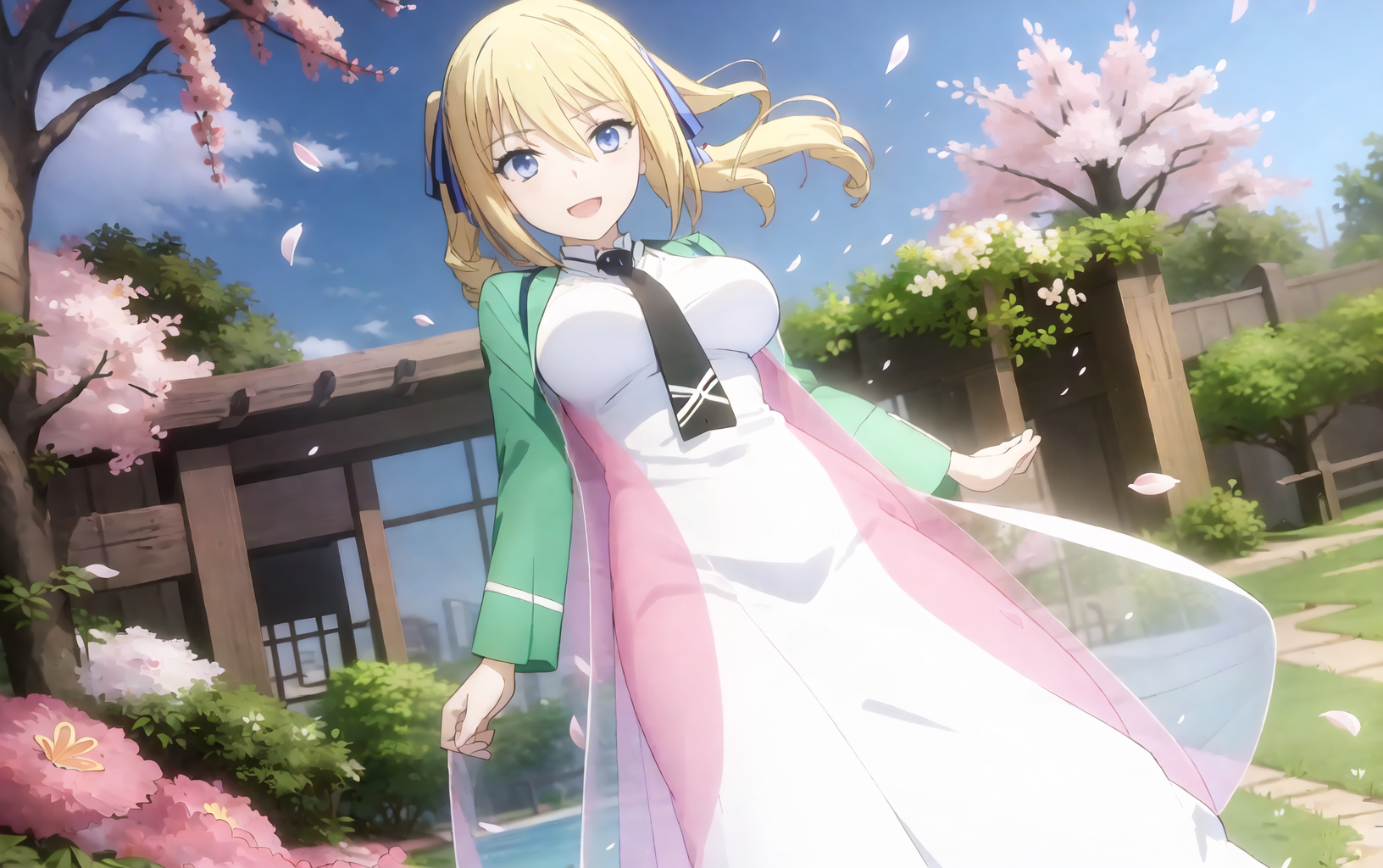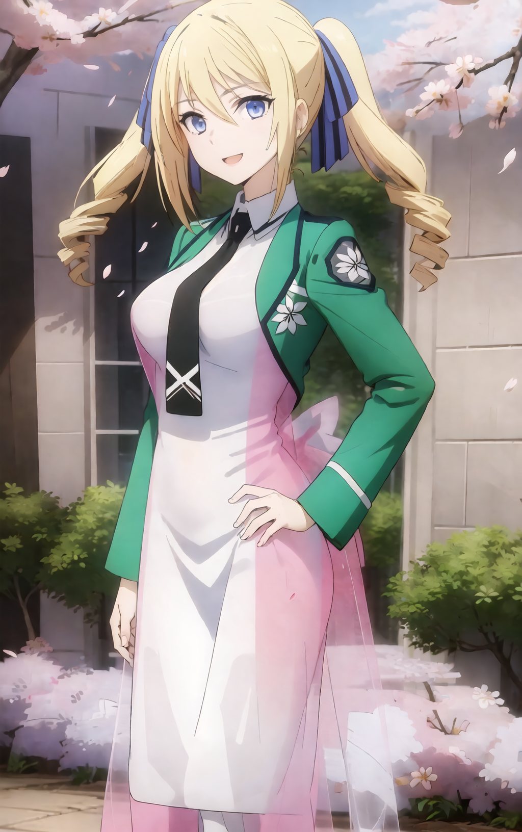 school uniform: angelina, mahouka_uniform, green_jacket, white_sleeveless_dress, star_print