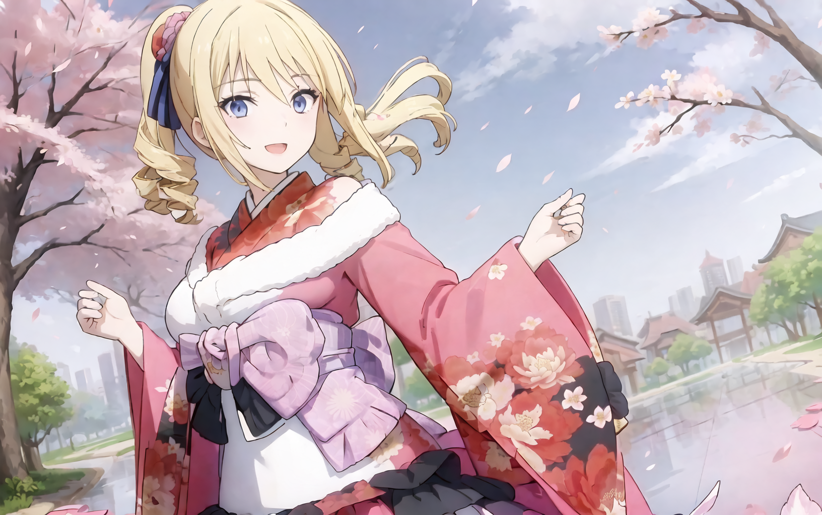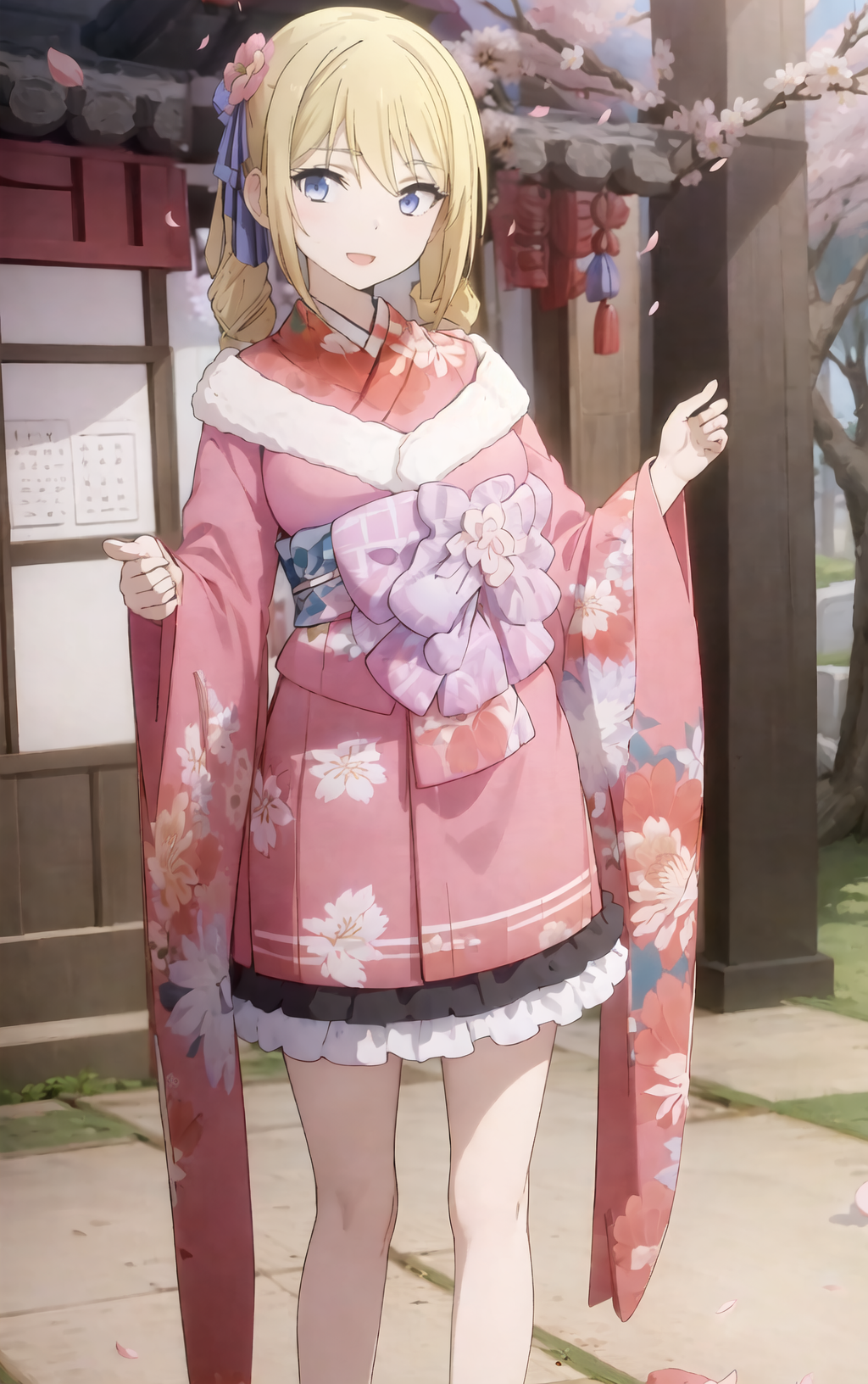 kimono: angelina, mahoushoujo_kimono, japanese_clothes, fur_trimmed_kimono, pink_flower, obi,