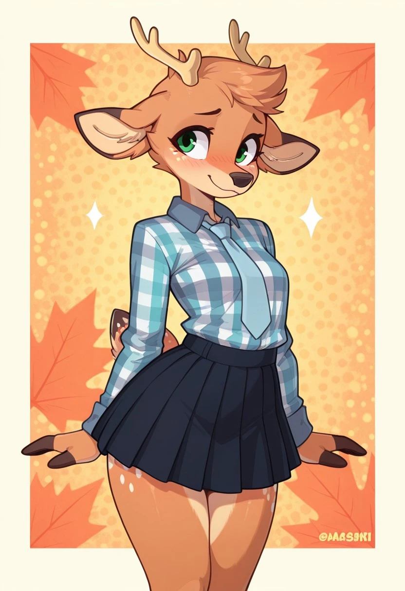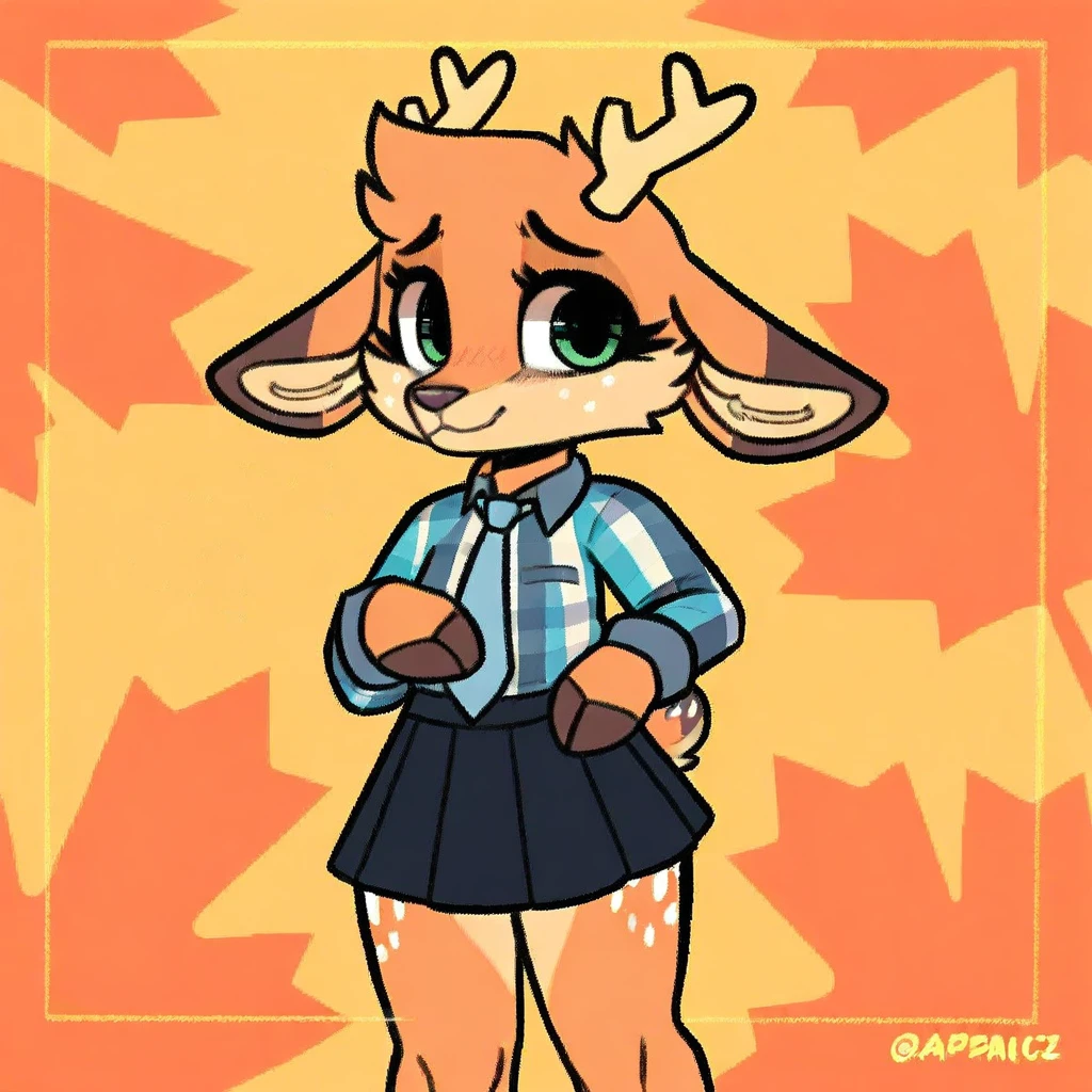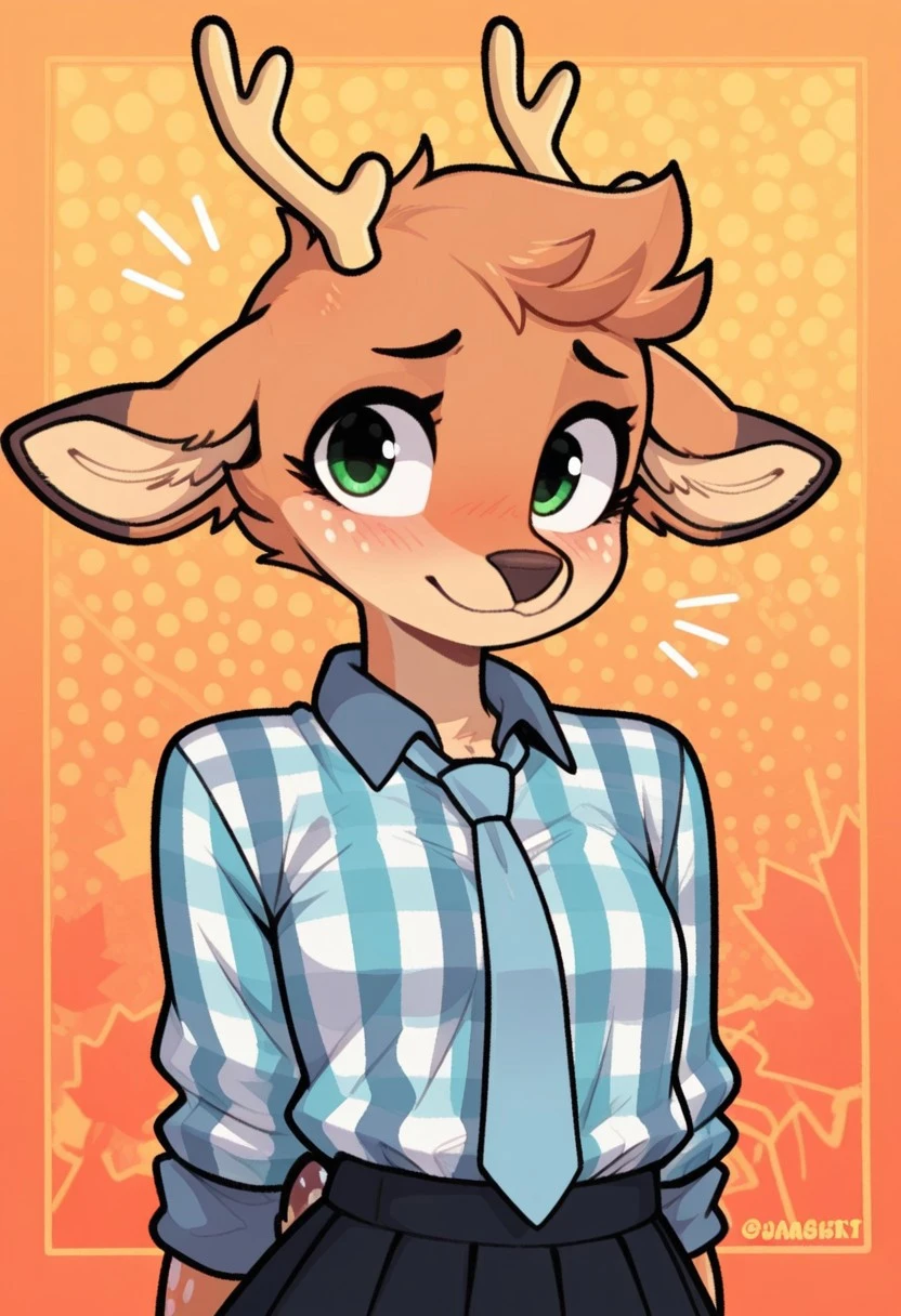 maple, deer, furry female, freckles, deer ears, antlers, blue flannel shirt, necktie, skirt, green eyes