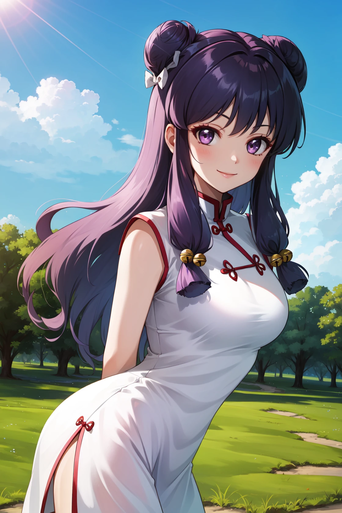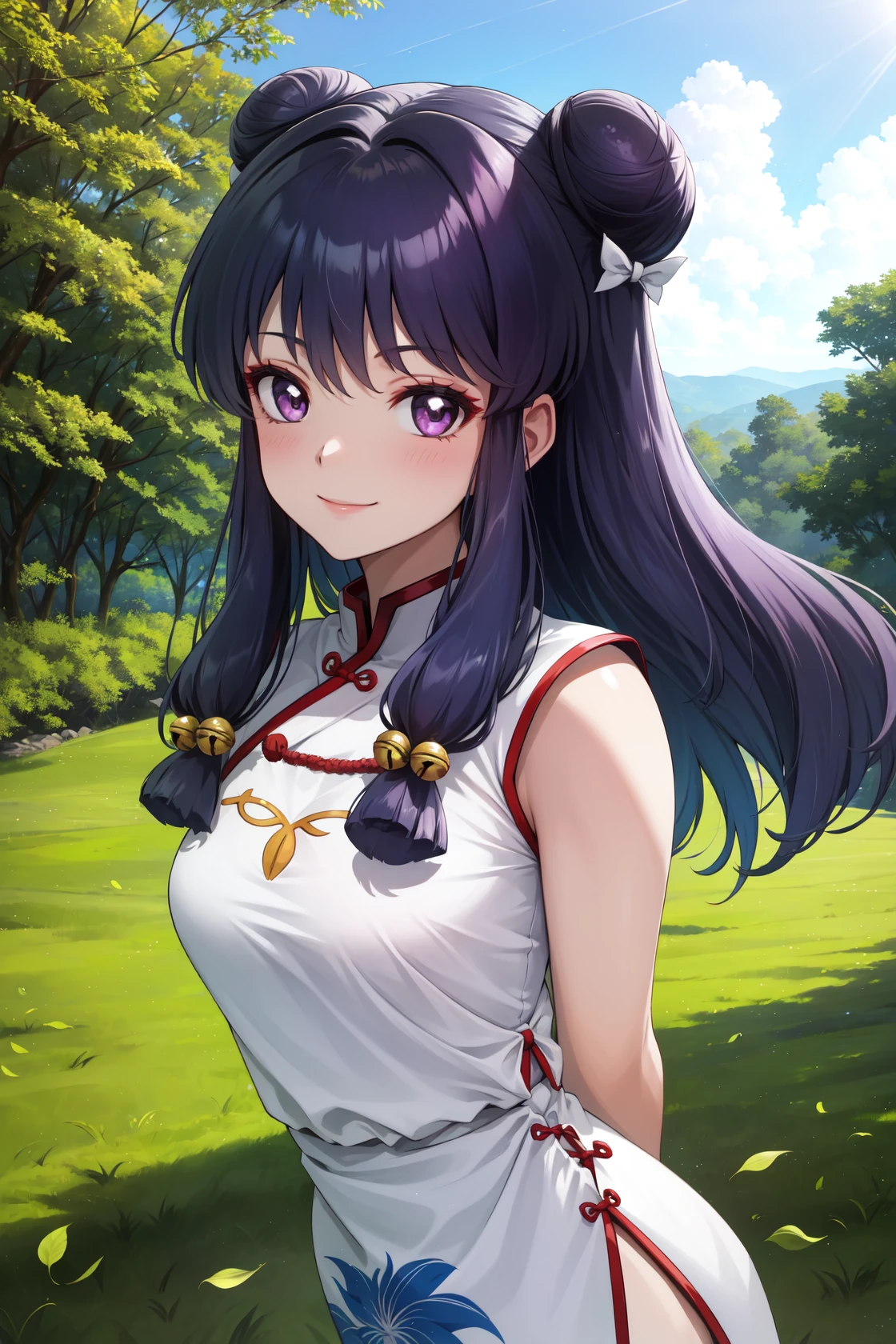 purple eyes, purple hair, hair bun, bell, double bun, jingle bell, long hair, breasts, blush, smile, bangs, hair ornament, bow, sidelocks, shampoo (ranma 1/2)