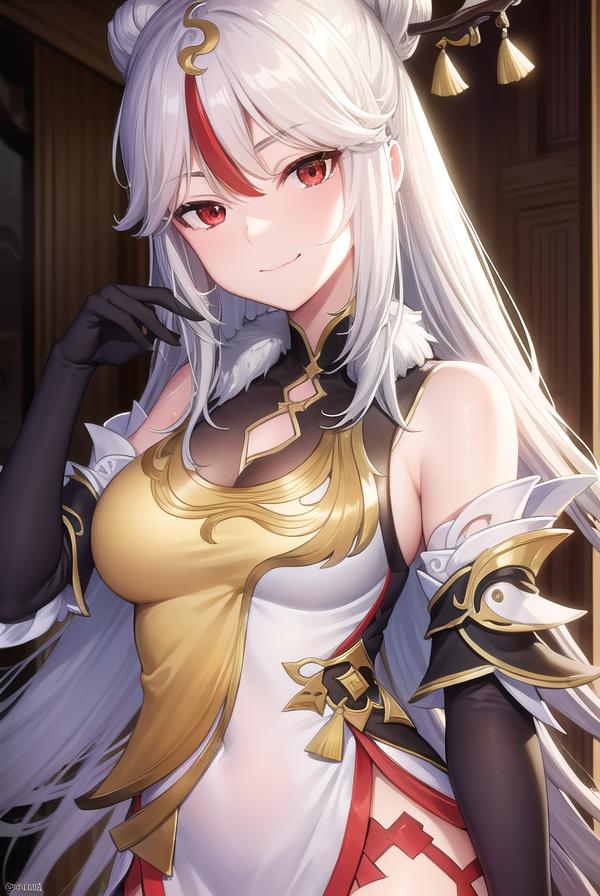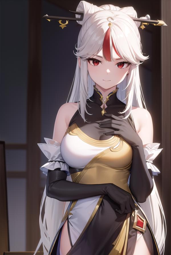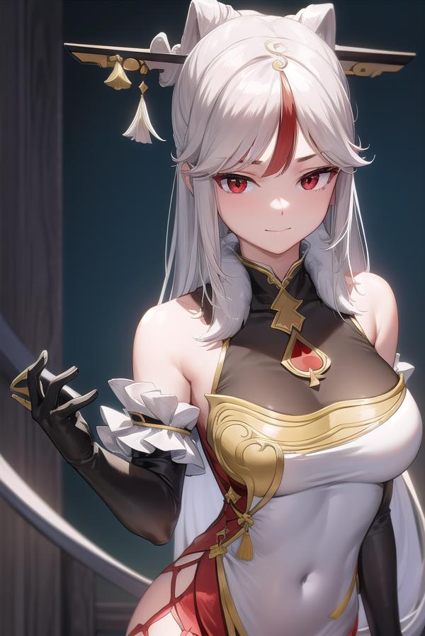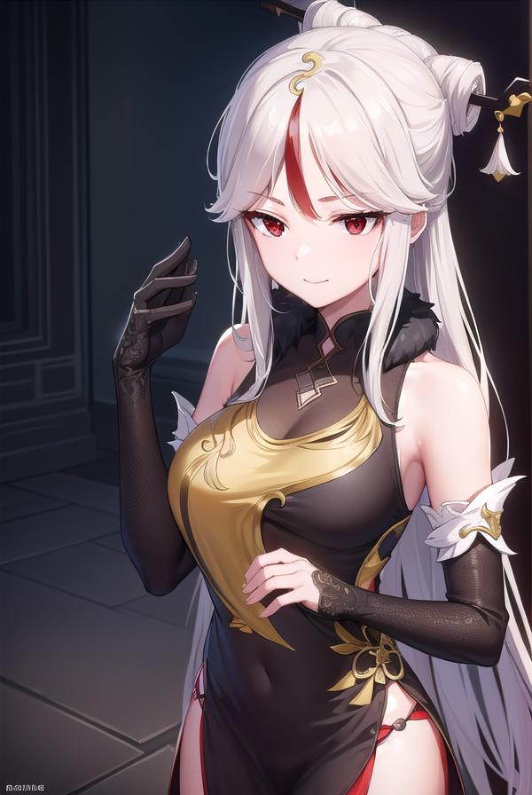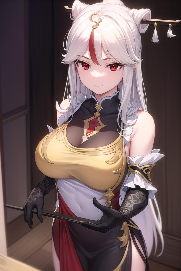 ningguang, grey hair, hair ornament, hairpin, long hair, parted bangs, (red eyes:1.5), sidelocks, streaked hair, red hair,