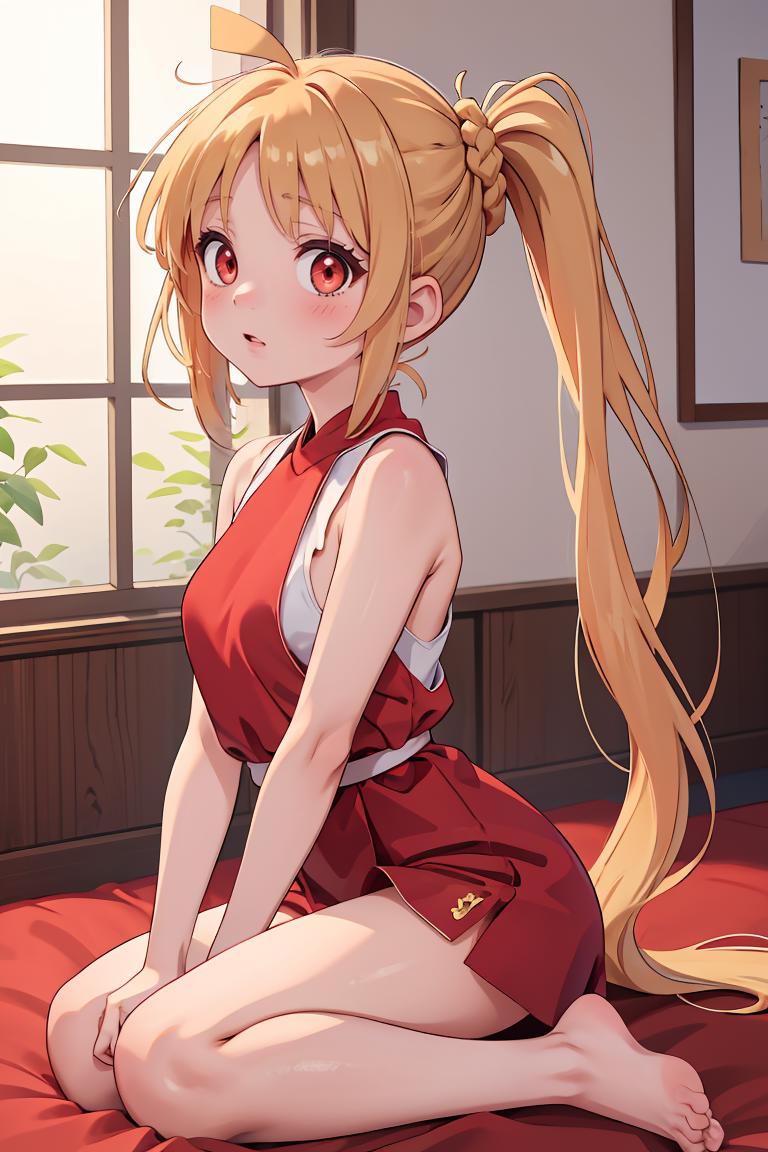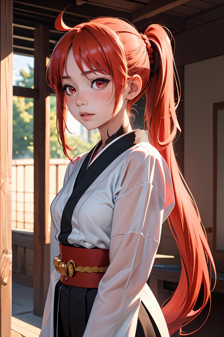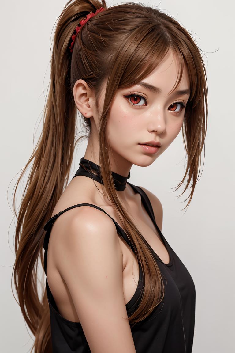 long hair, red eyes,side ponytail