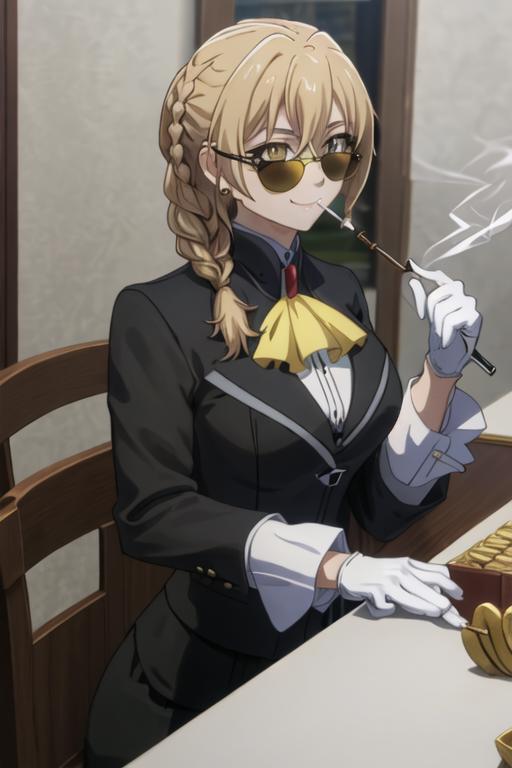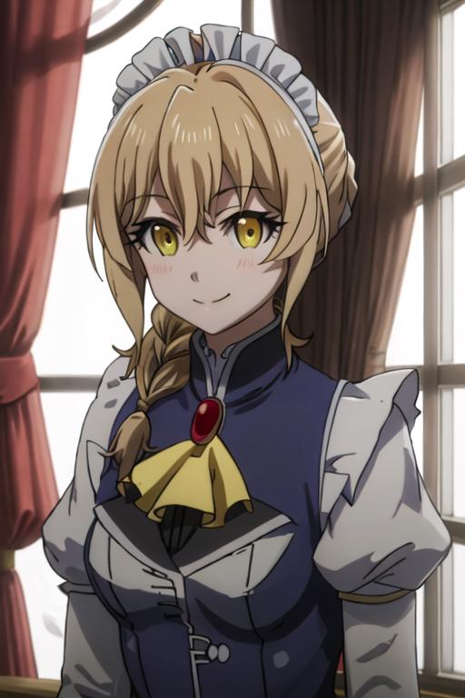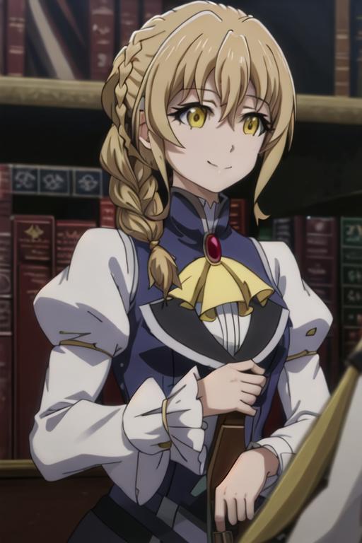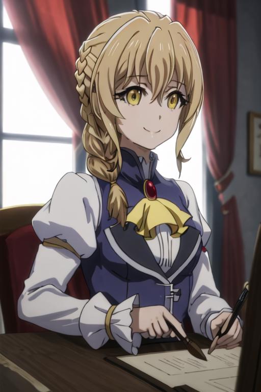 The trigger word is guild_girl_goblinslayer, and the recommended tags are best quality, masterpiece, highres, solo, {guild_girl_goblinslayer:1.15}, blonde_hair, braid, yellow_eyes, long_hair, ascot, hair_between_eyes, smile, anime_coloring.
