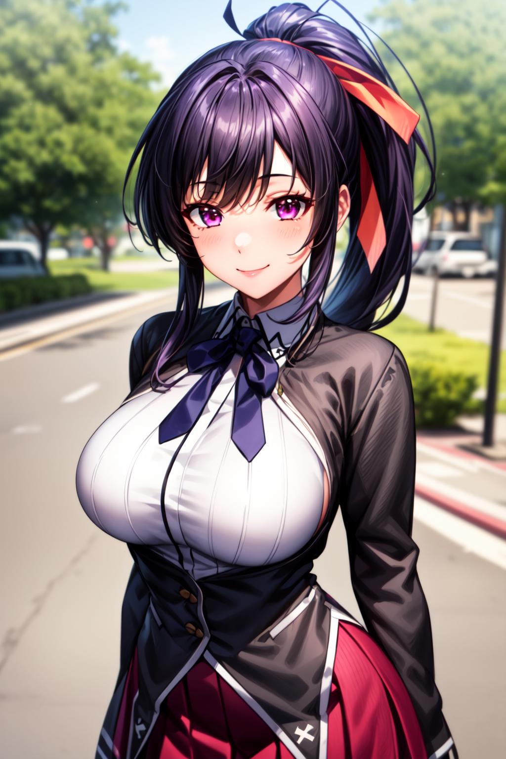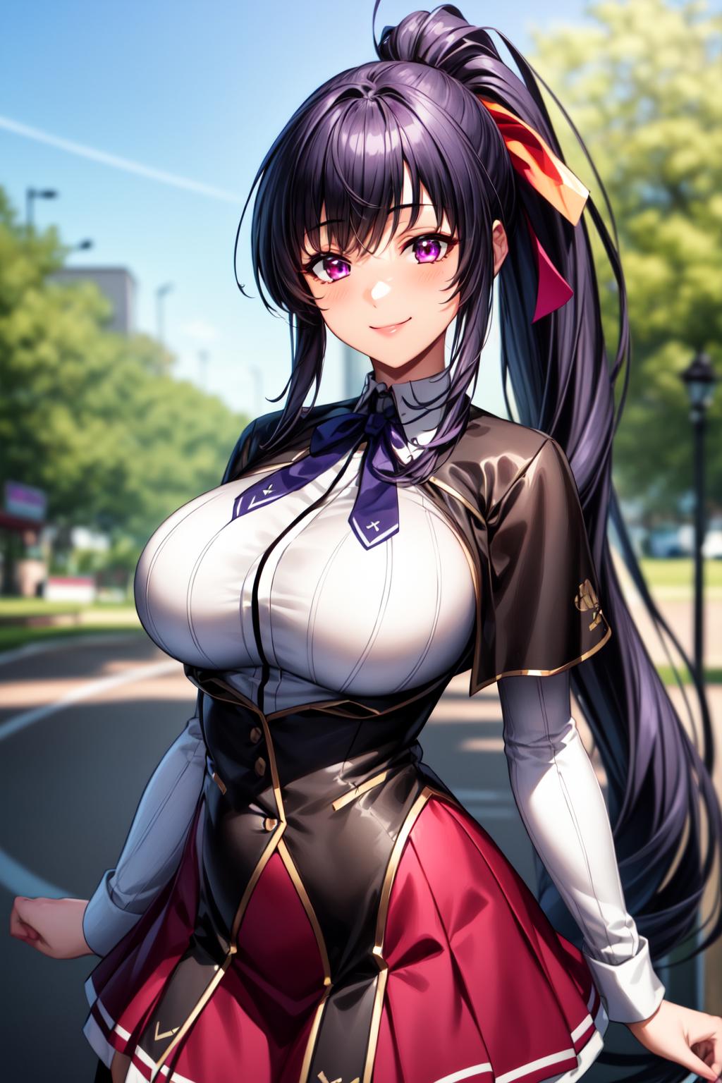 HimejimaAkenoNDV, 1girl, black hair, ?????????????, very long hair, purple eyes, red skirt, school uniform, shirt, corset, ponytail, hair ribbon, ribbonBest weight: 0.6-0.8