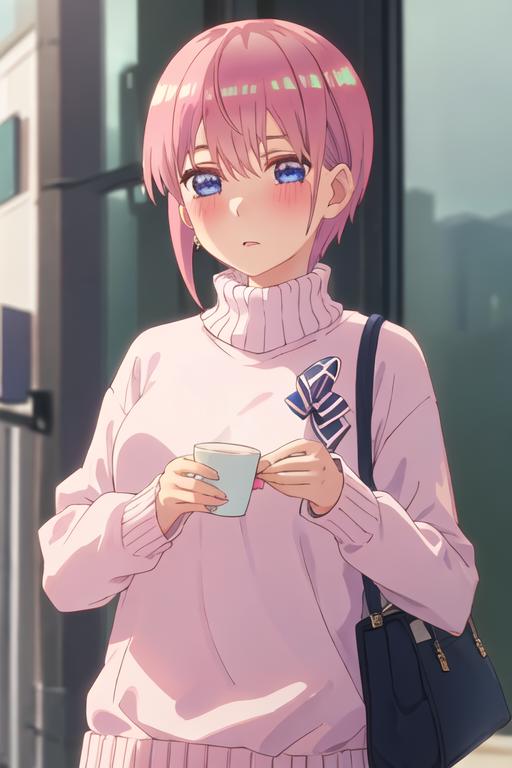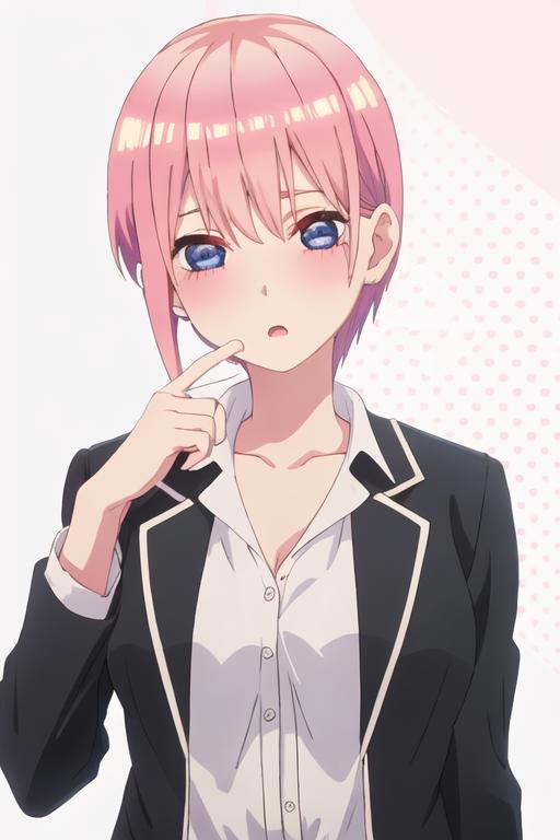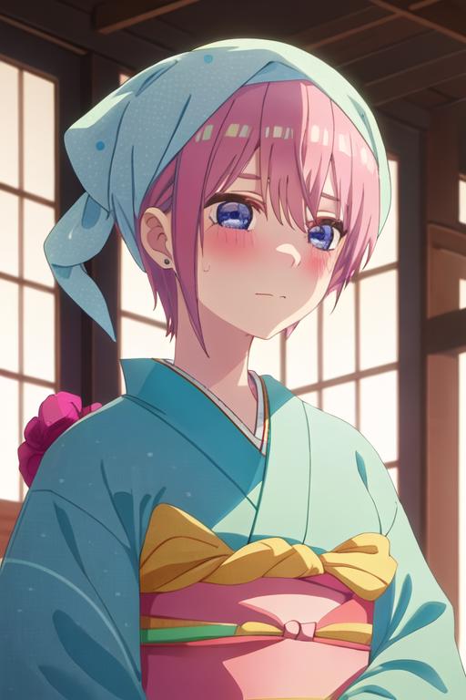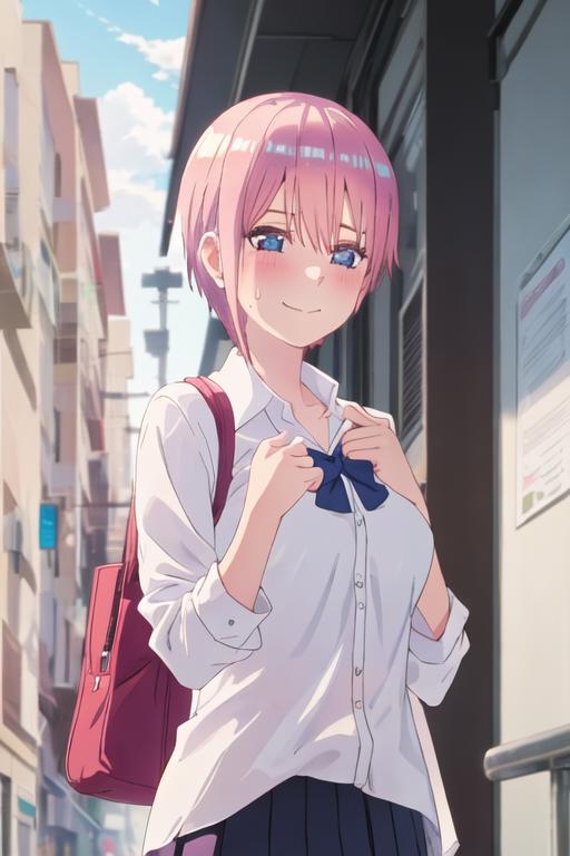 The trigger word is nakano_ichika_gotoubunnohanayome, and the recommended tags are best quality, masterpiece, highres, solo, {nakano_ichika_gotoubunnohanayome:1.15}, pink_hair, short_hair, bangs, blue_eyes, blush, hair_between_eyes, closed_mouth.