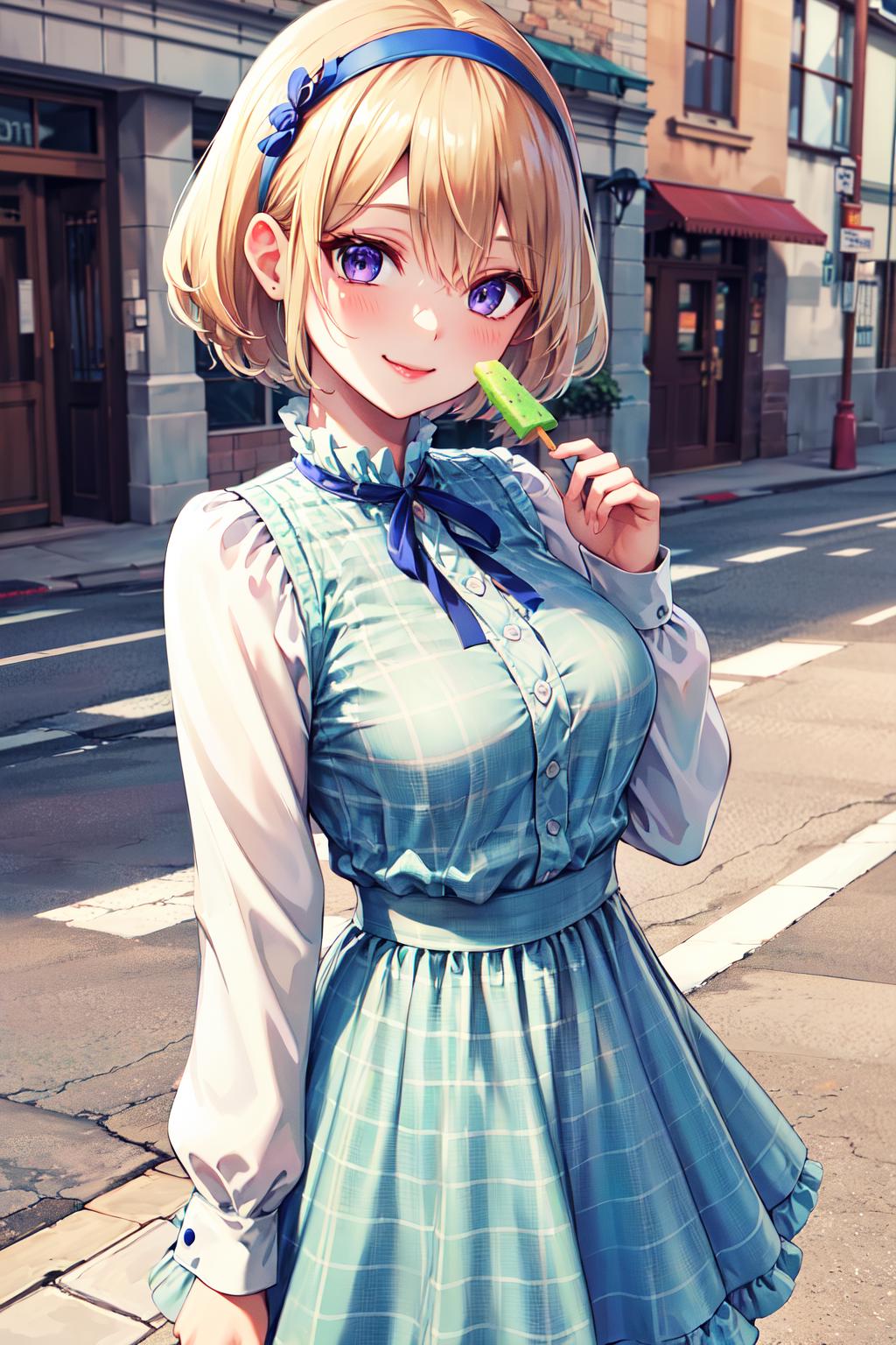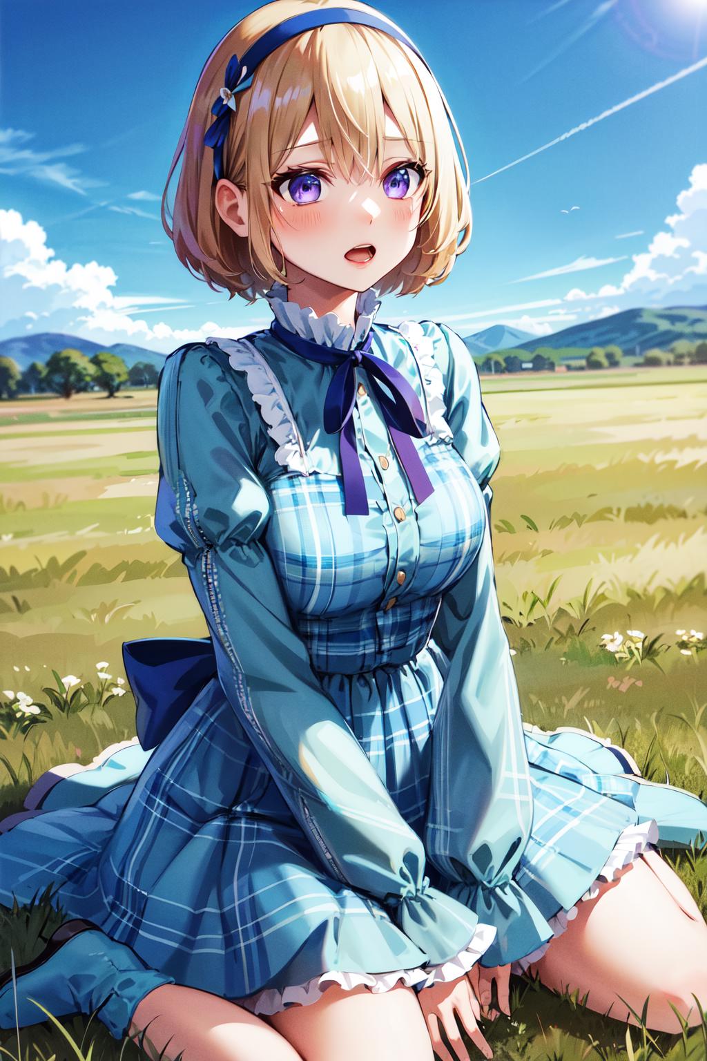 outfit2us1, blonde hair, purple eyes, hairband, long sleeves, blue hairband, blue dress, frills, shirt, neck ribbon, blue ribbon, plaid