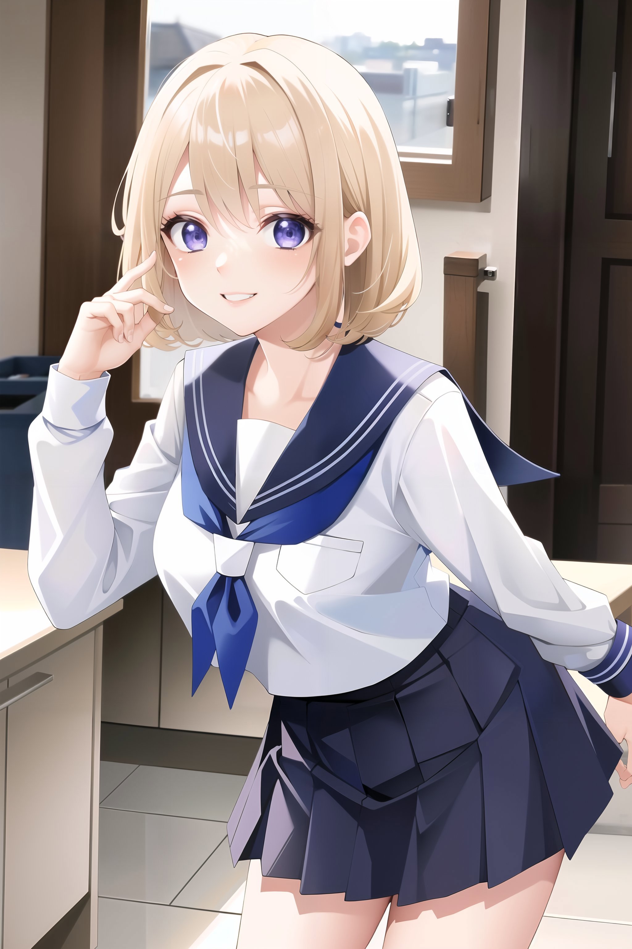 outfit1us1, blonde hair, purple eyes, school uniform, white shirt, blue skirt, neckerchief, white socks, pleated skirt, long sleeves