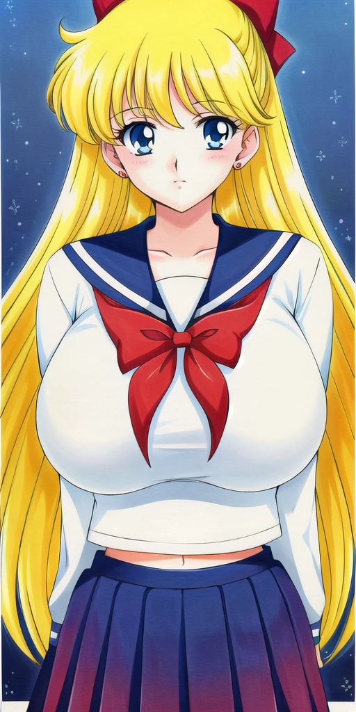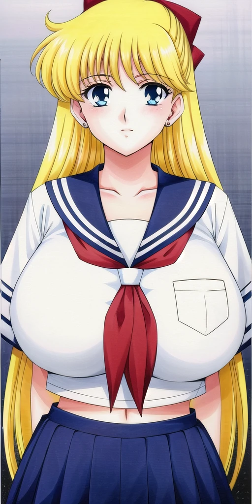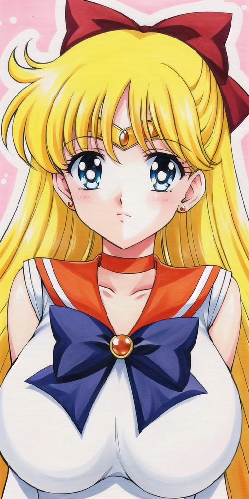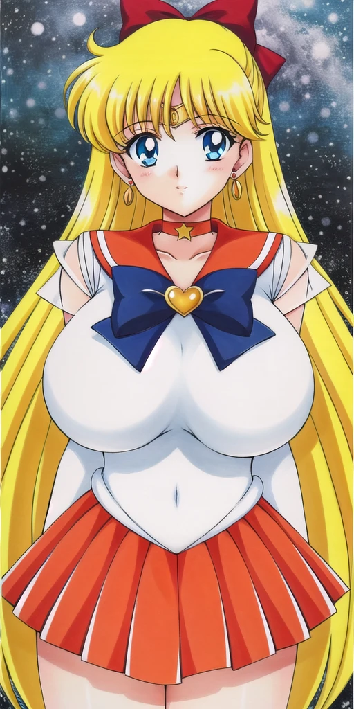 White_leotard_Orange_sailor_collar_Orange_miniskirt_White_gloves_Orange_choker_Blue_bowtie_Yellow_back_bow_Circlet_Yellow_brooch_Short_sleeves: Her sailor venus uniform.