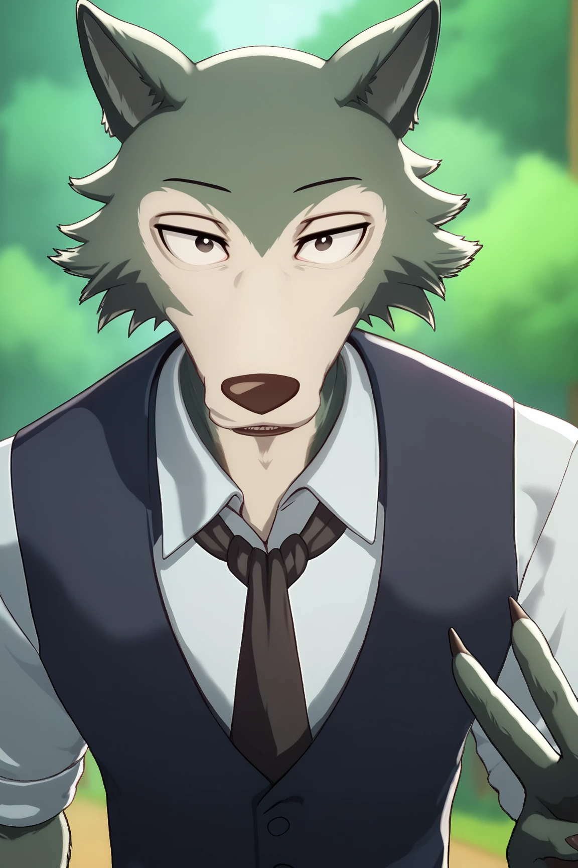 LegoshiBPXL, anthro furry, furry male, body fur, grey fur, black eyes, animal ears, wolf ears, pectorals, blue vest, collared shirt, white shirt, black necktie, vertical stripes, grey pants, brown shoes