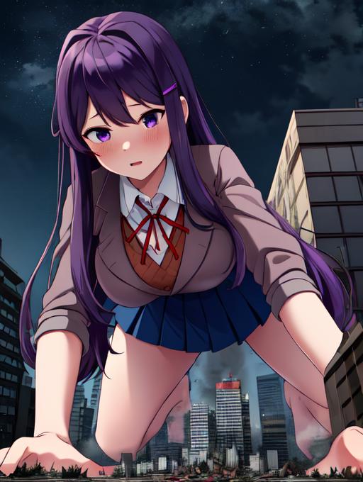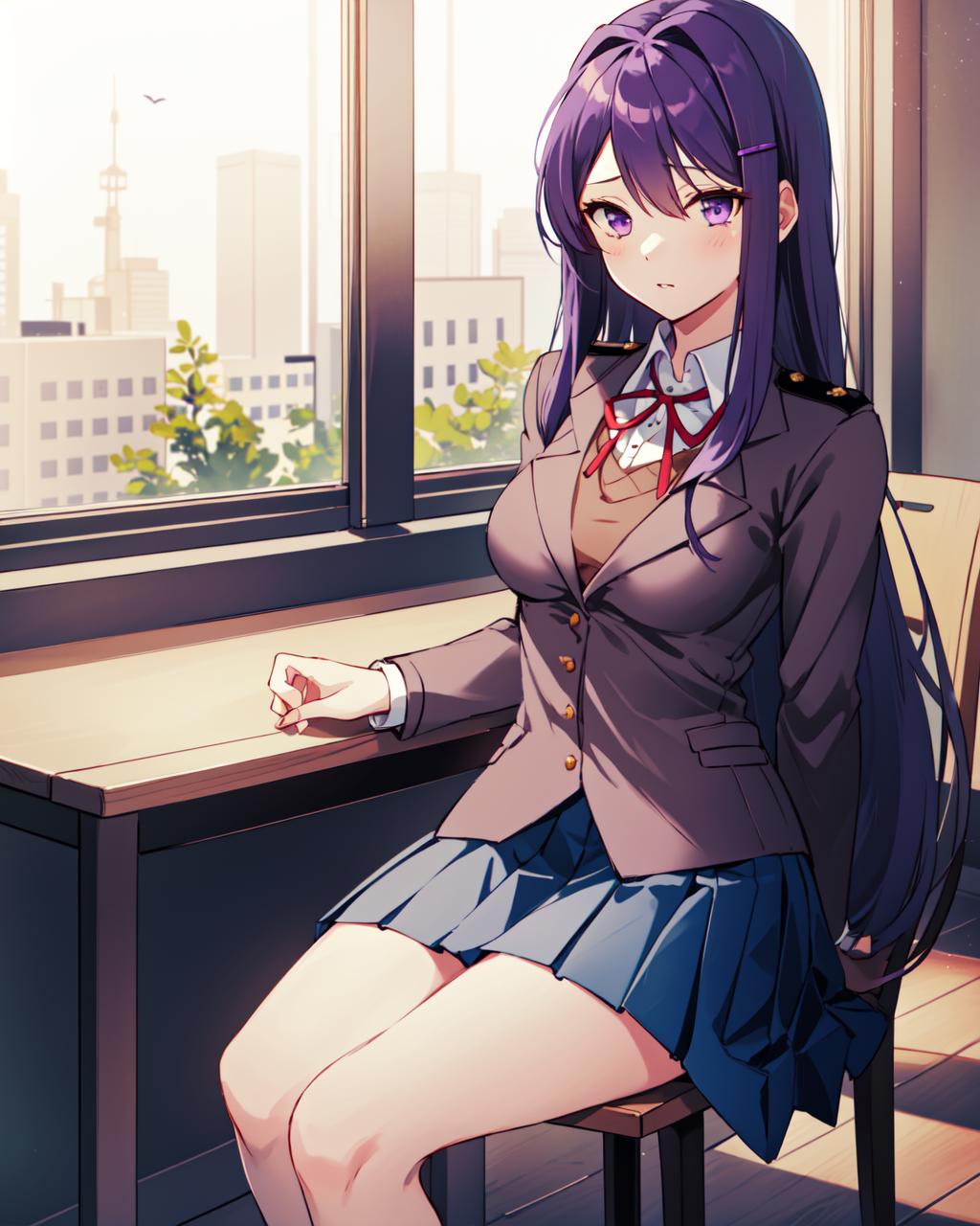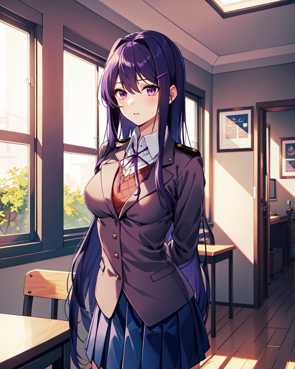 To summon Yuri: Yuri, purple eyes, hair ornament, hairclip, pleated skirt, skirt, purple hair, blue skirt, long hair, ??????????????, 1girl, jacket, very long hair, school uniform