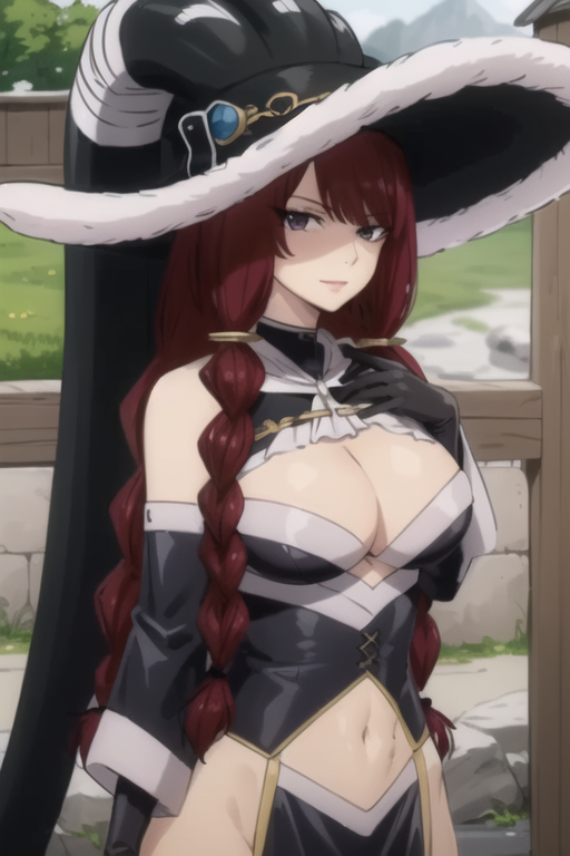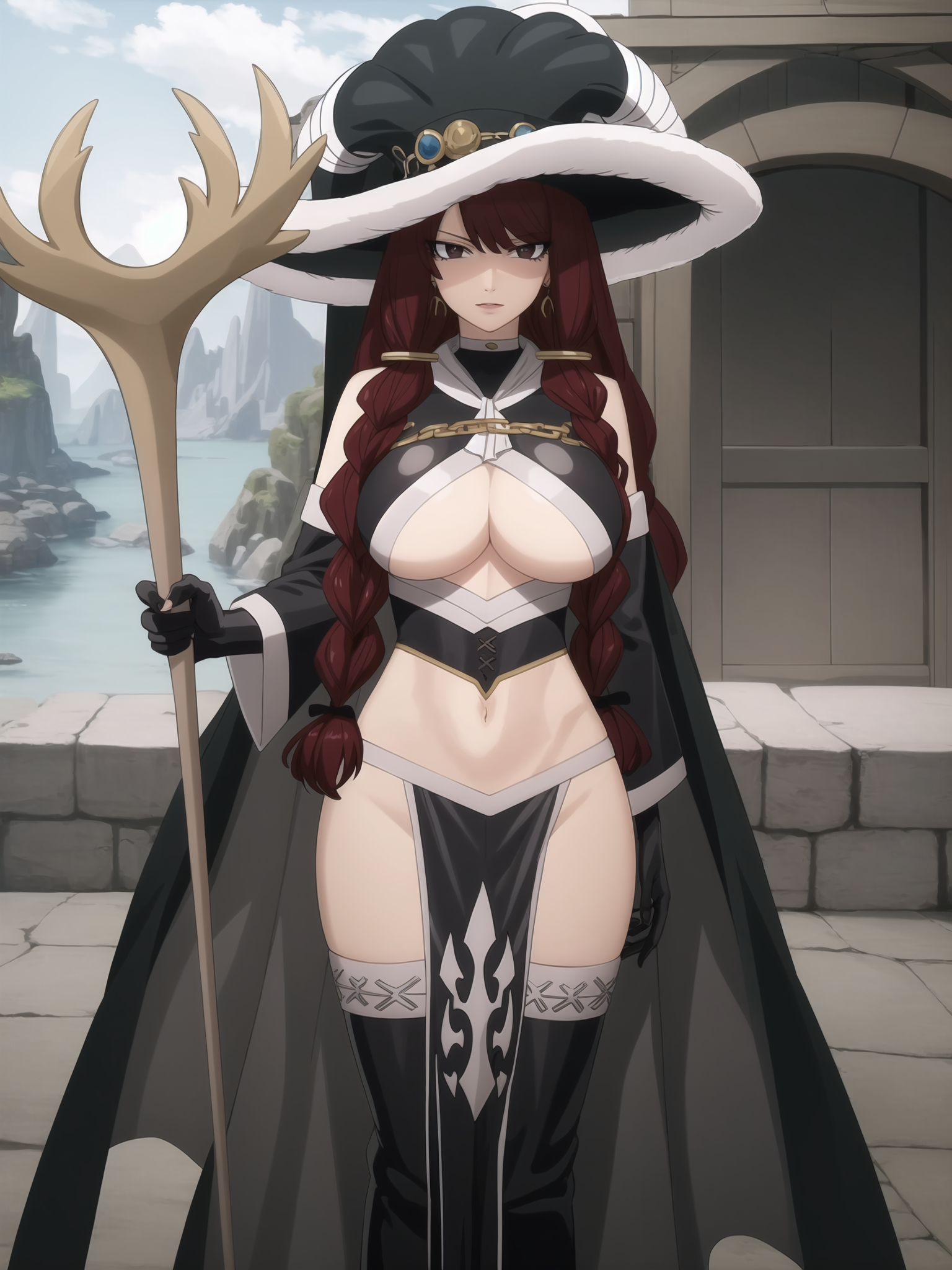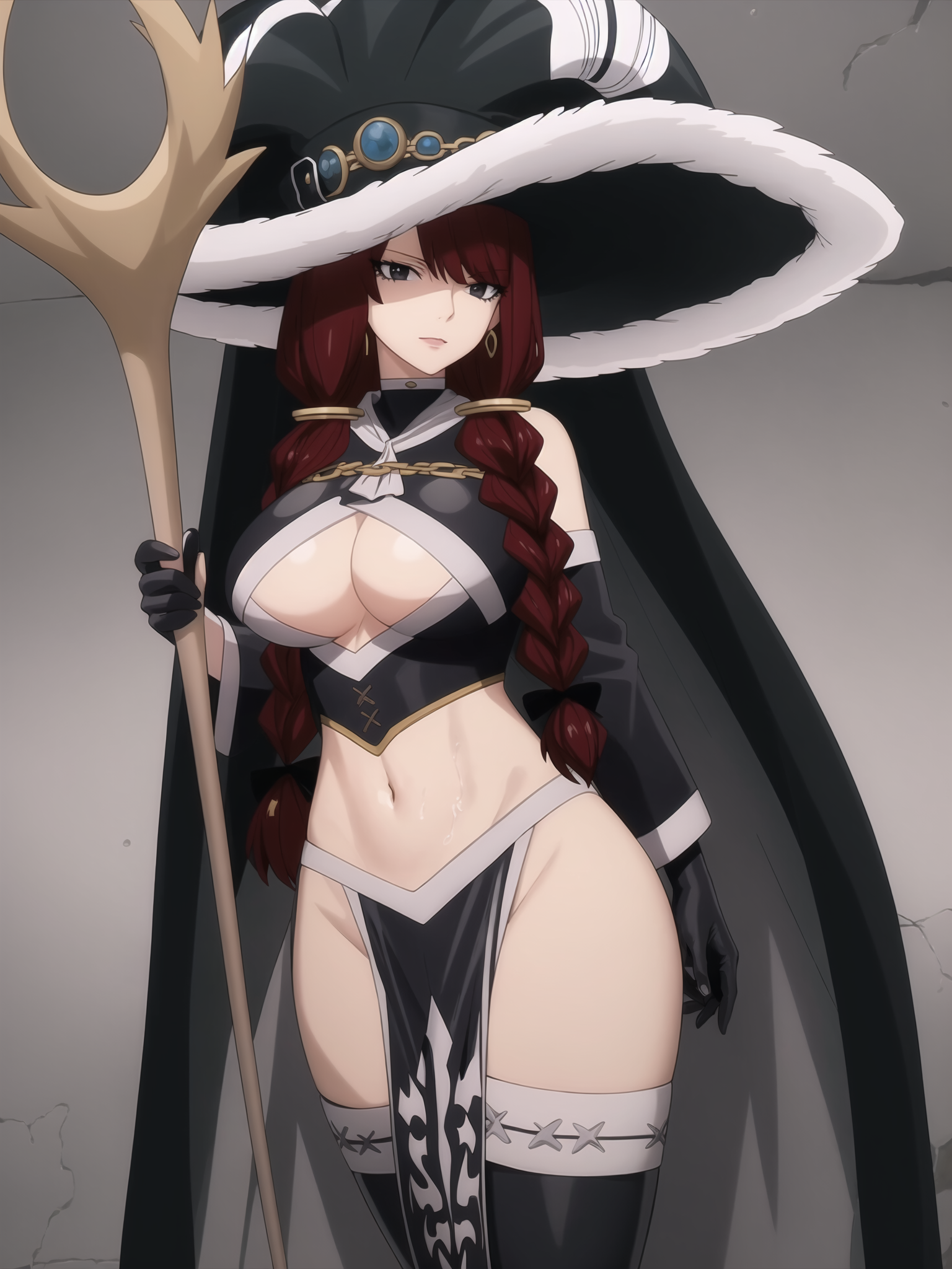 gloves, hat, witch hat, holding, black gloves, staff, holding staff, pelvic curtain, thighhighs,