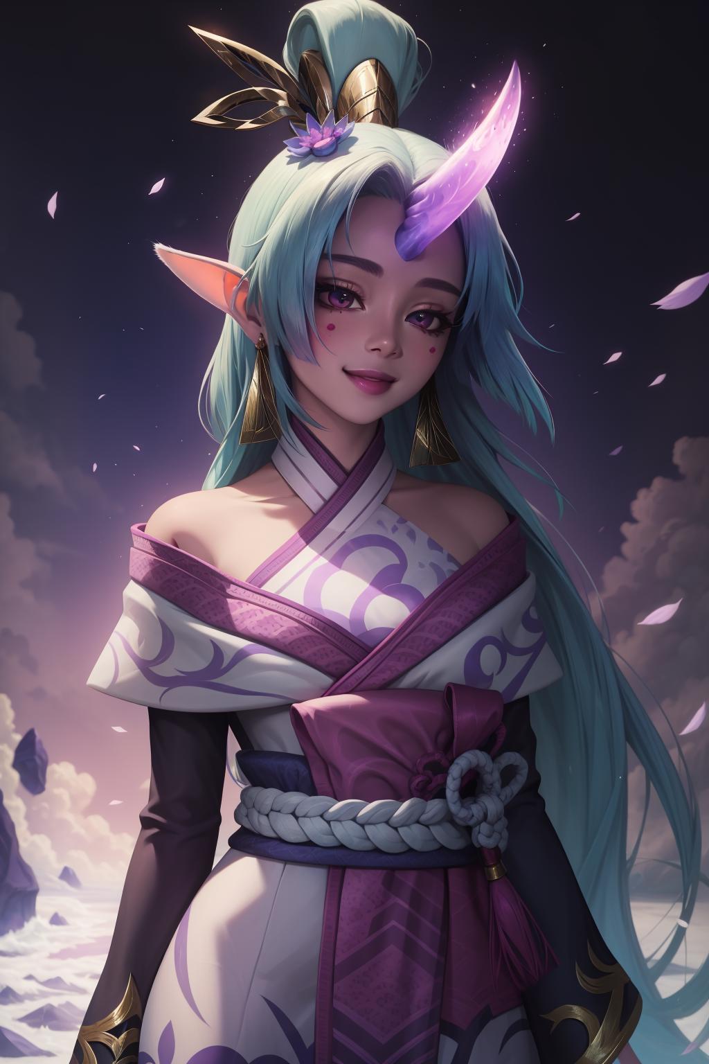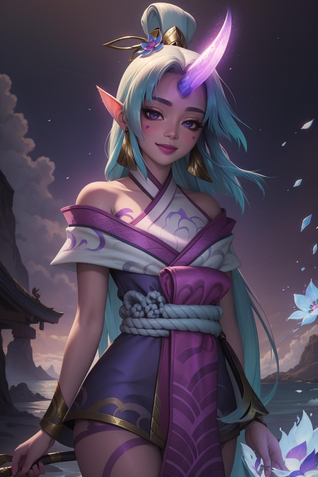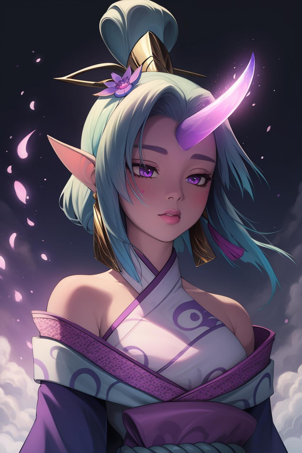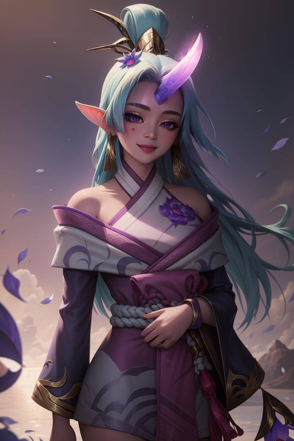 spirit blossom soraka, 1girl, purple skin, colored skin, single horn, kimono, hair ornament, shoulders, long hair