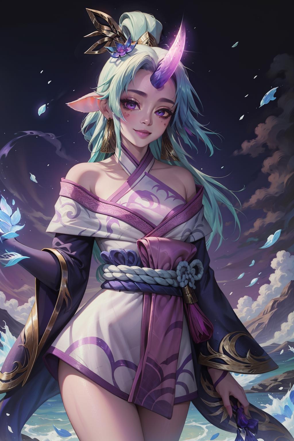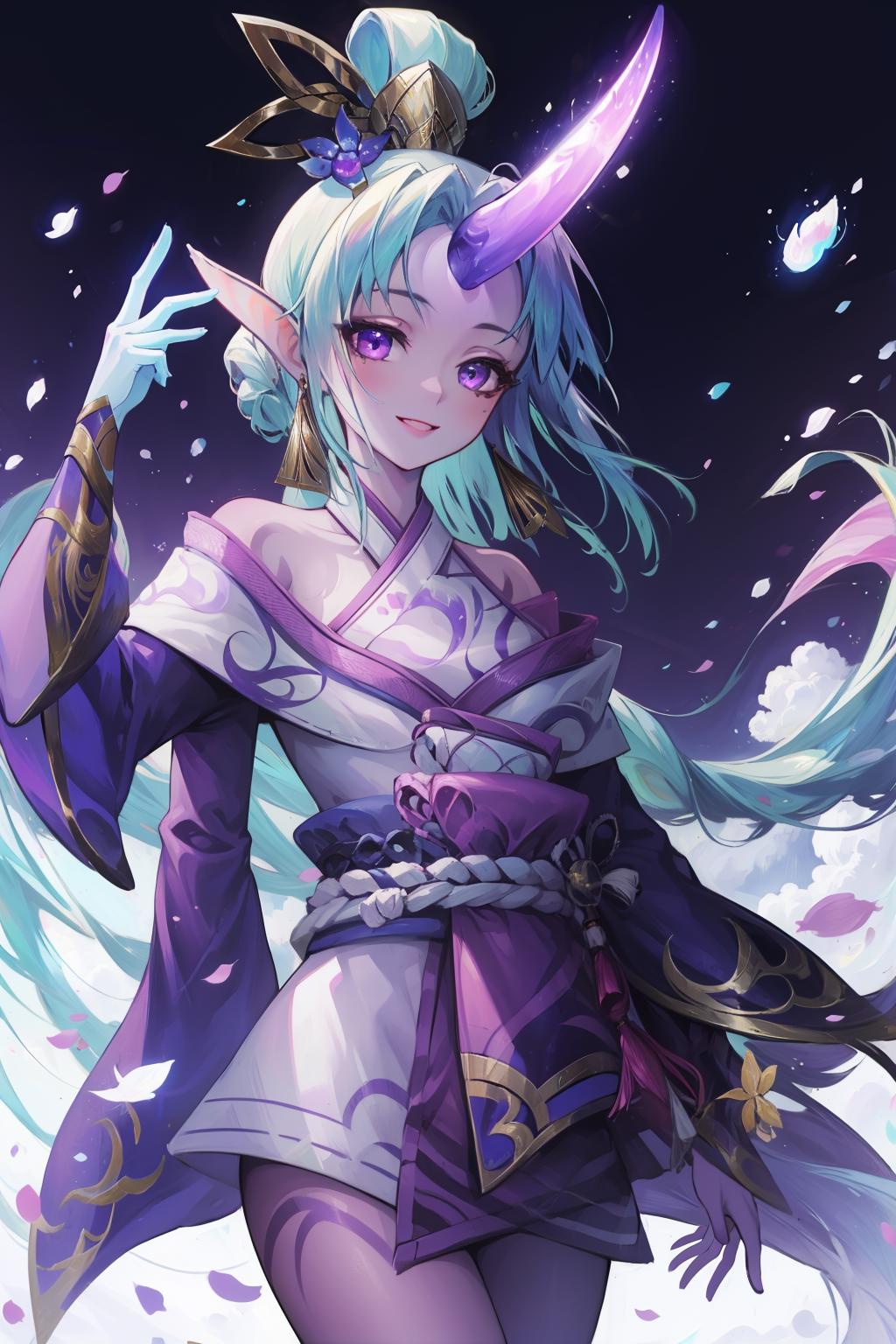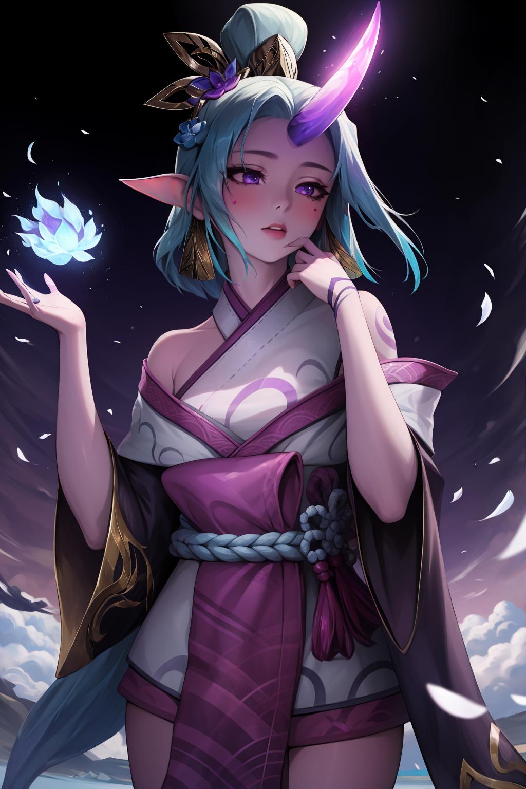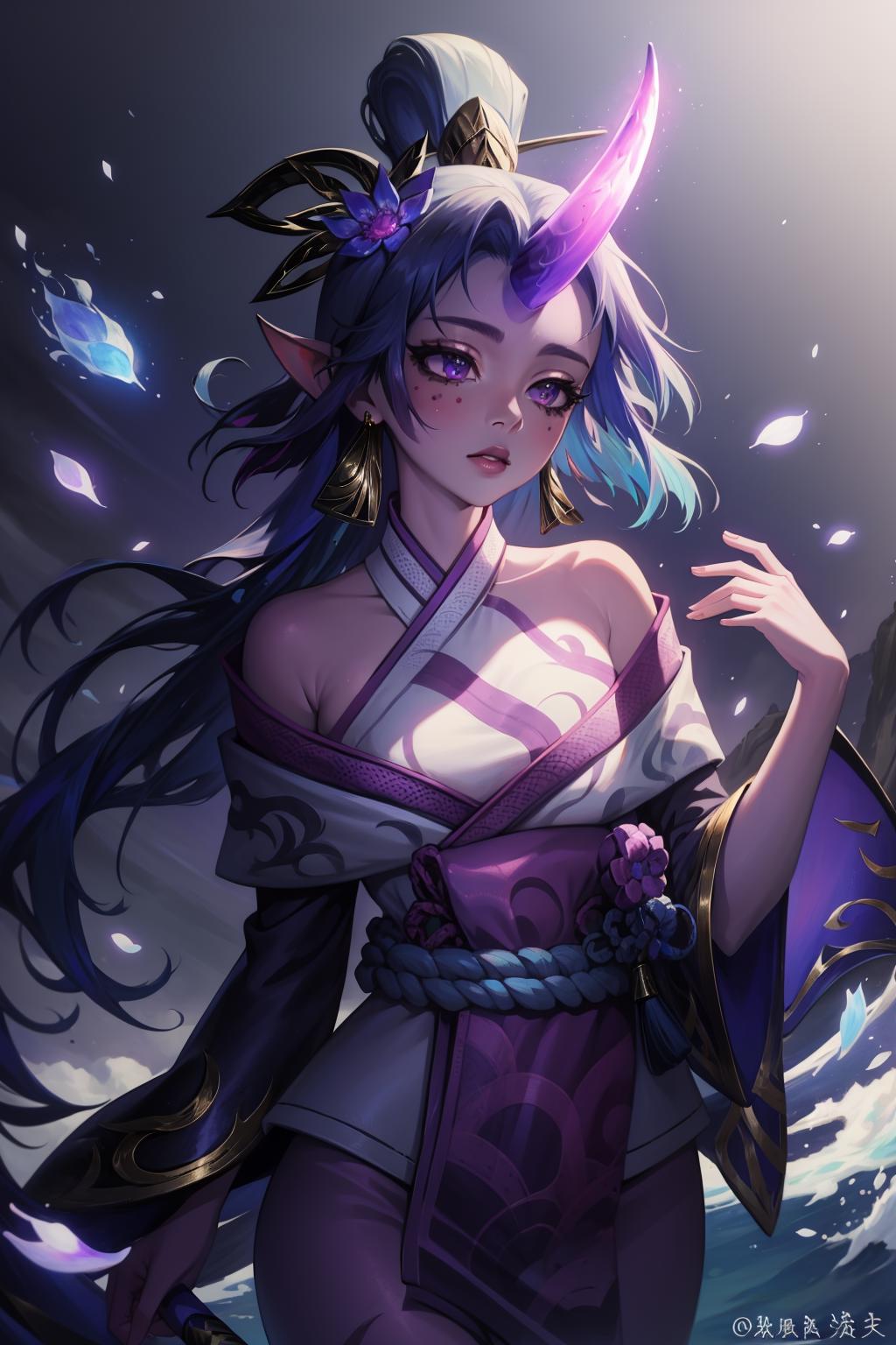 spirit blossom soraka, 1girl, purple skin, colored skin, single horn, kimono, hair ornament, shoulders, long hair