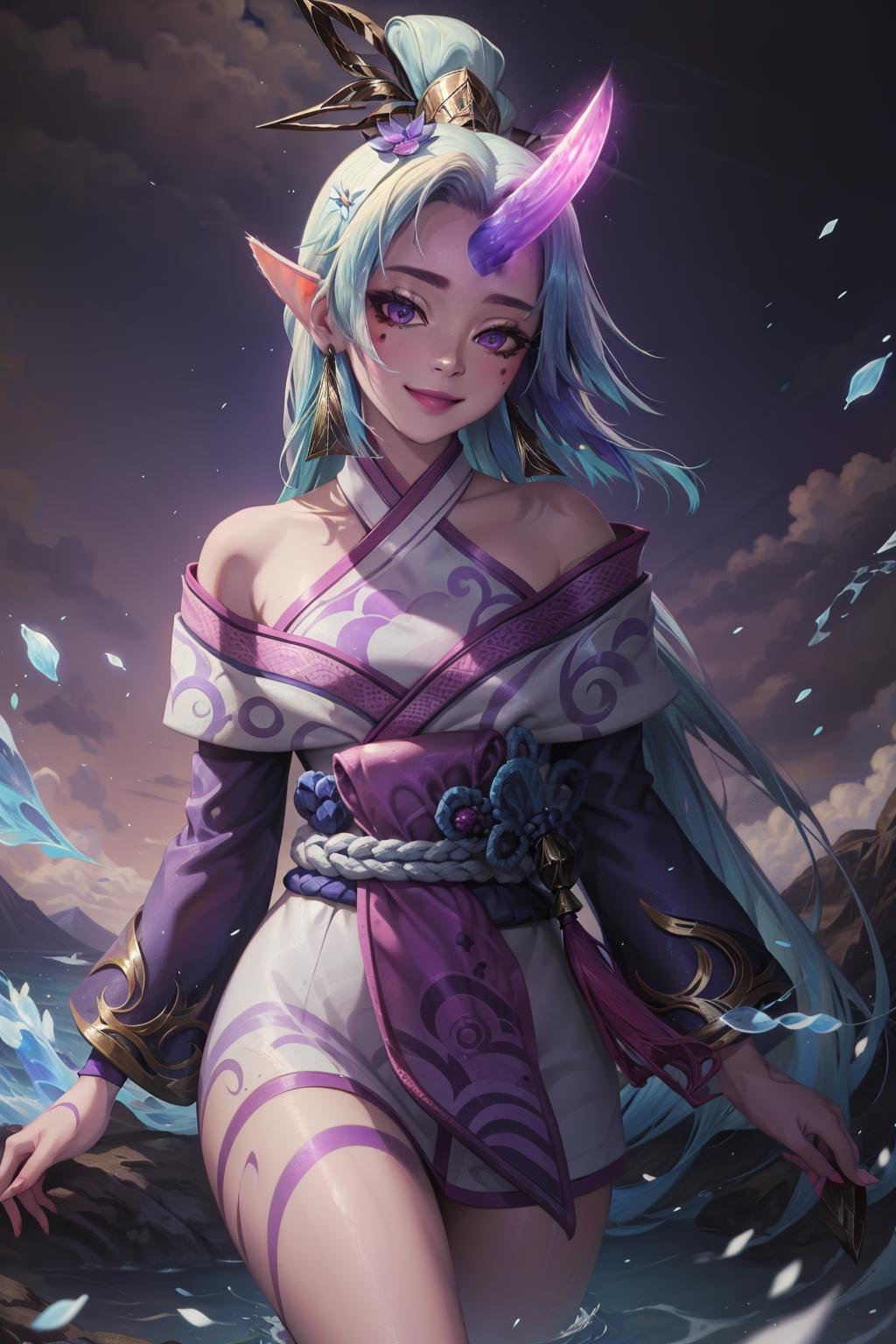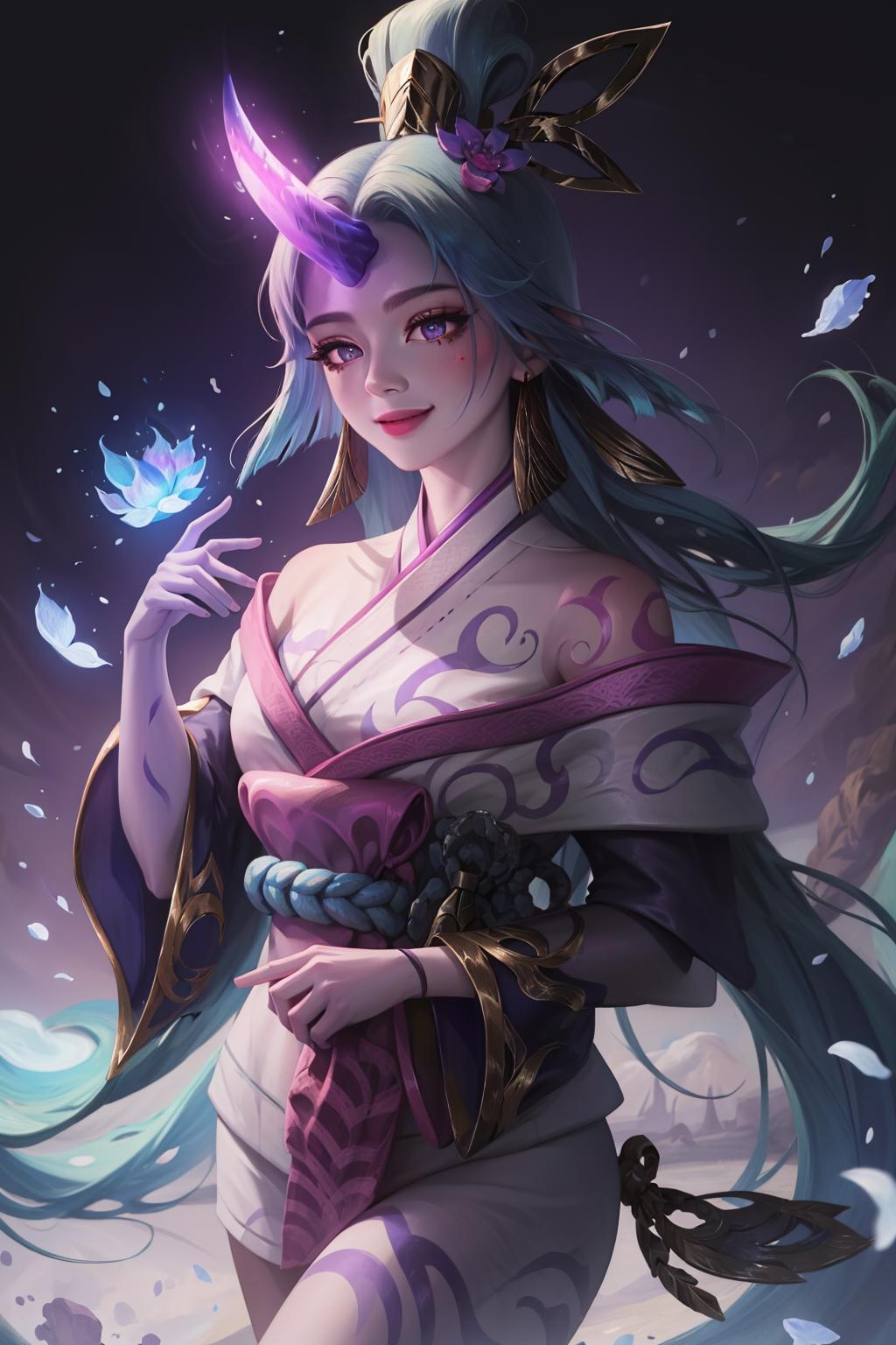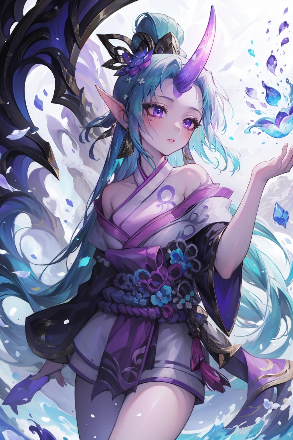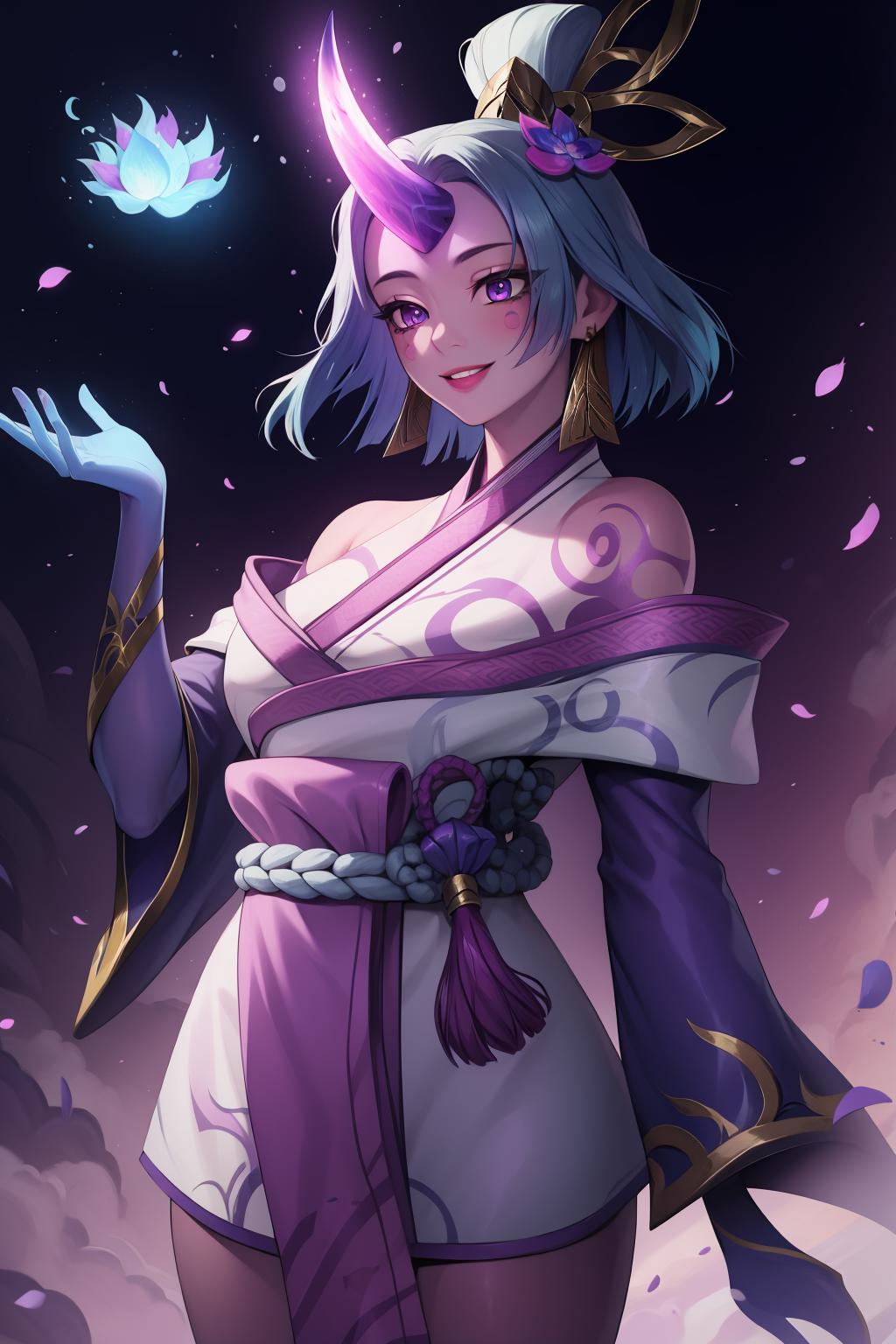spirit blossom soraka, 1girl, purple skin, colored skin, single horn, kimono, hair ornament, shoulders, long hair