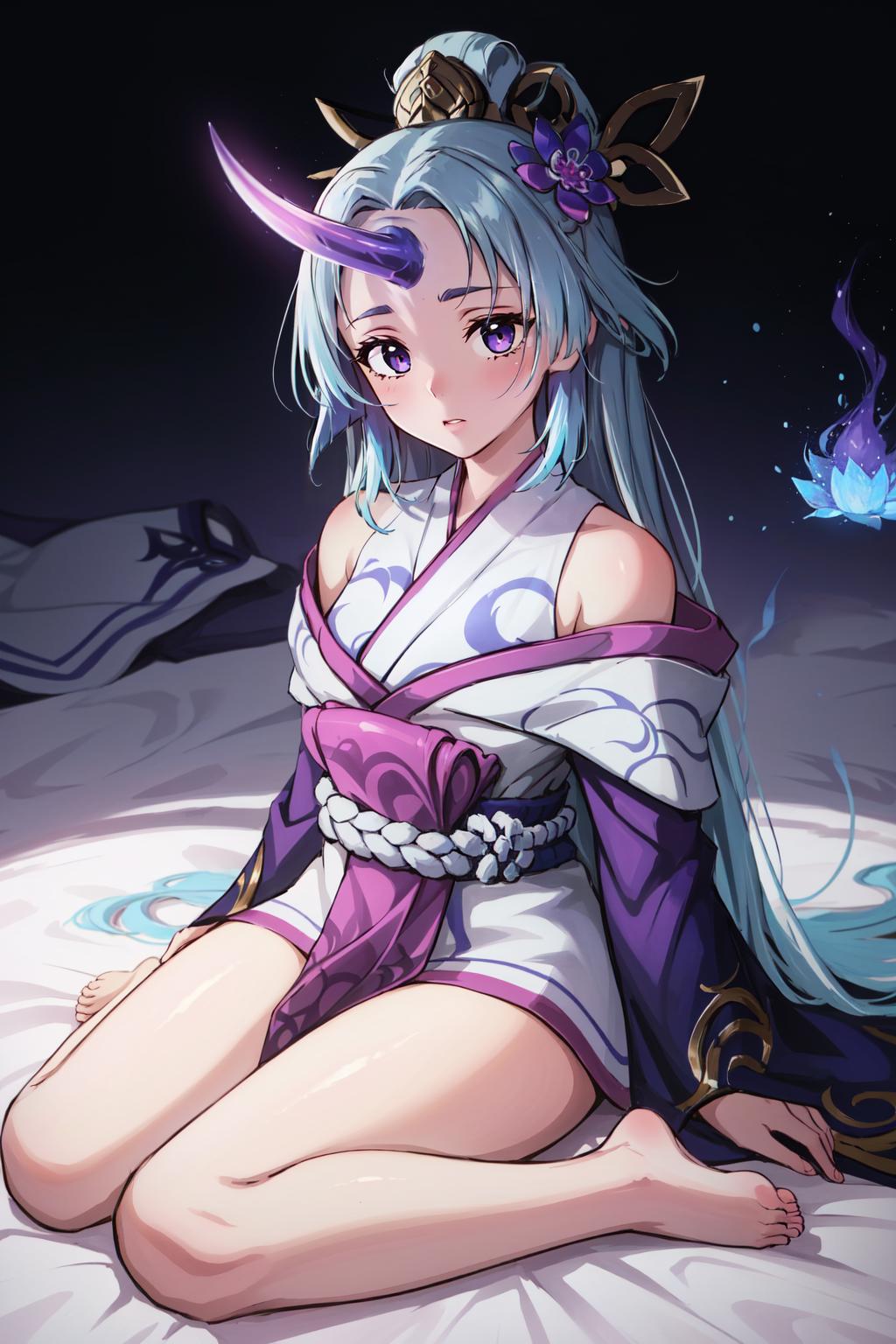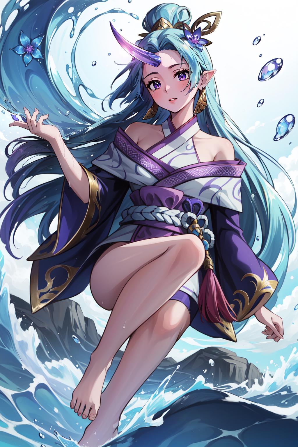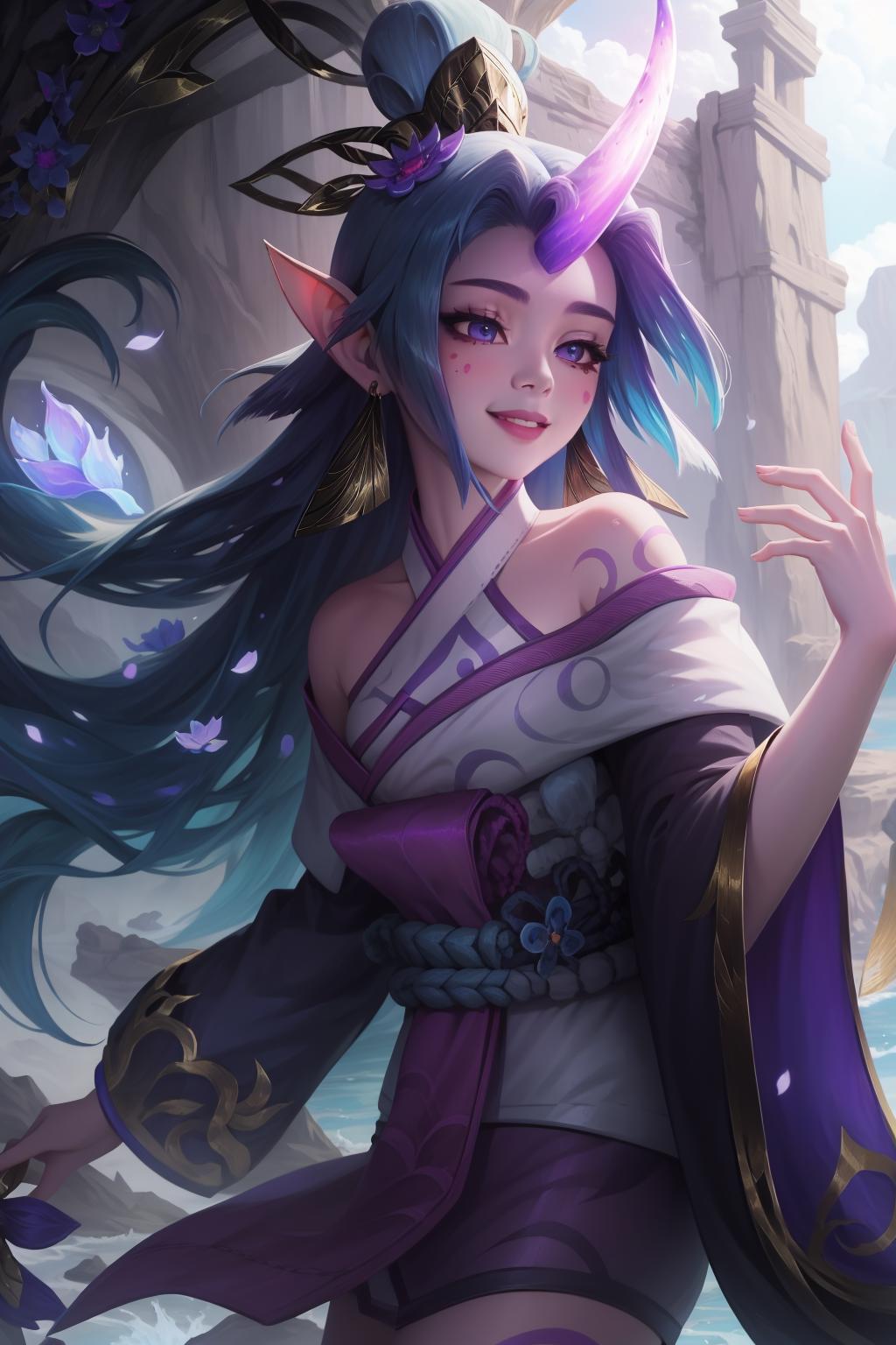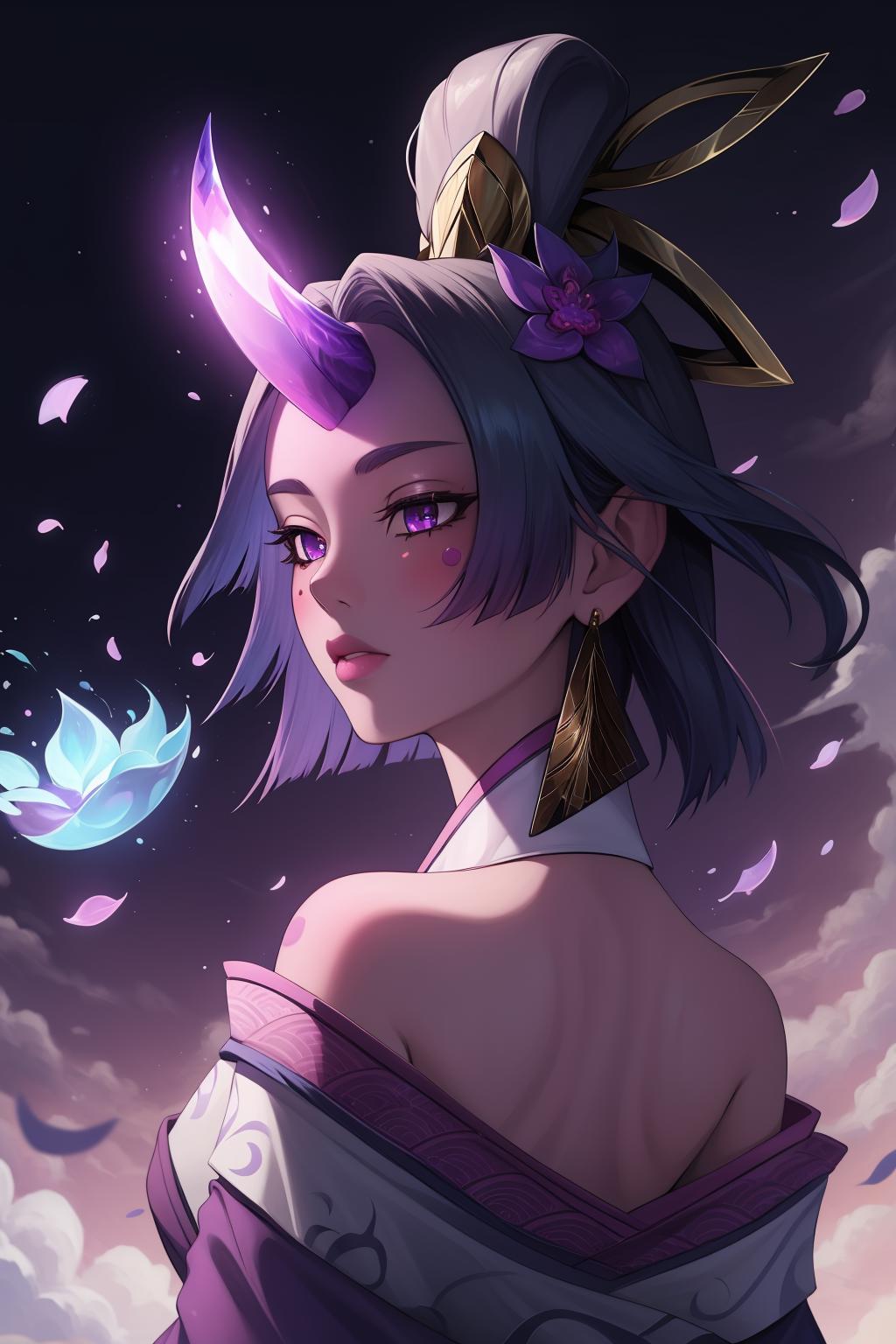 spirit blossom soraka, 1girl, purple skin, colored skin, single horn, kimono, hair ornament, shoulders, long hair