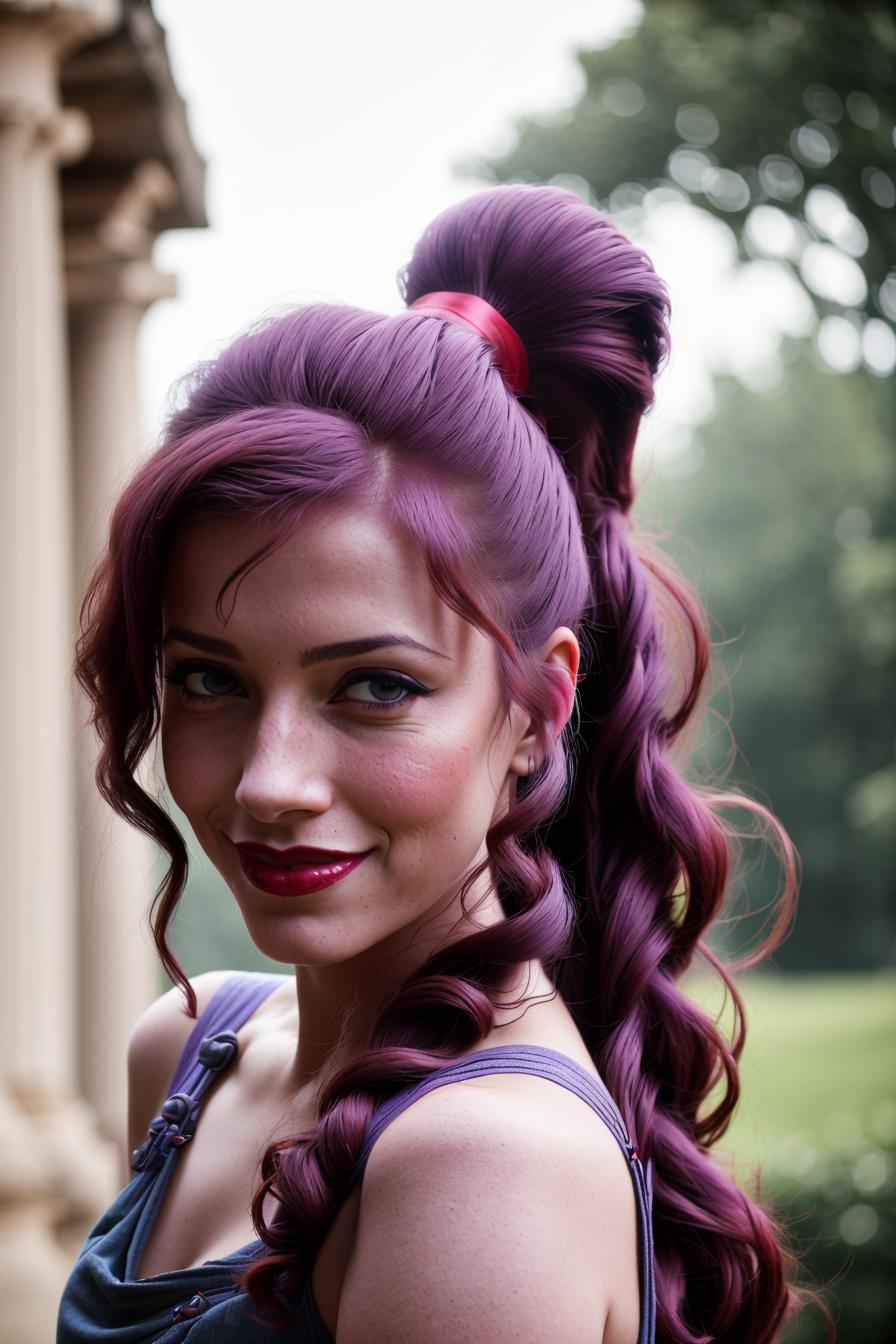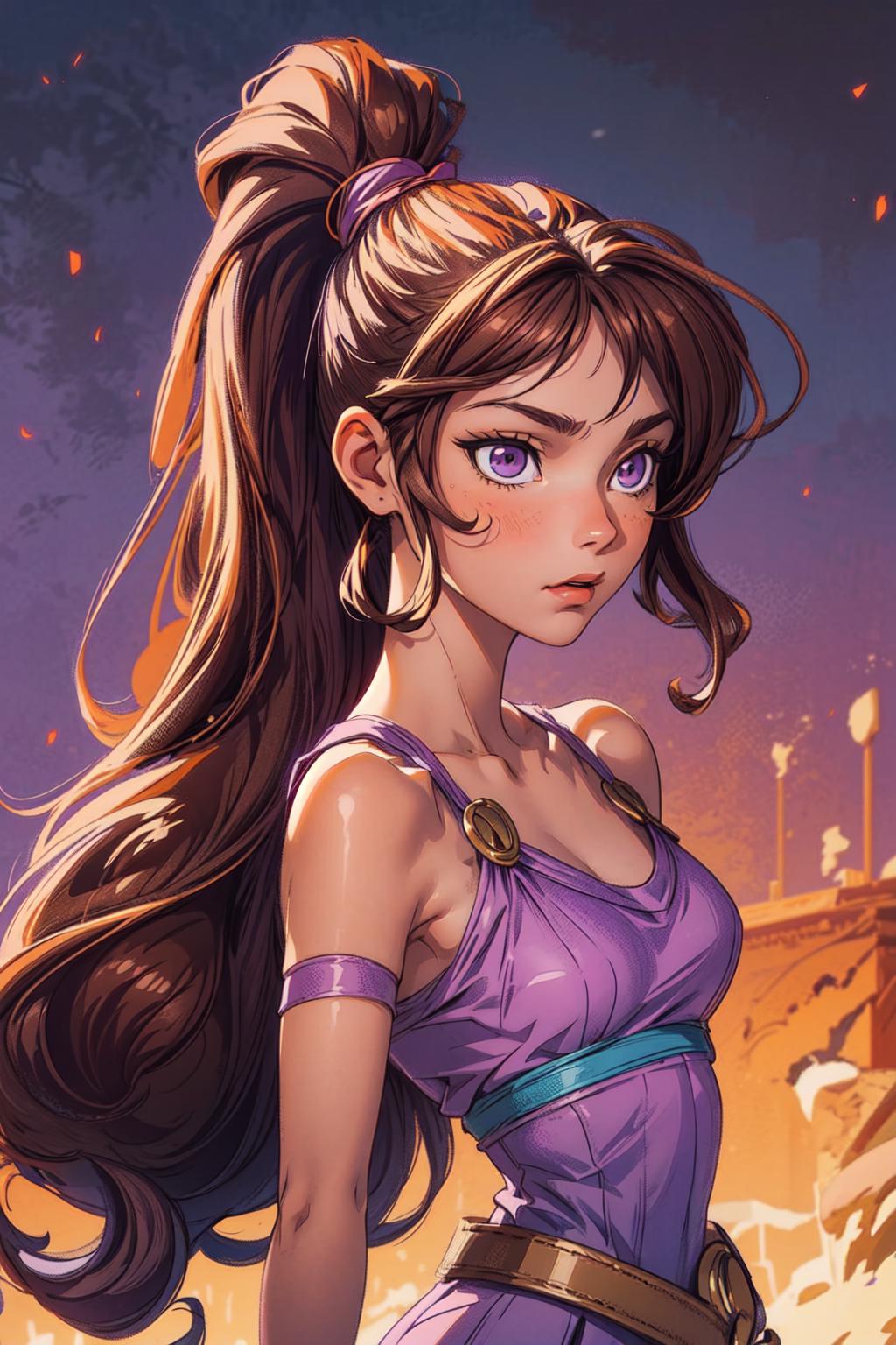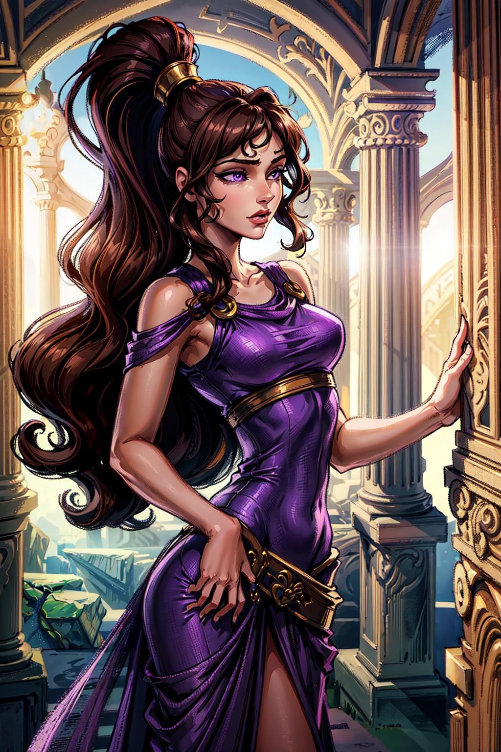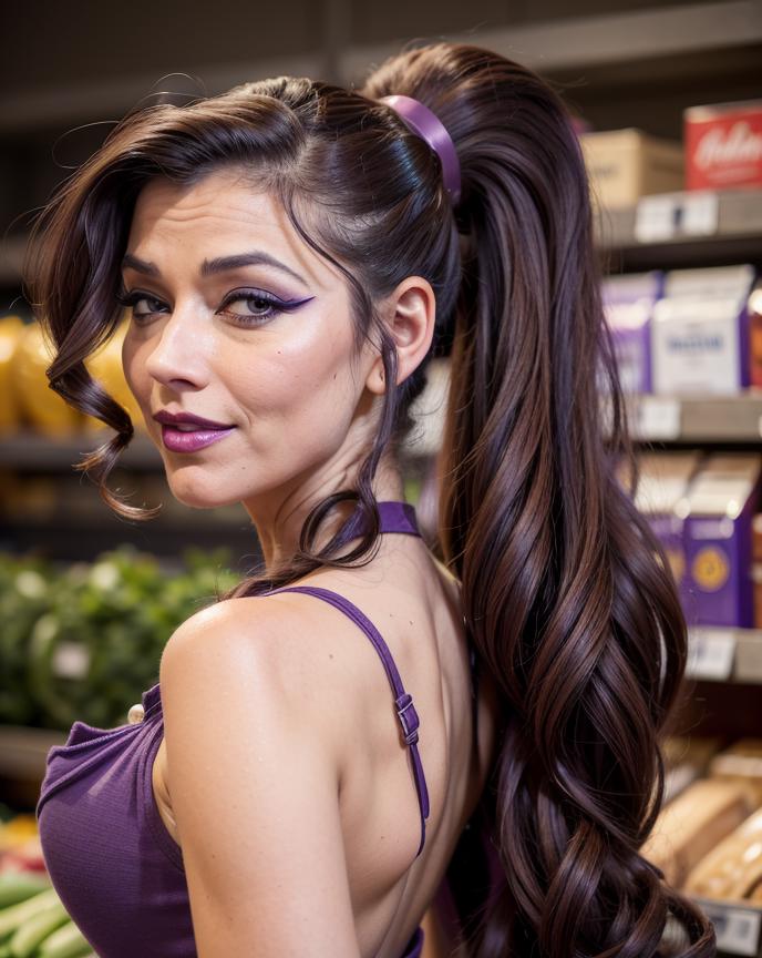 Classic outfit: ponytail, long hair, ???? shoulders, long purple dress