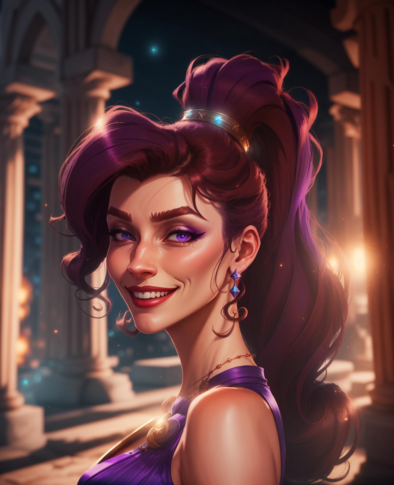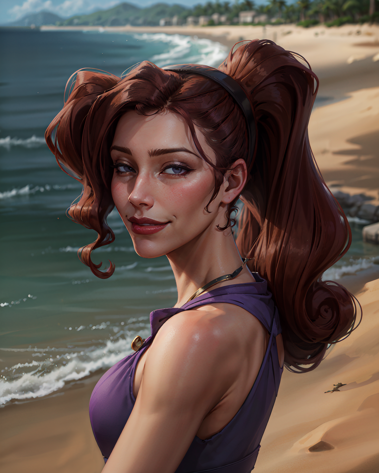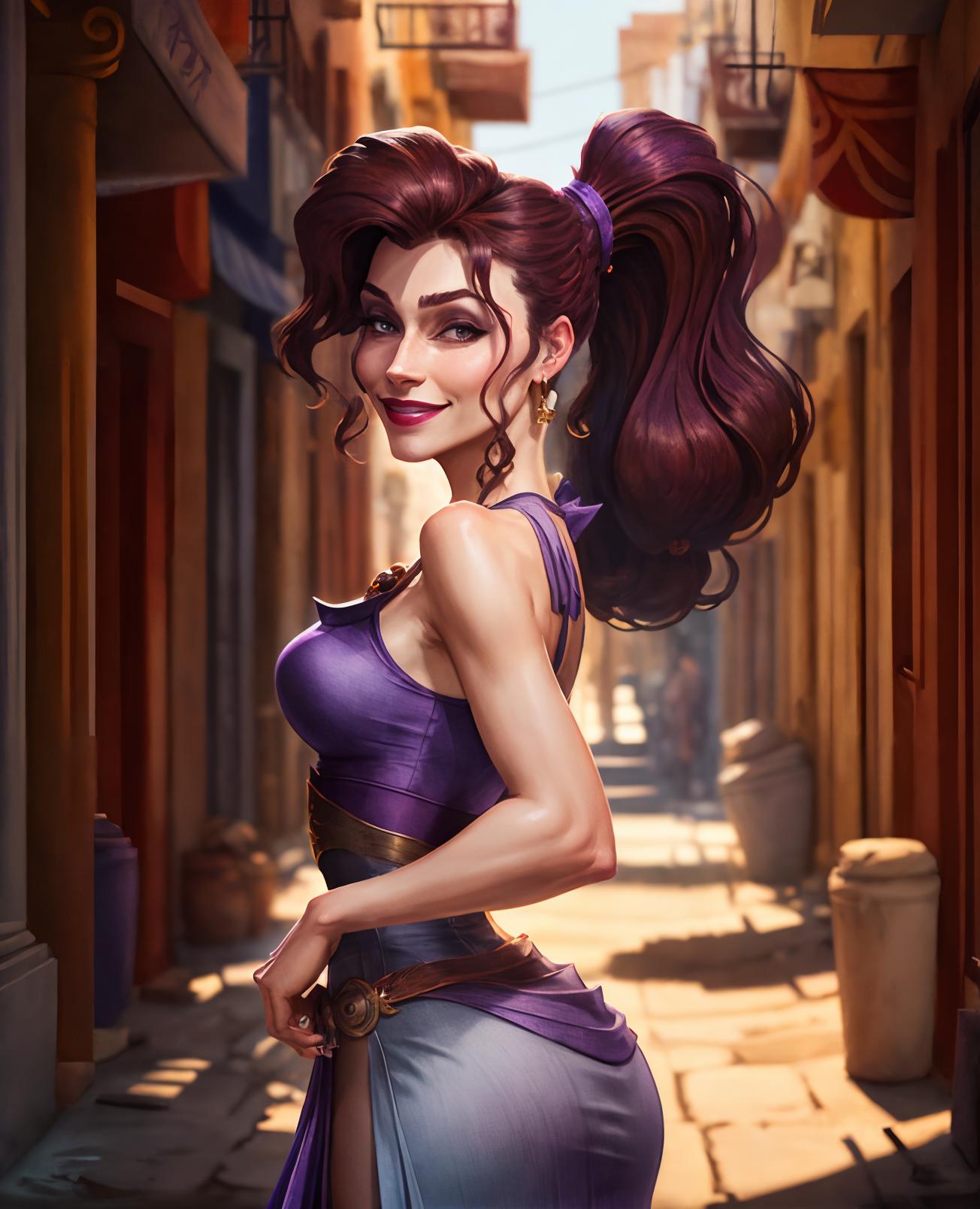 Classic outfit: ponytail, long hair, ???? shoulders, long purple dress