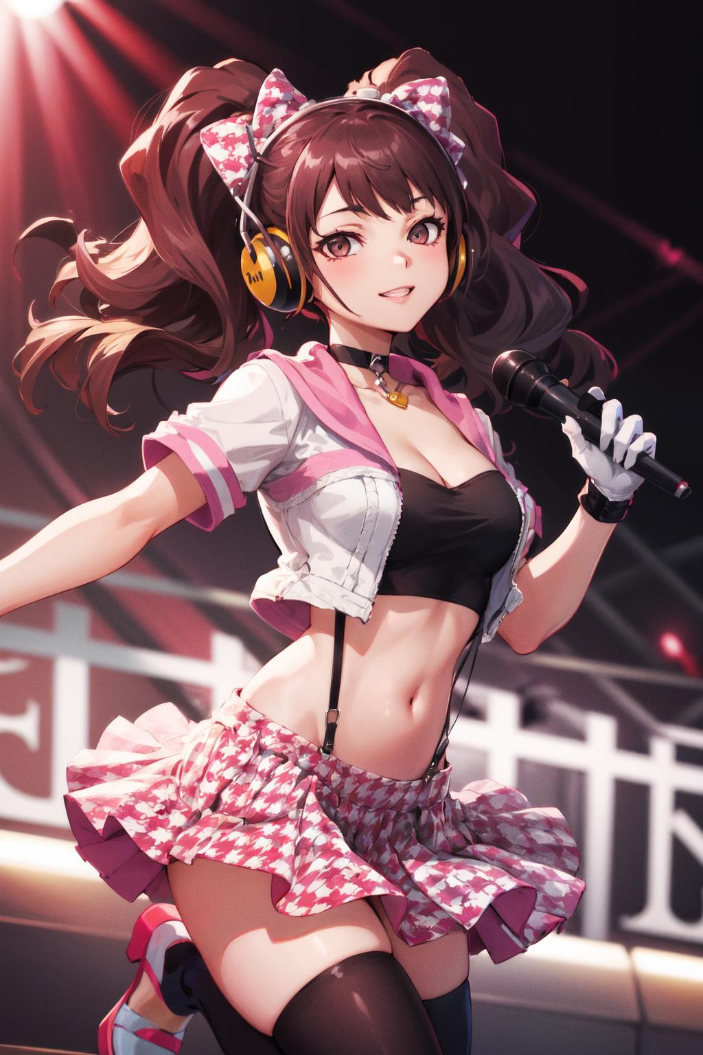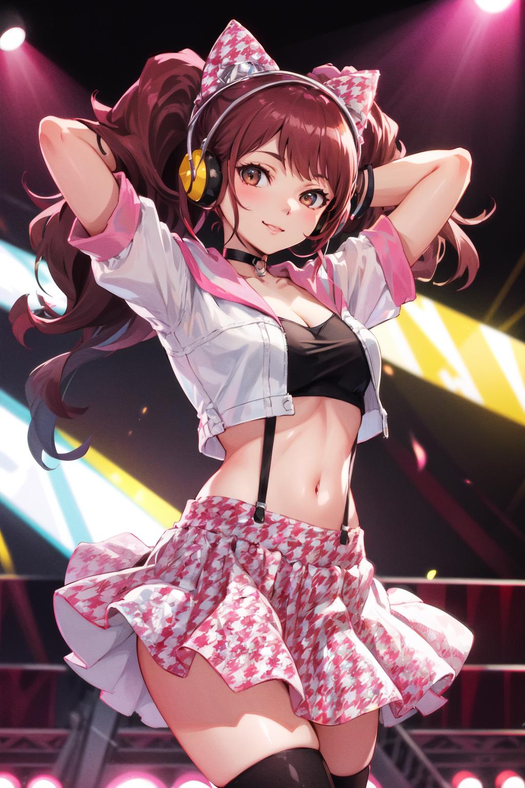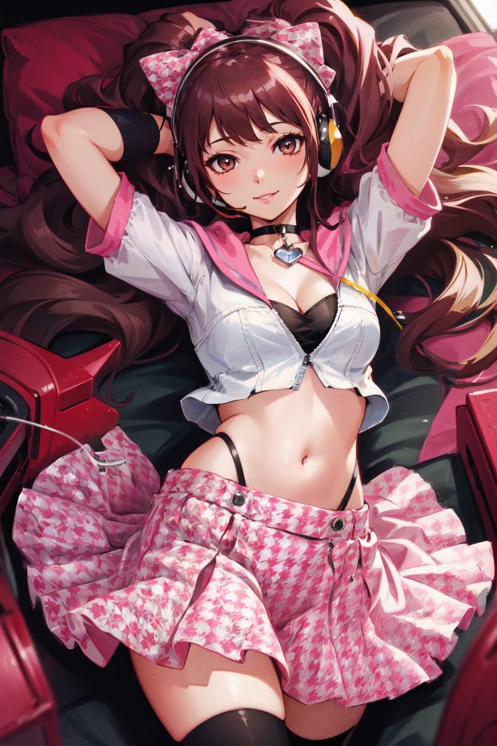 kujikawarise, long hair, ??????????????, twintails, bangs, skirt, black thighhighs, gloves, navel, bow, cleavage, short sleeves, hair bow, choker, midriff, miniskirt, crop top, white top, headphones, suspenders, pink skirt, houndstooth, pink footwear, zettai ryouiki1. สิทธิ์ของโมเดลที่โพสต์ซ้ำเป็นของผู้สร้างต้นฉบับ