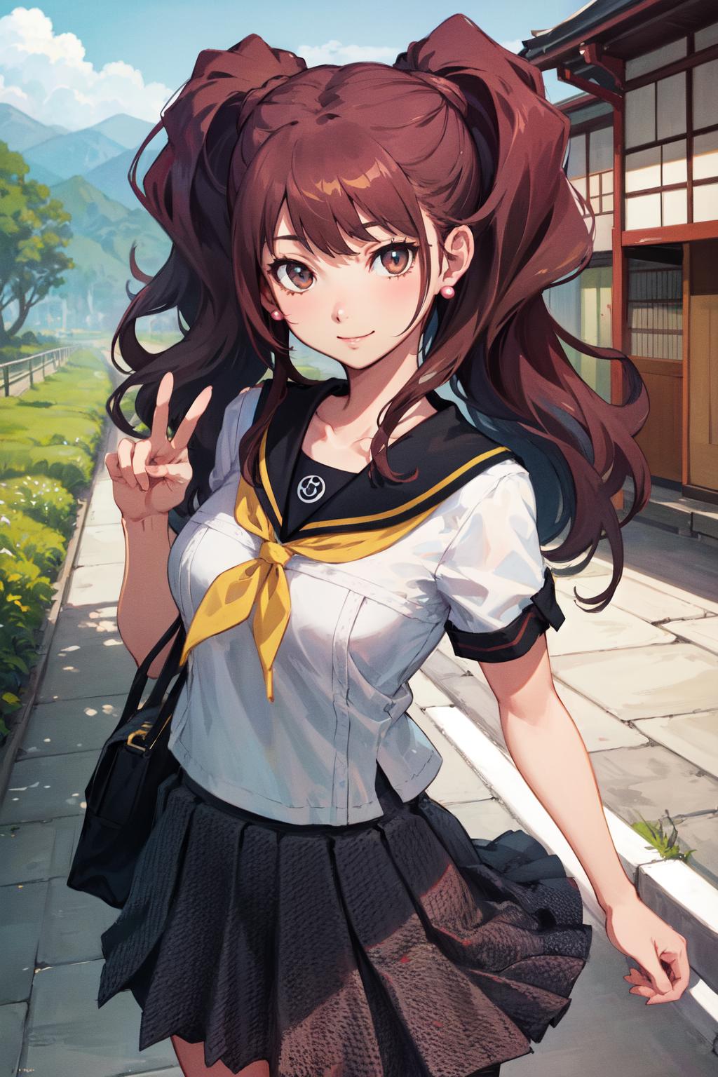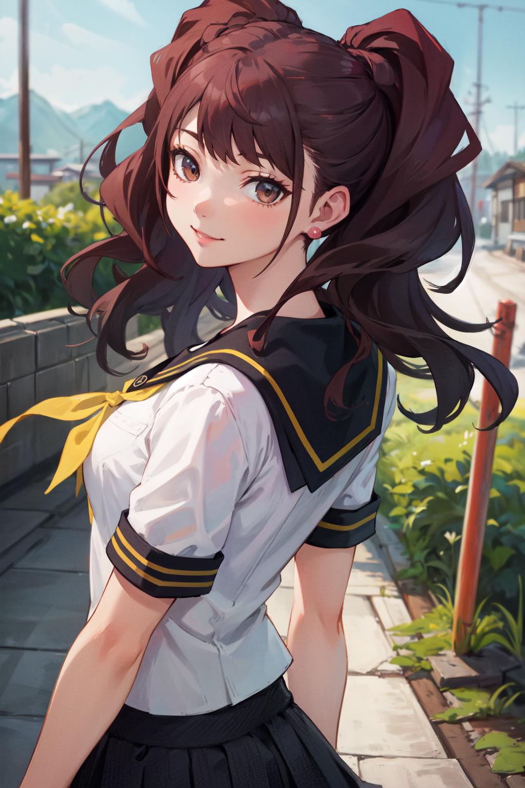 kujikawarise, long hair, ??????????????, twintails, bangs, skirt, long sleeves, jewelry, pantyhose, school uniform, miniskirt, earrings, pleated skirt, black skirt, yellow neckerchief, yasogami school uniform, serafuku **collar,**Summer outfit: