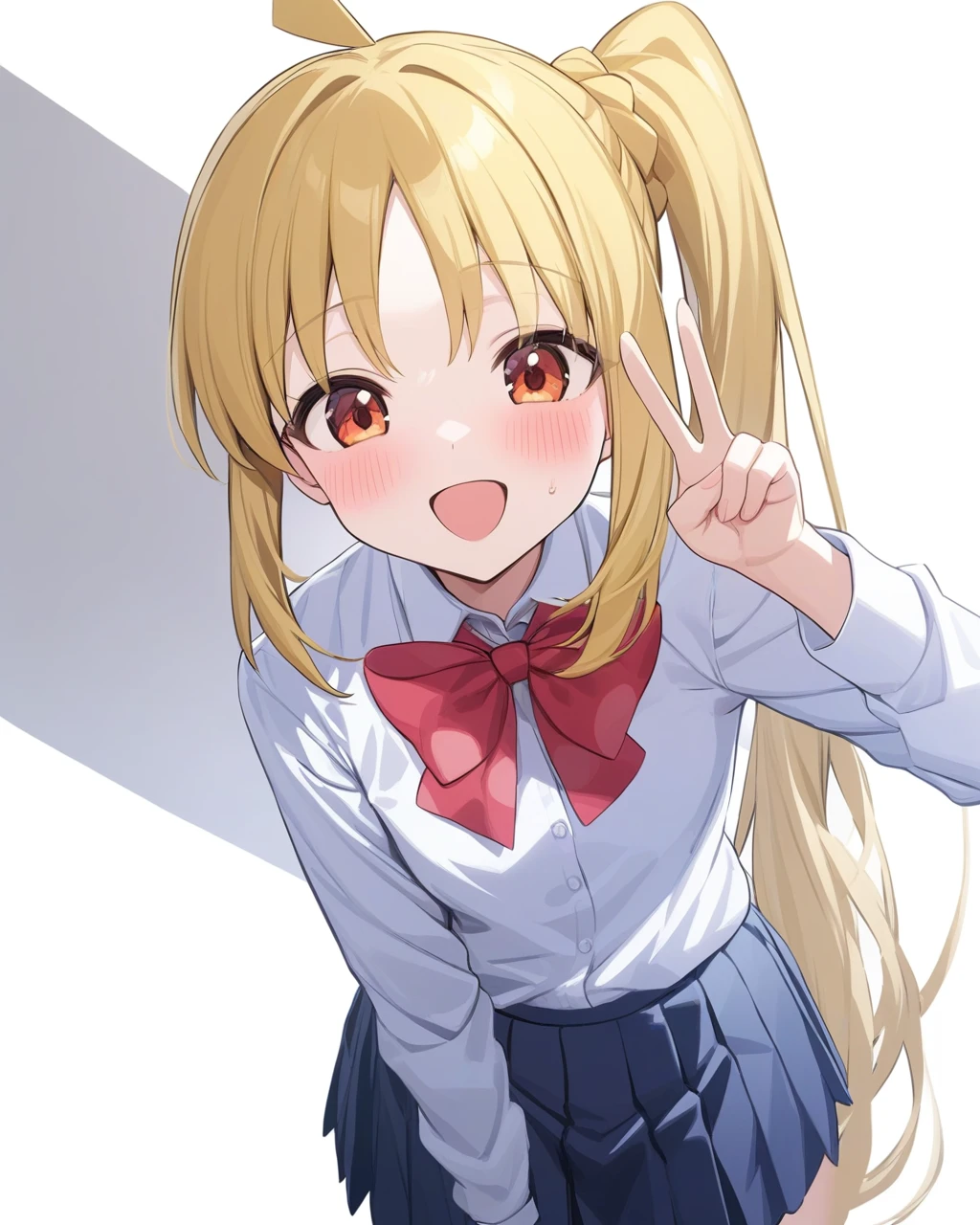 触发词:ijichi_nijika,1girl,shirt,solo,blonde_hair,bow,side_ponytail,red_bow,long_hair,ahoge,collared_shirt,bangs,bowtie,red_eyes,school_uniform,red_bowtie,