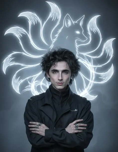 一位银发人物站在柔和的光线中, 一个神秘的九尾狐剪影在他们身后.